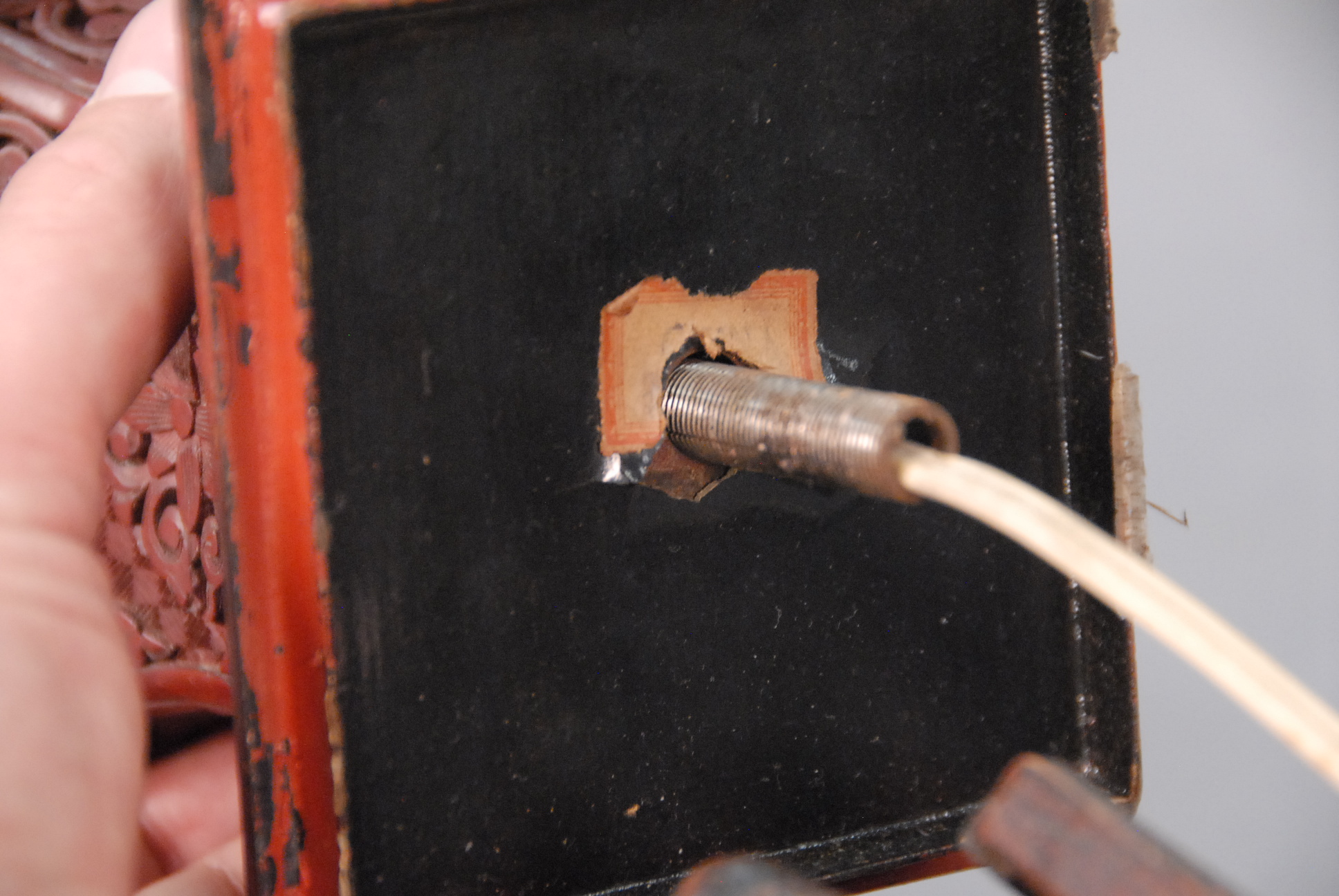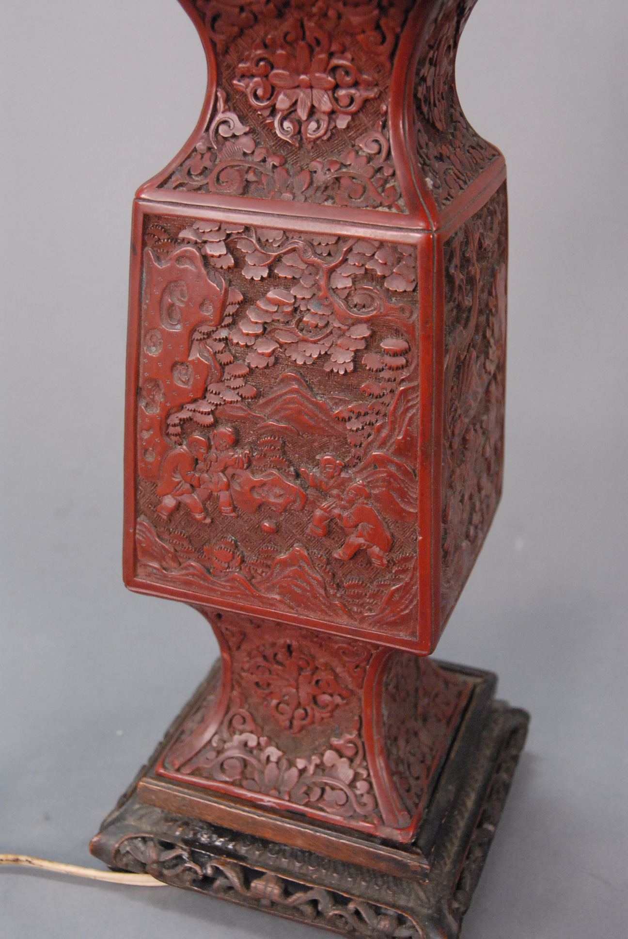 Lot 254: Cinnabar quadrangular beaker vase fitted as a lamp with antique carved wooden base missing section, panels carved with boys in landscape, China, 19th century. ht. 12in.