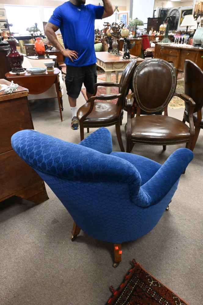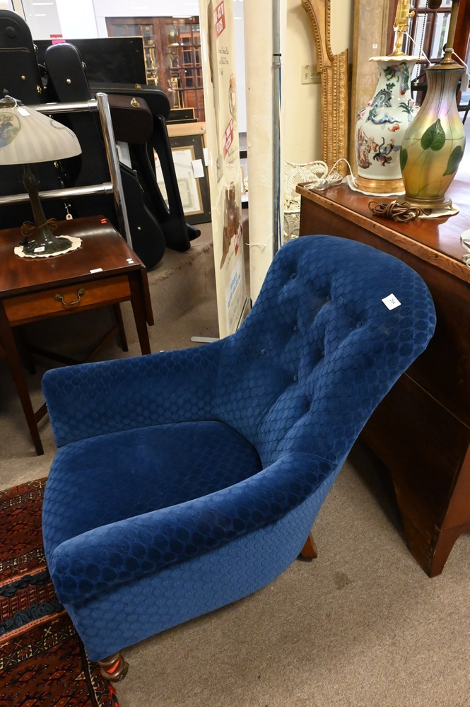 Custom Upholstered Victorian Style Club Chair, attributed to George Smith, height 34 inches, width 29 inches.