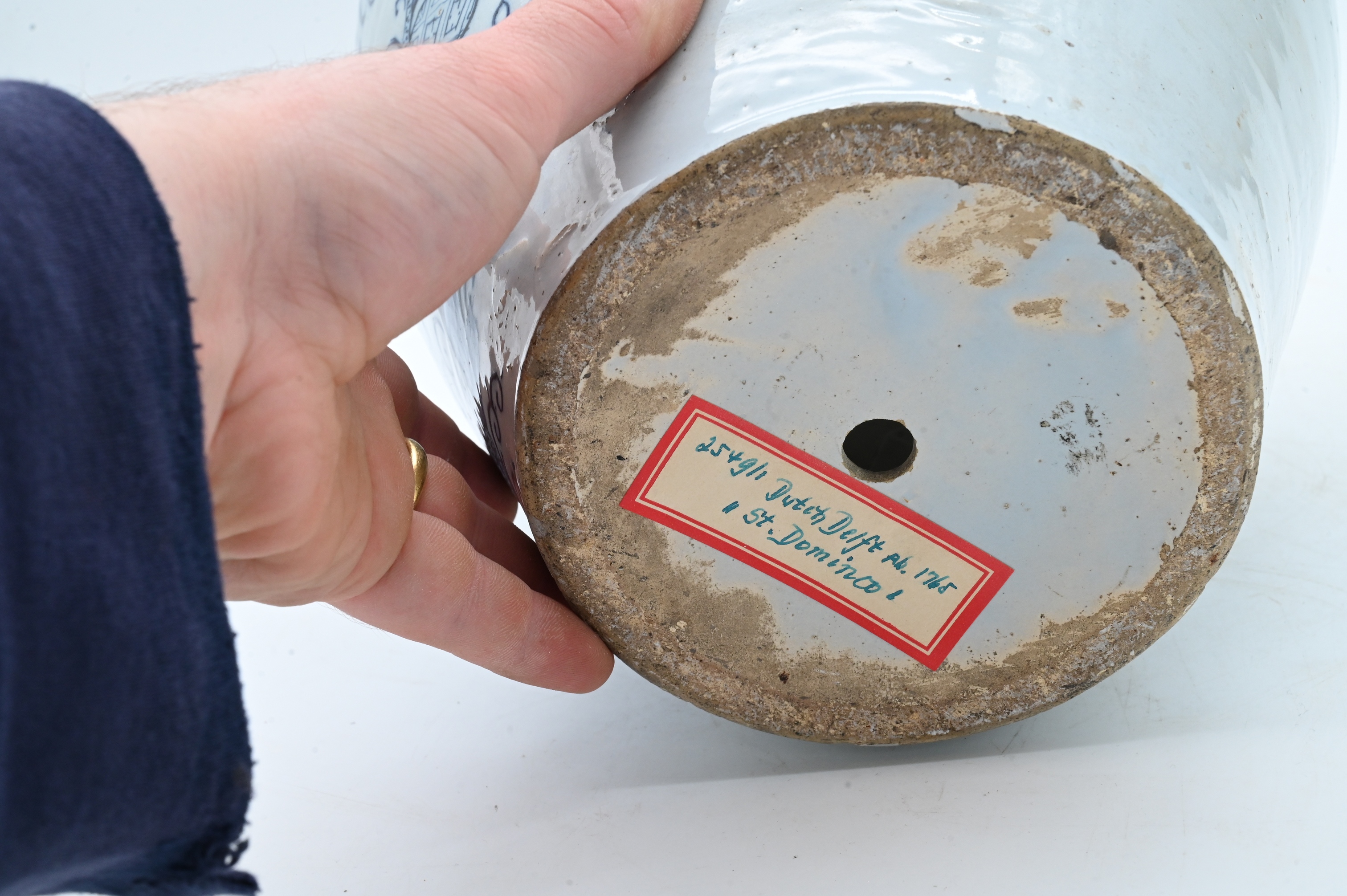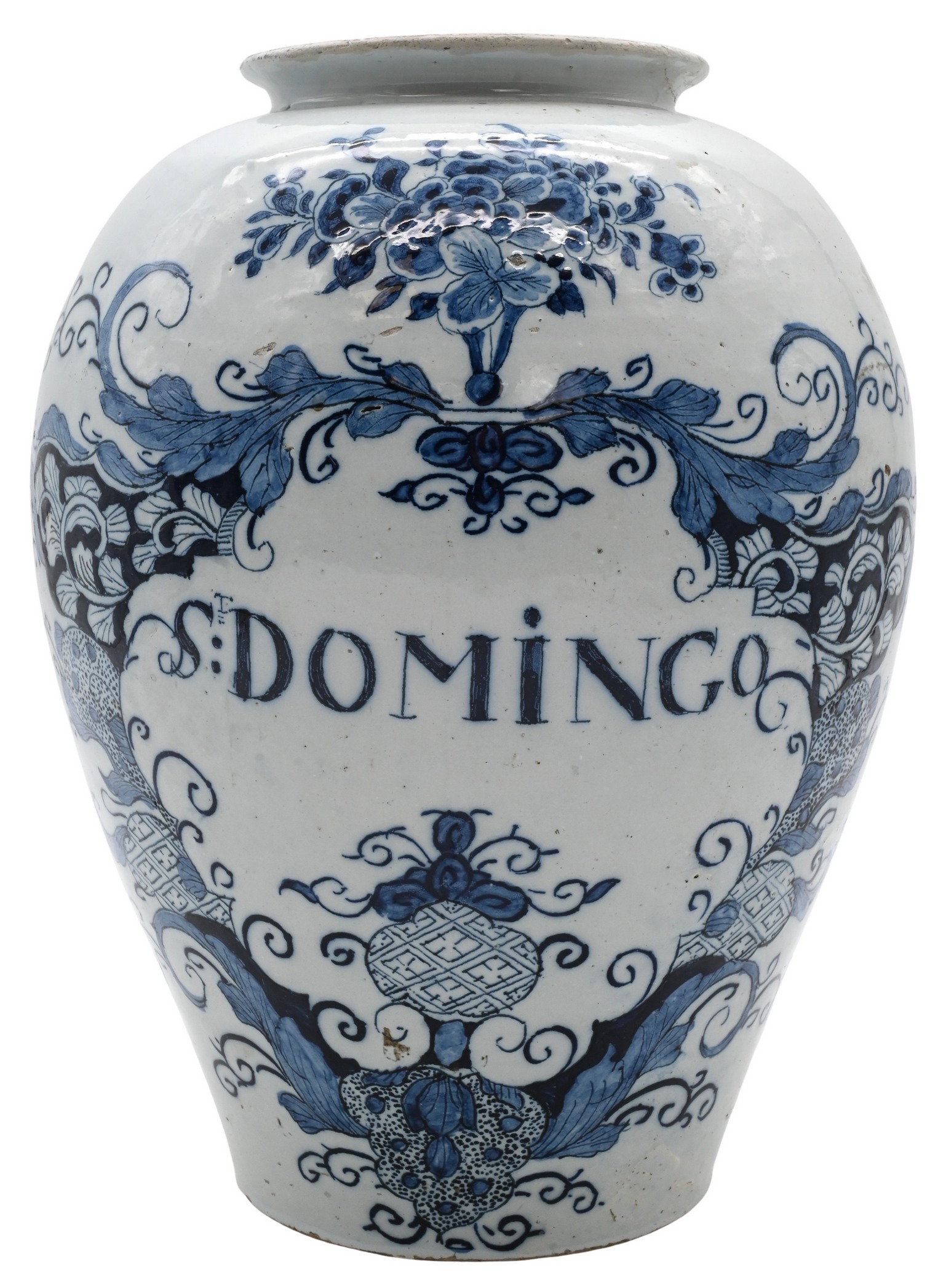 Baluster-form body decorated in underglaze blue and inscribed “St. Domingo” within a scrolling foliate cartouche surmounted by a basket of flowers,drilled bottom likely once marked “BP” for De Blompot
