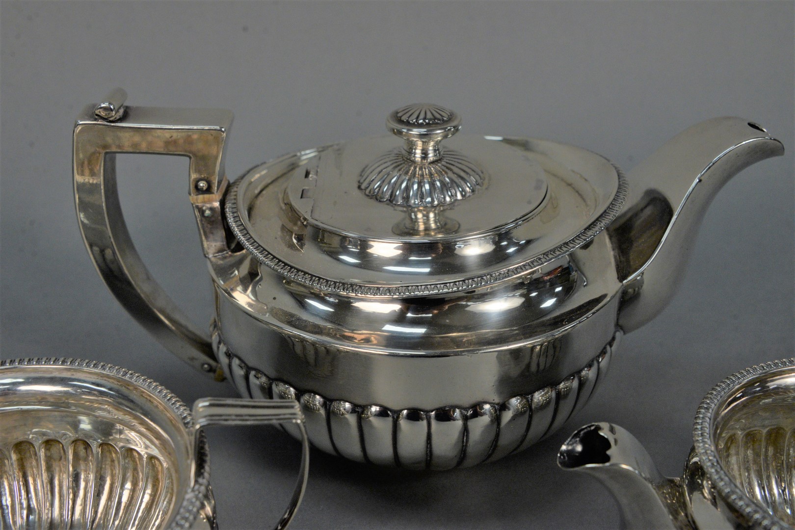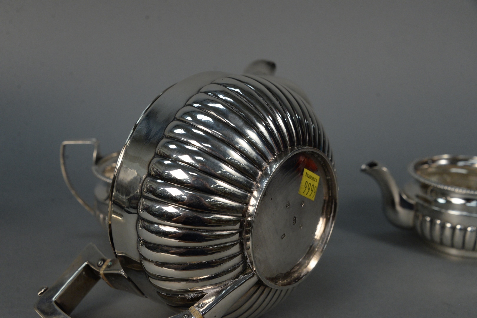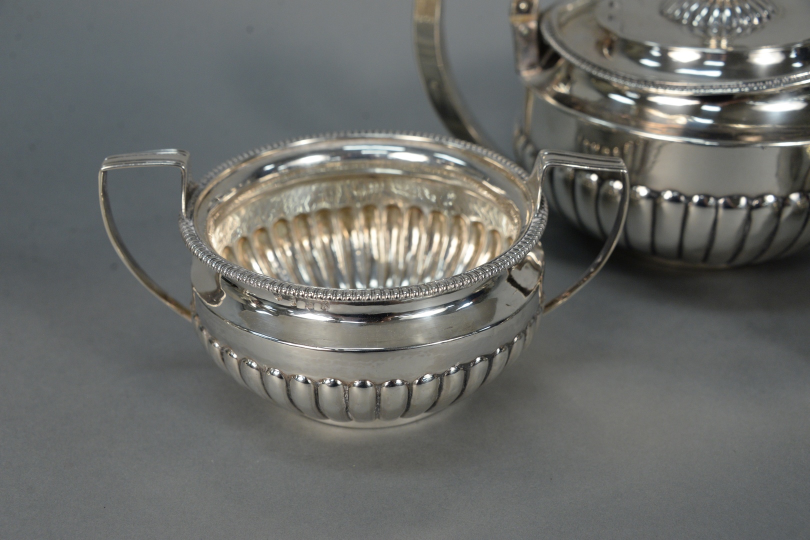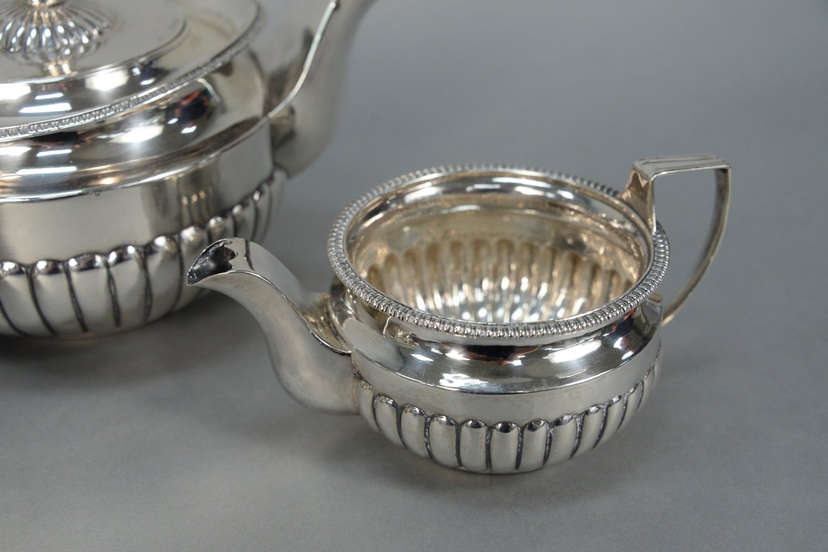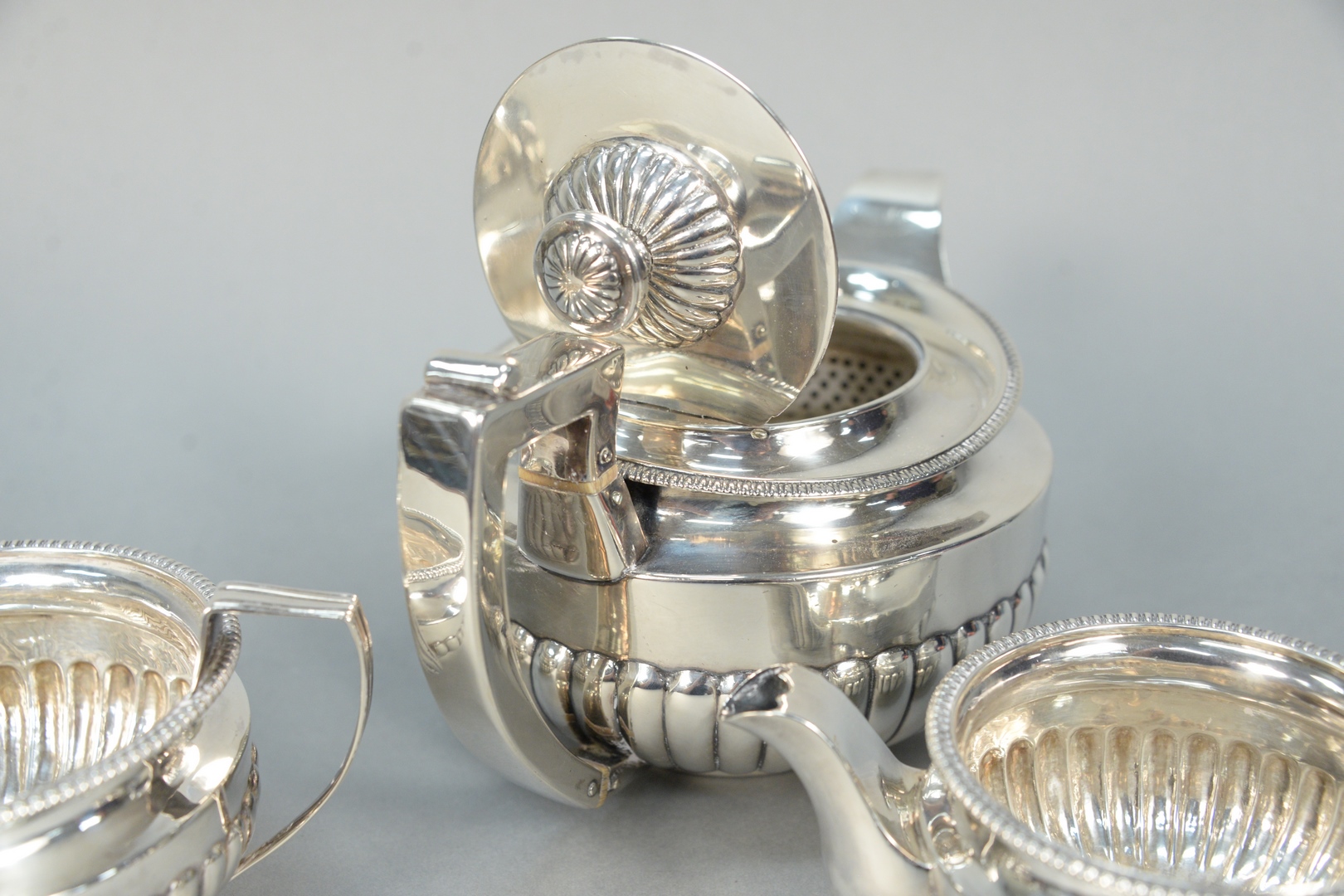 Lot 254: English Silver Three-piece Tea Set teapot, sugar, and creamer marked with R.W., in an oval on bottom teapot height 5 1/2 inches 46.9…