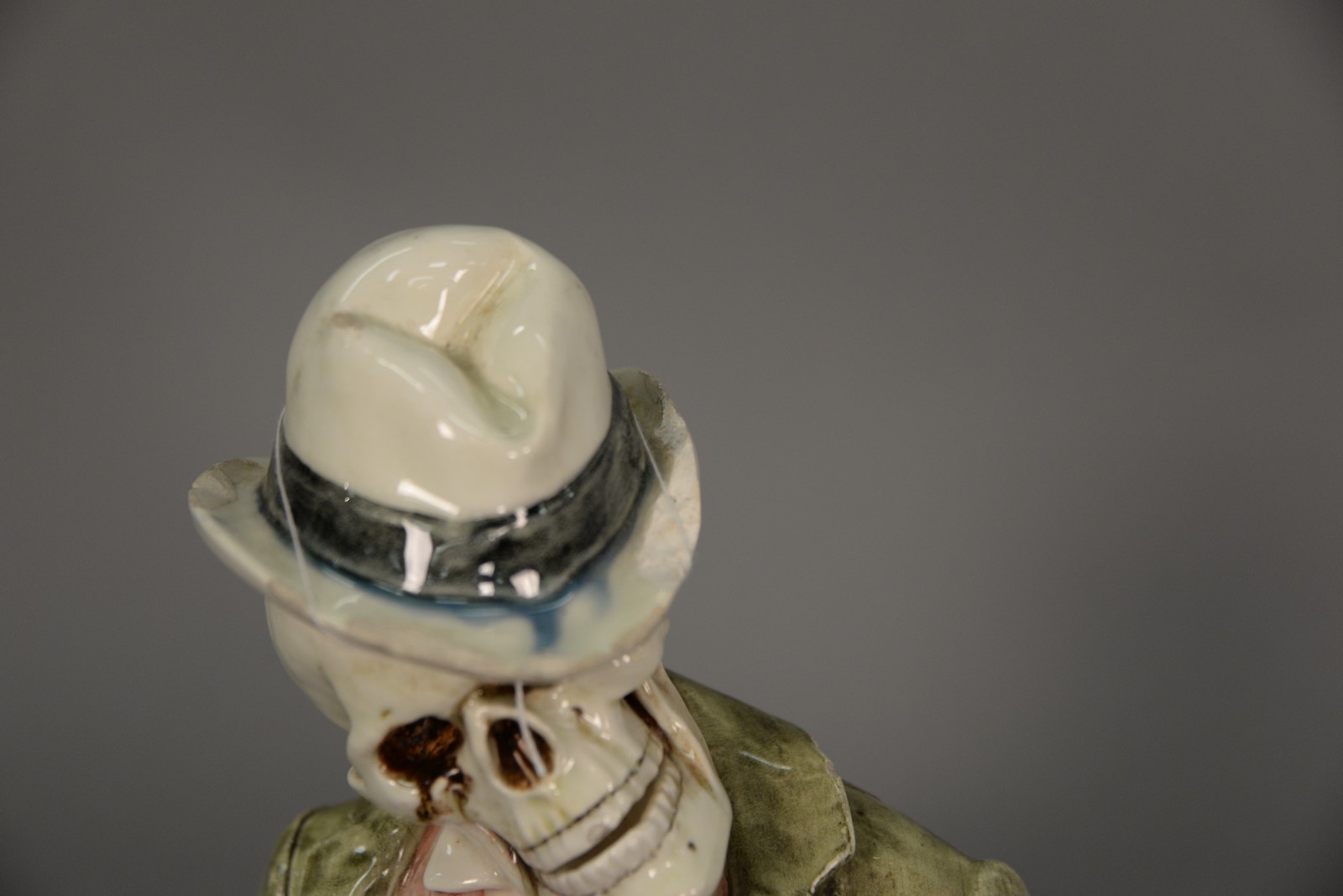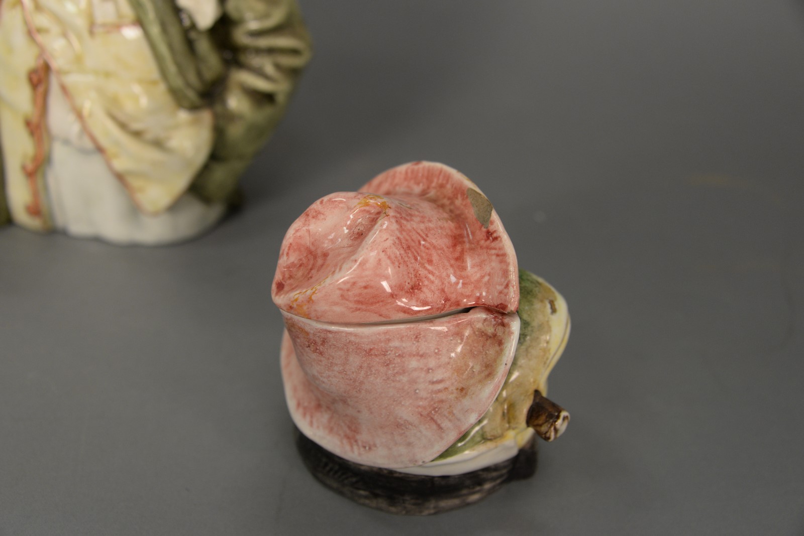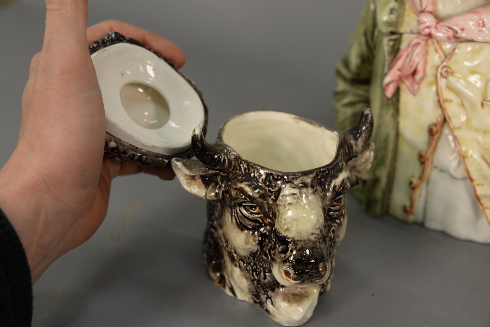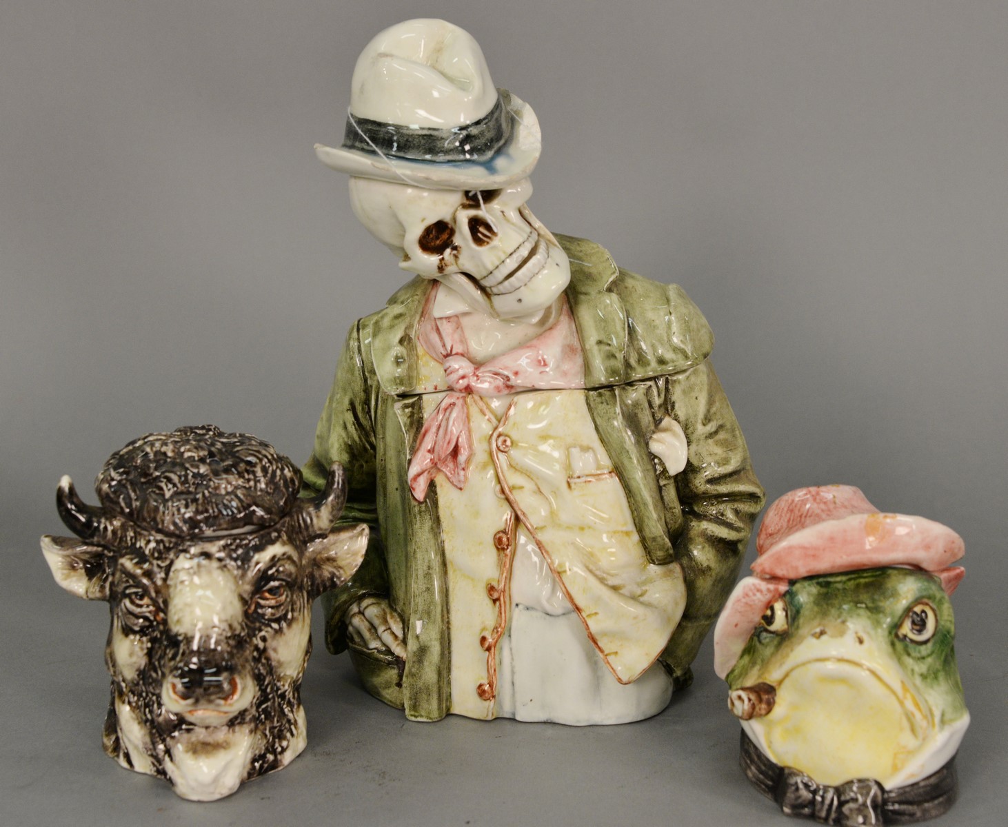 Four ceramic covered pieces including three majolica jars one half body skeleton cookie jar, buffalo head humidor, and frog head jar along with Hamlet tea pot. cookie jar: ht. 11 in., humidor: ht. 5 in., frog: ht. 4 in., and tea pot: ht. 10 3/4 in.