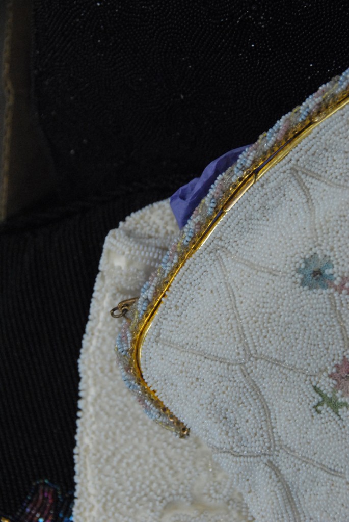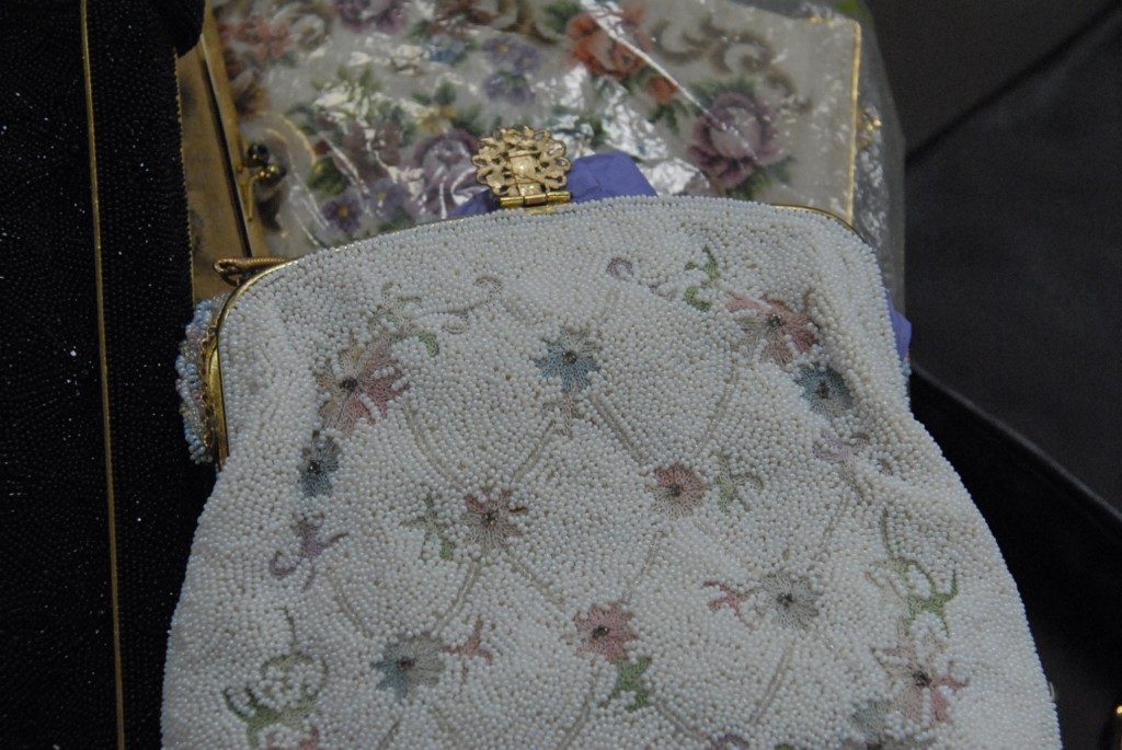 Group of seven beaded and tapestry clutch purses including a Walburg purse.