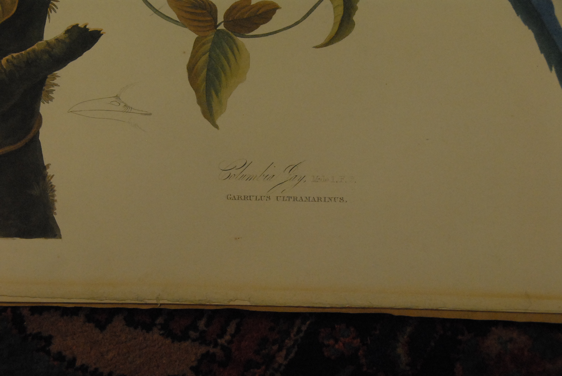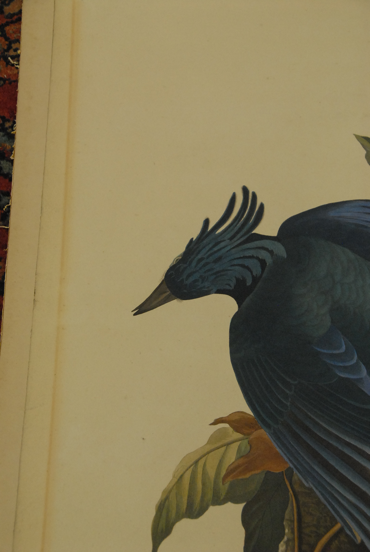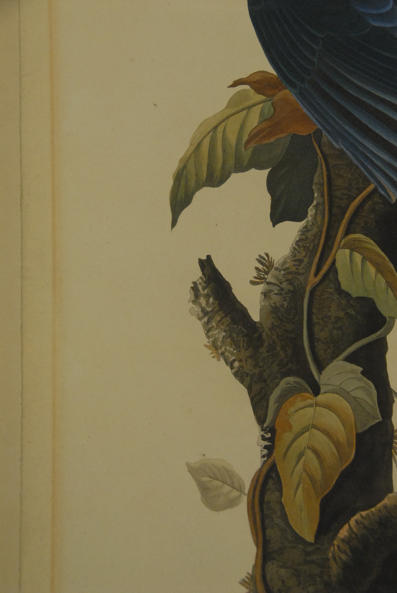 John James Audubon 1785-1851 COLUMBIA JAY Garrulus Ultramarinus Plate 96 No. 90 hand colored engraving mounted on board marked lower left: Drawn from nature and published by John J. Audubon F.R.S.’s L&E F.L.S. &c marked lower right: Engraved, printed, and coloured by R. Havell Jun London 1830 Kennedy Gallery New York label on verso #34352: Columbia Jay colored Aquatint engraving by R. Havell after the painting by J. J. Audubon. From the first edition, Elephant Folio of Audubon’s Birds of America minor border staining, two small repaired tears 39 7/8 x 26 1/2