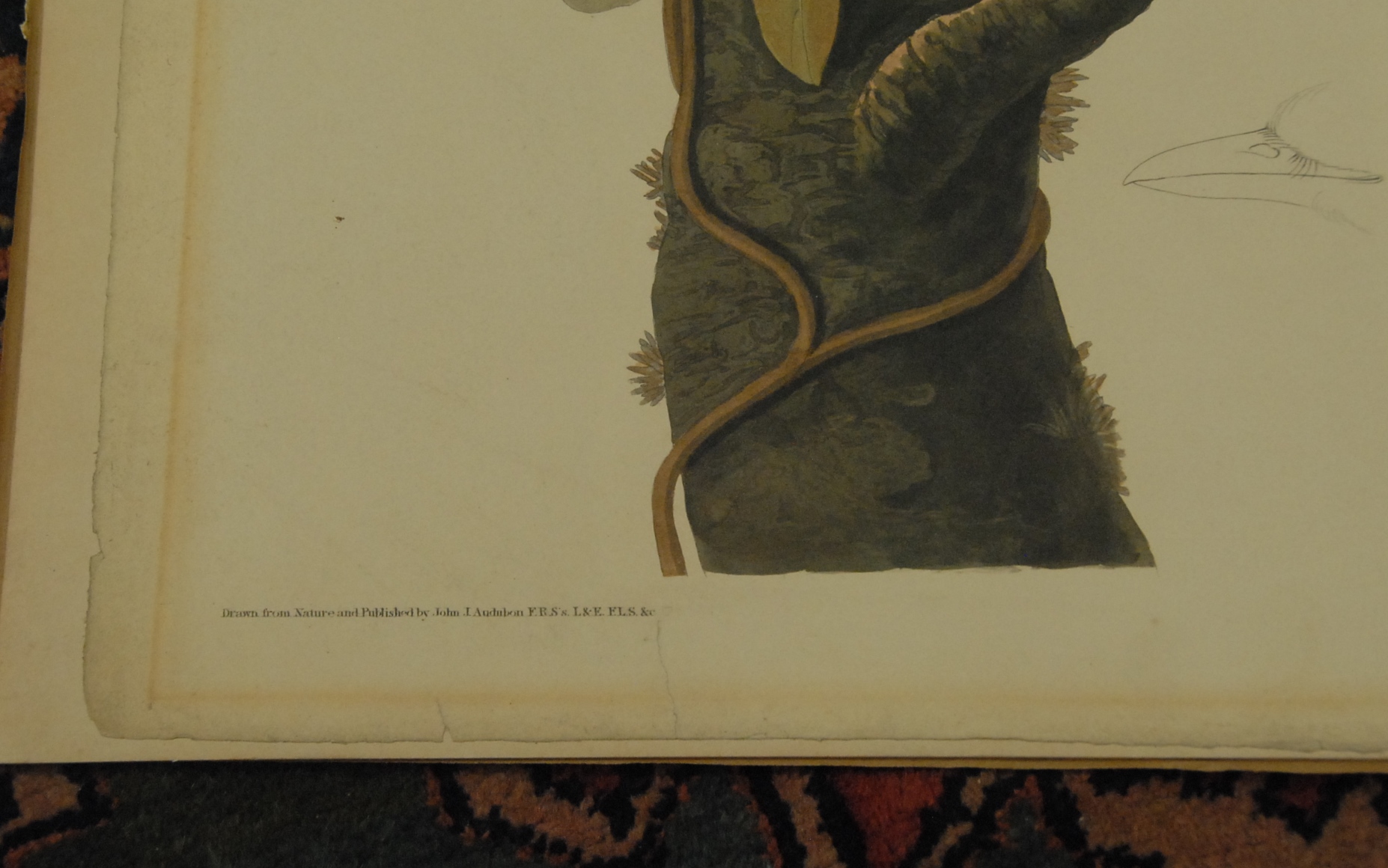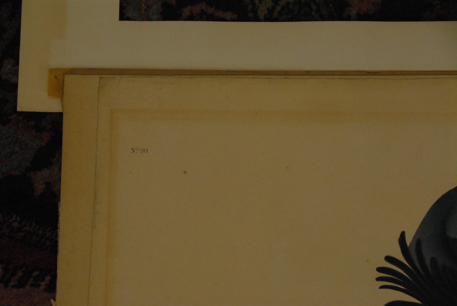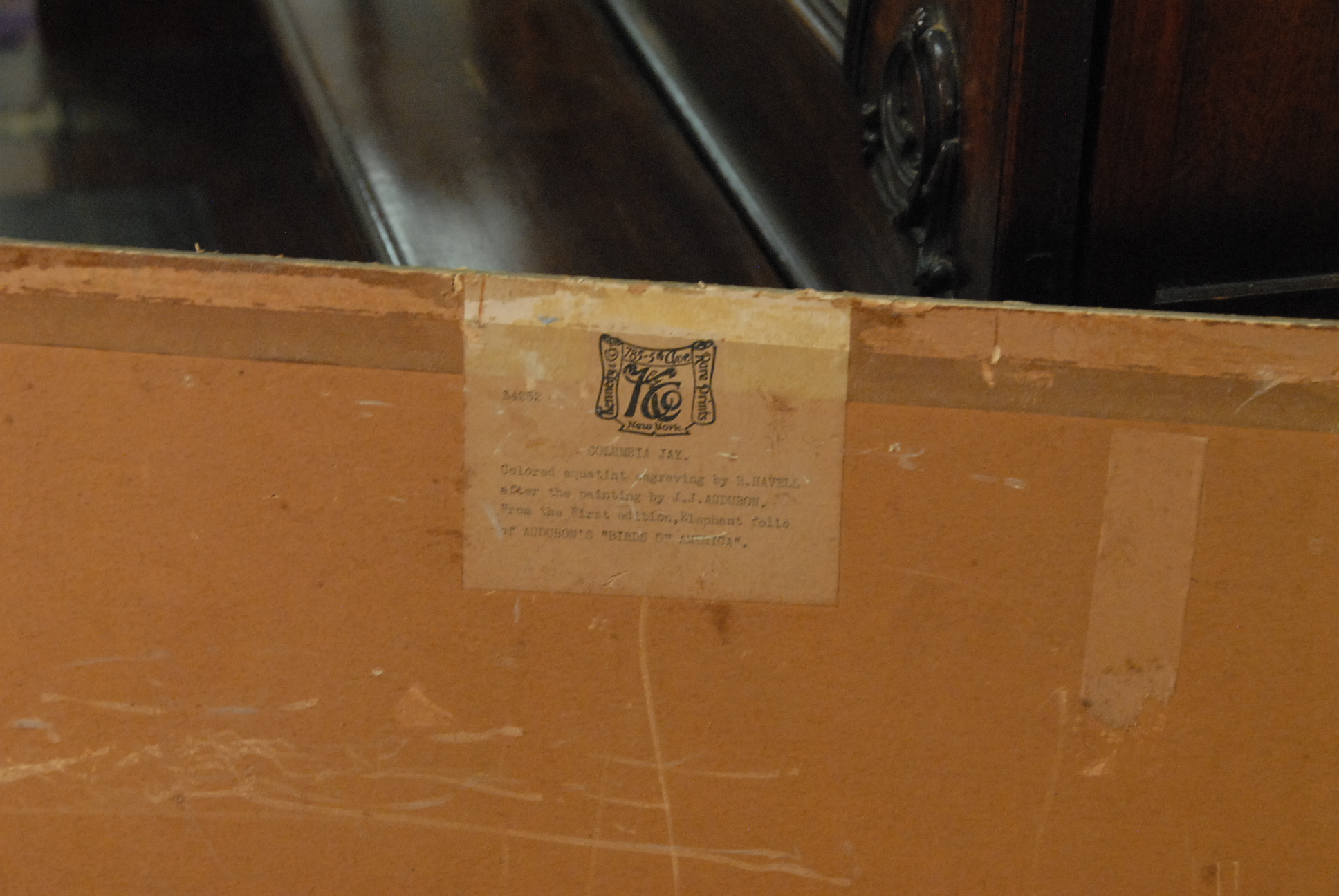 John James Audubon 1785-1851 COLUMBIA JAY Garrulus Ultramarinus Plate 96 No. 90 hand colored engraving mounted on board marked lower left: Drawn from nature and published by John J. Audubon F.R.S.’s L&E F.L.S. &c marked lower right: Engraved, printed, and coloured by R. Havell Jun London 1830 Kennedy Gallery New York label on verso #34352: Columbia Jay colored Aquatint engraving by R. Havell after the painting by J. J. Audubon. From the first edition, Elephant Folio of Audubon’s Birds of America minor border staining, two small repaired tears 39 7/8 x 26 1/2