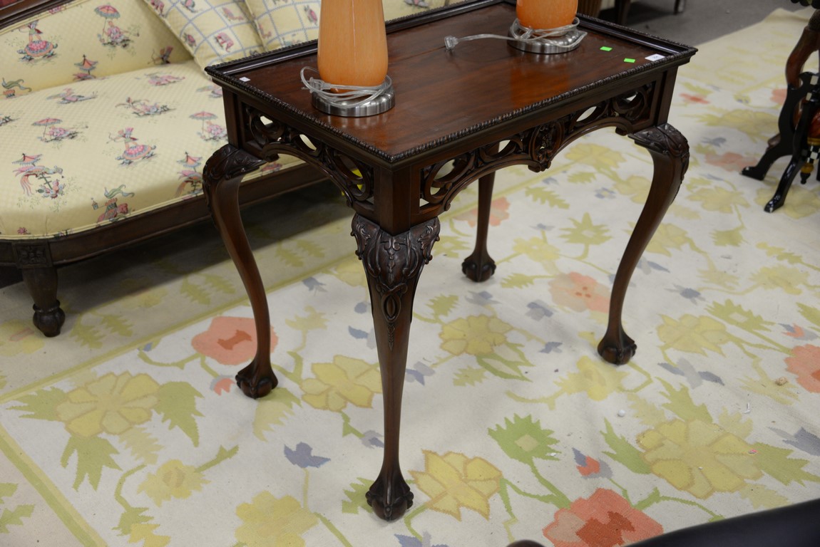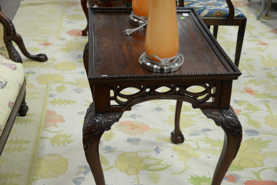 Mahogany Chippendale style table top has cracks. ht. 31 in. top: 21 1/2 x 32 1/2