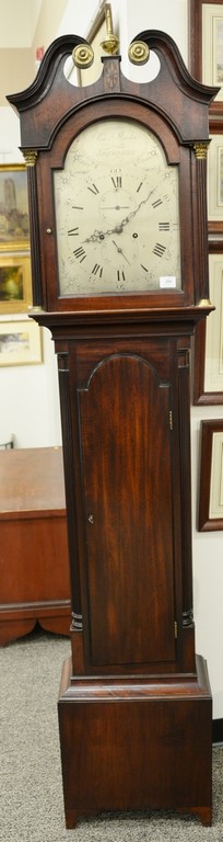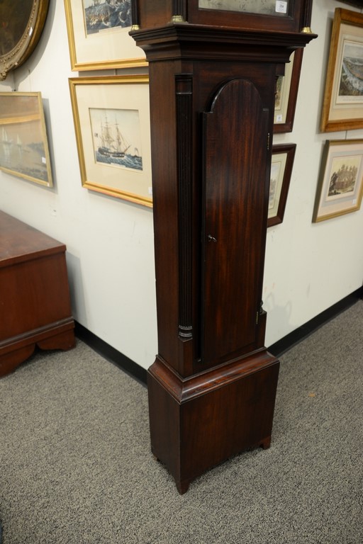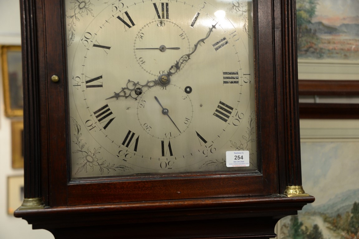 Lot 254: Mahogany tall case clock with pediment top mounted with brass tombstone metal dial having second hand and calendar hand, flanked by …