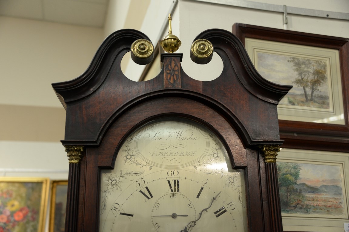 Mahogany tall case clock with pediment top mounted with brass tombstone metal dial having second hand and calendar hand, flanked by columns with brass capitals, dial marked Sim & Warden Aberdeen. ht. 86 1/2in.