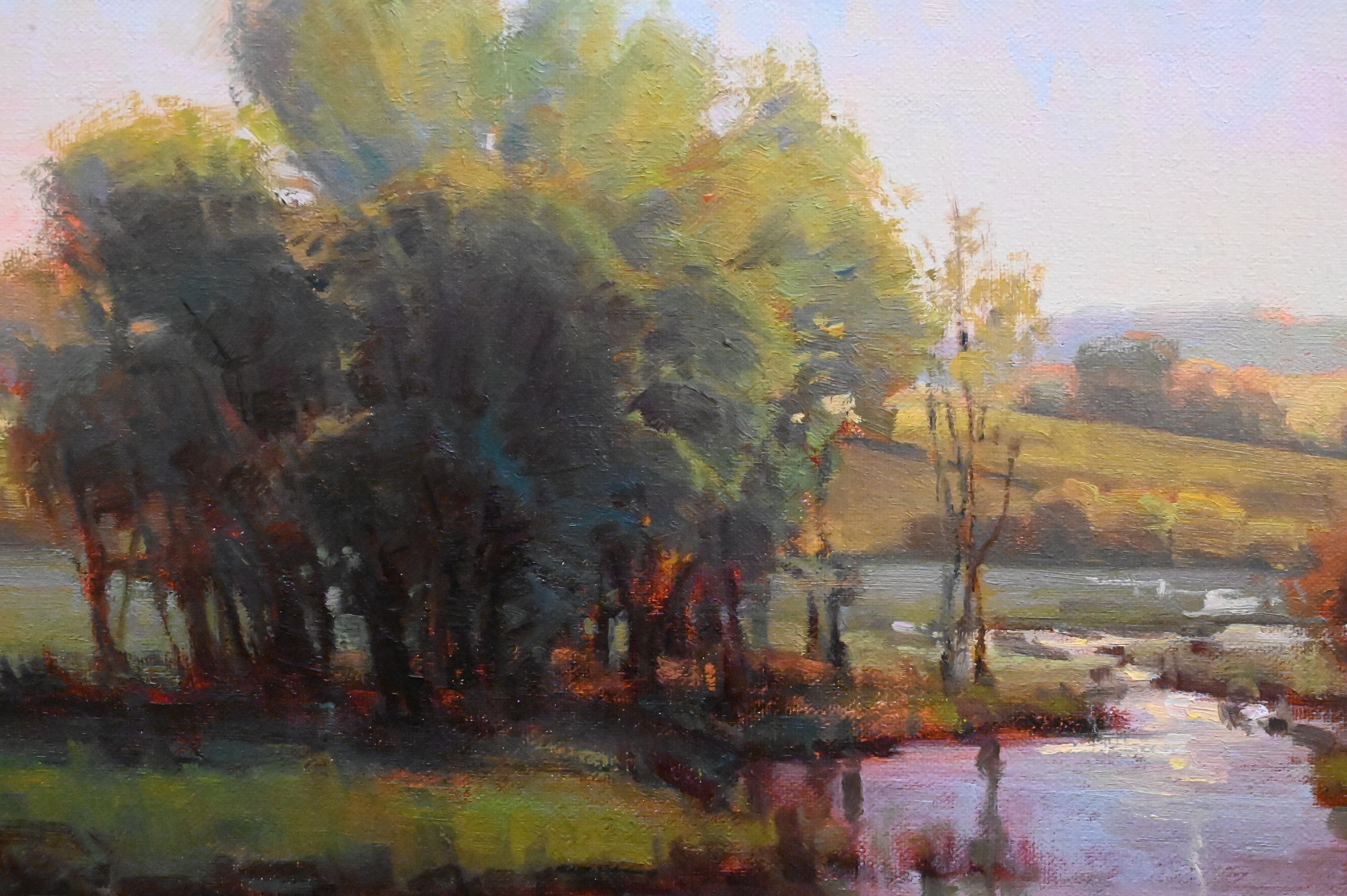 Tranquil impressionistic landscape with muted tones focusing on a body of water flowing past a cluster of trees with rolling hills in the distance