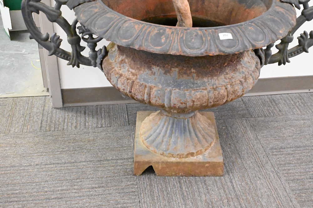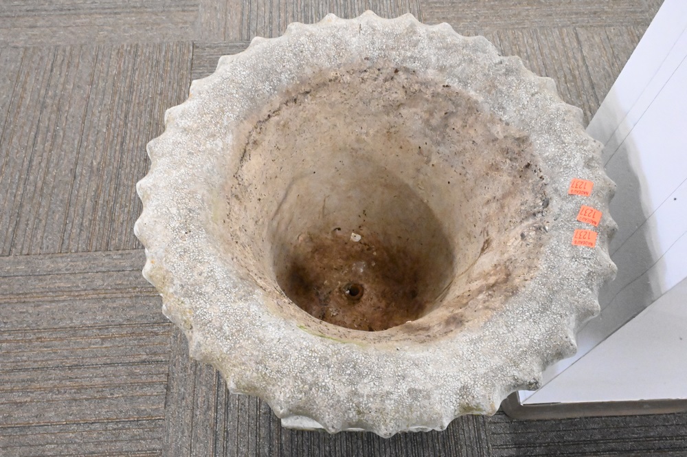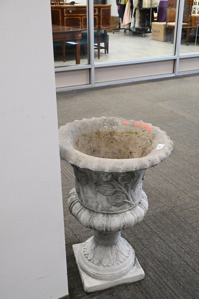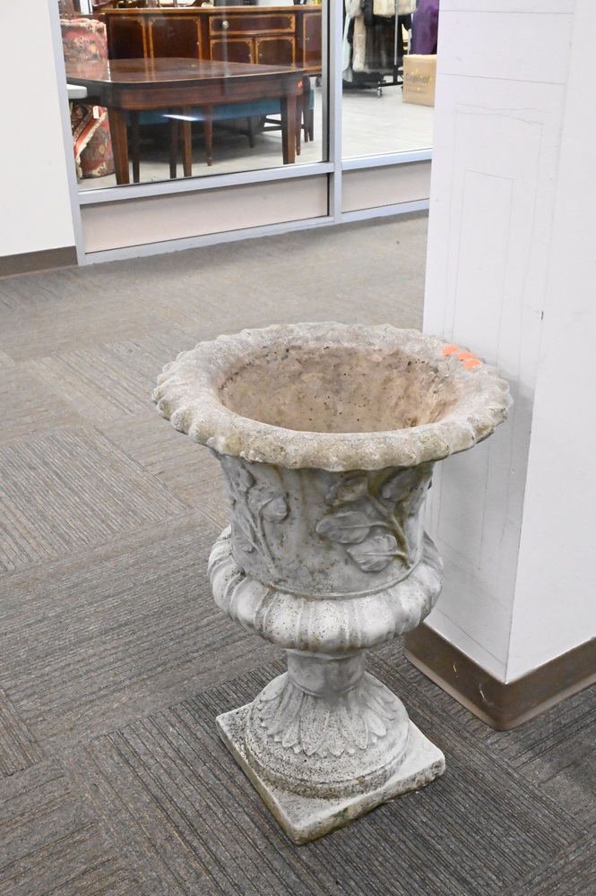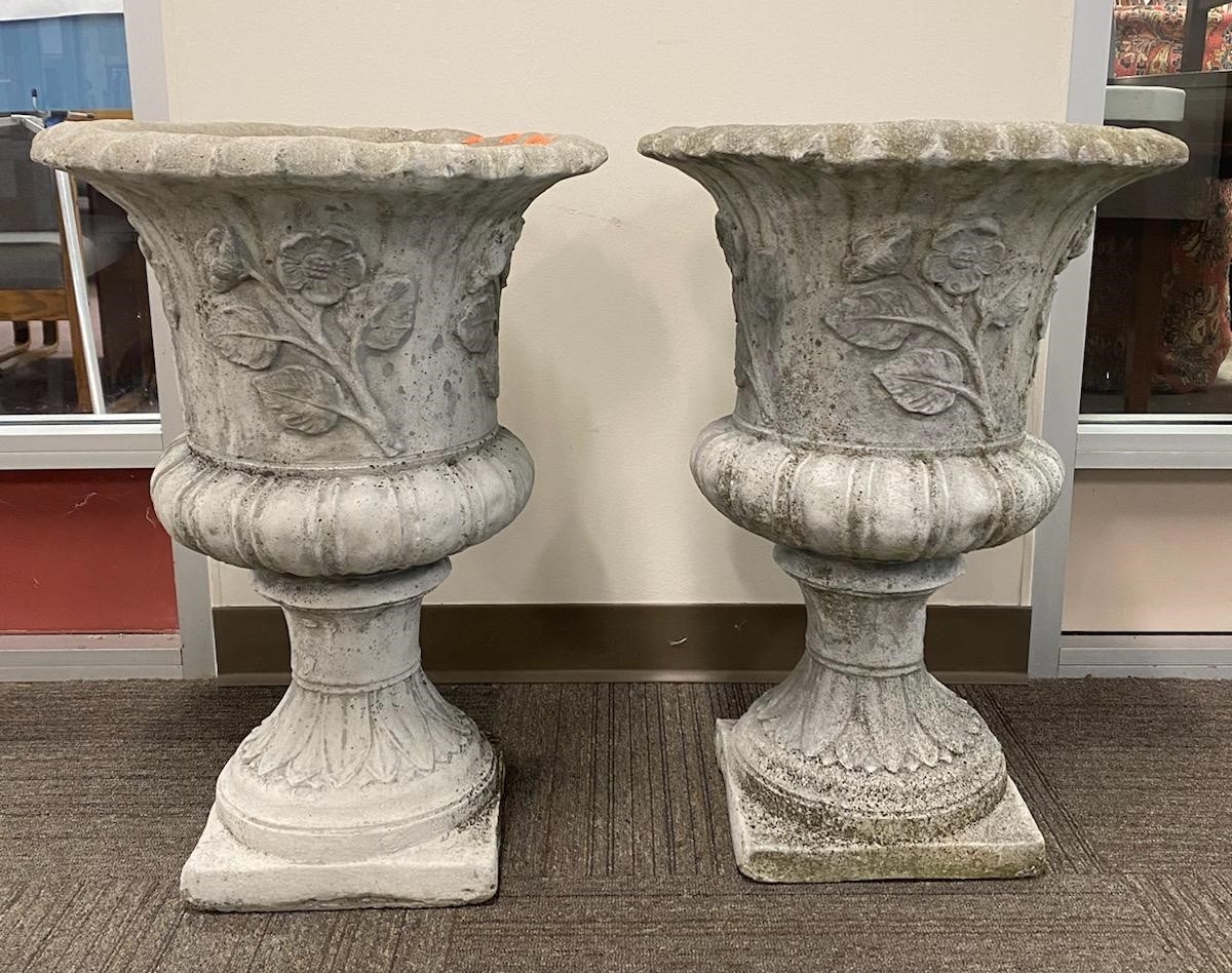Pair of Cement Urns, height 27 inches, total diameter 19 inches.