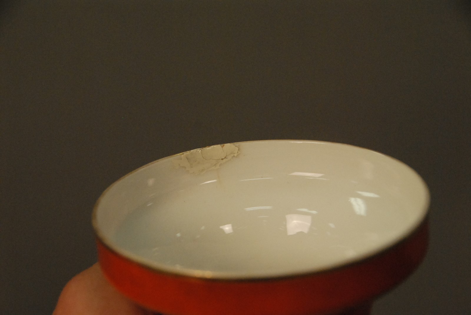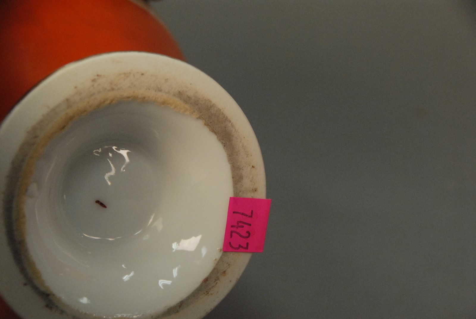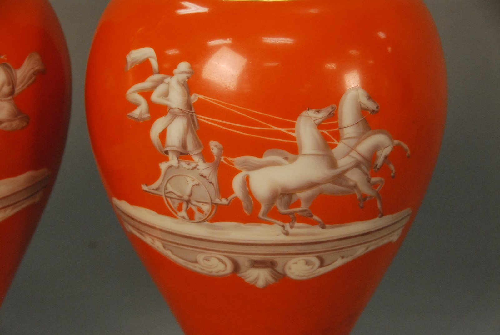 Lot 254: Pair of porcelain vases, orange bodies with painted horse drawn chariots, English or French one small repair at top. ht. 13 1/2 in.