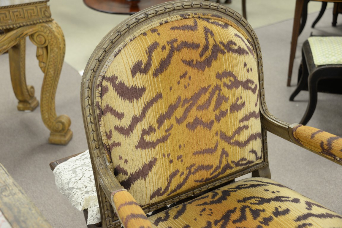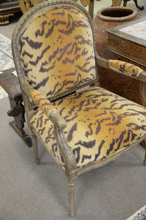 Lot 254: Set of four Henredon Louis XVI style armchairs Desert Finish upholstery having Henredon Upholstery Collection tag on bottom.