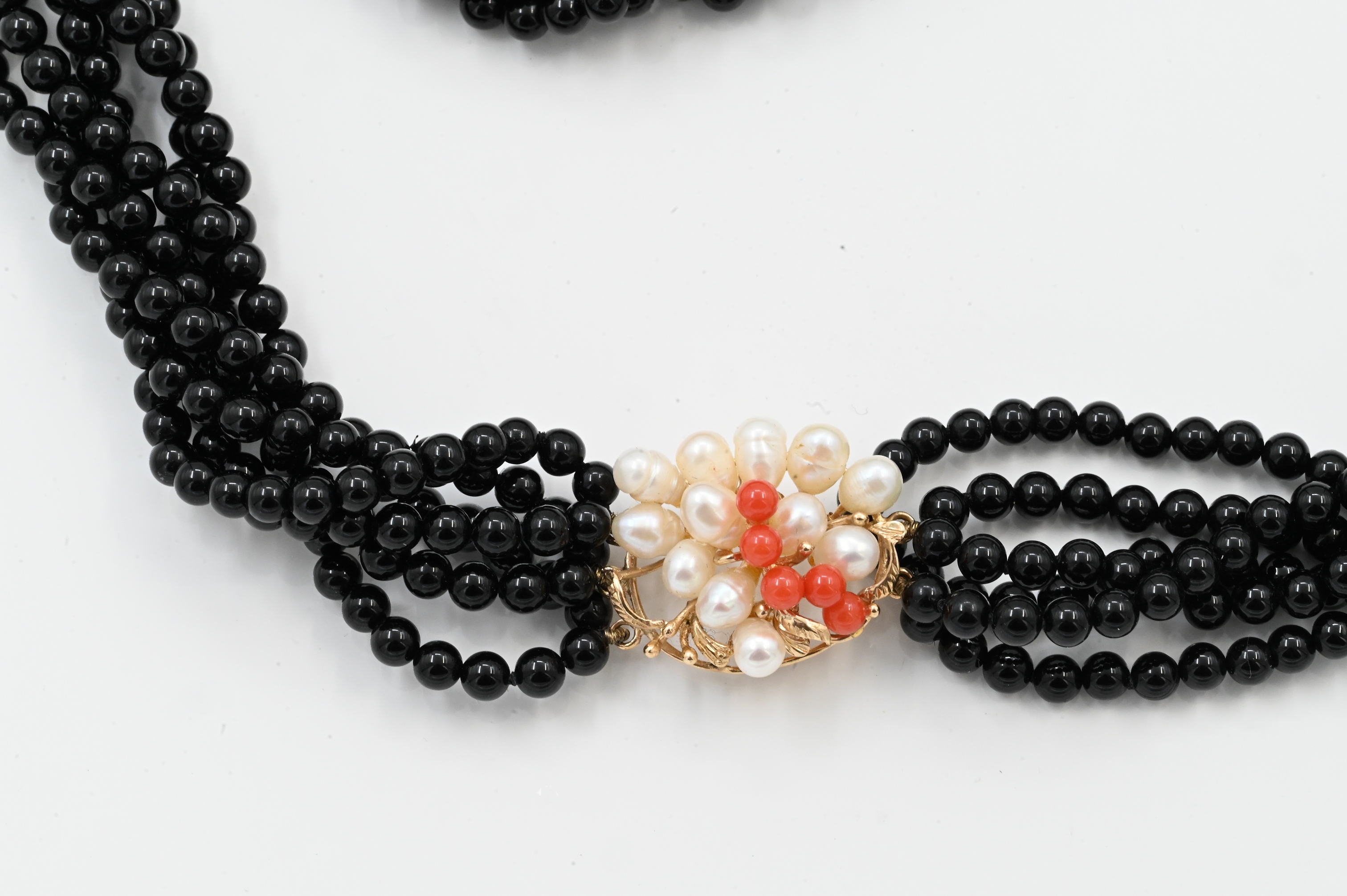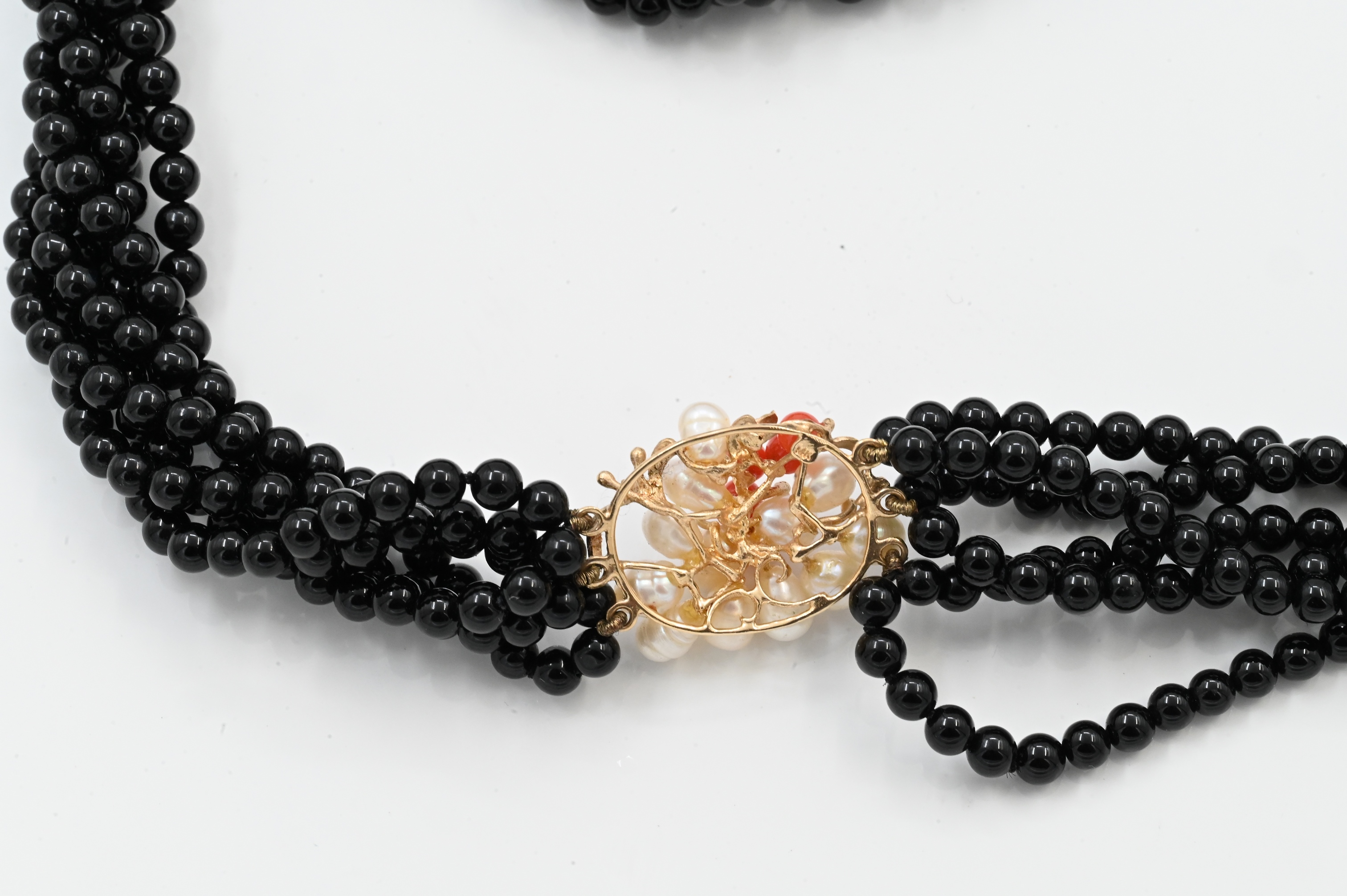 Six Strand Onyx, Pearl, and Gold Necklace