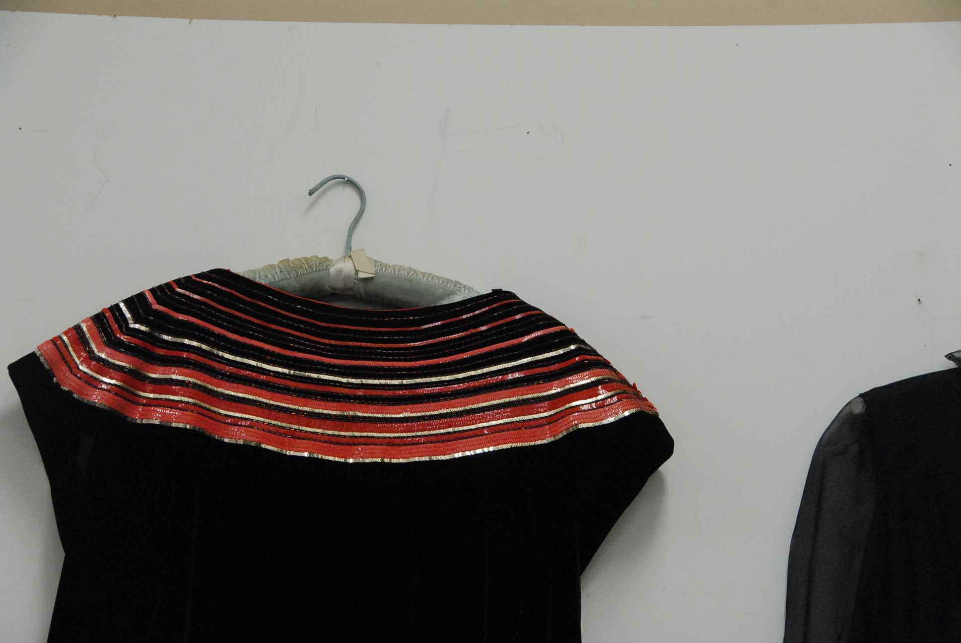 Lot 254: Two piece lot black velvet evening gown with layered sequined collar and silk ruffled evening gown.
