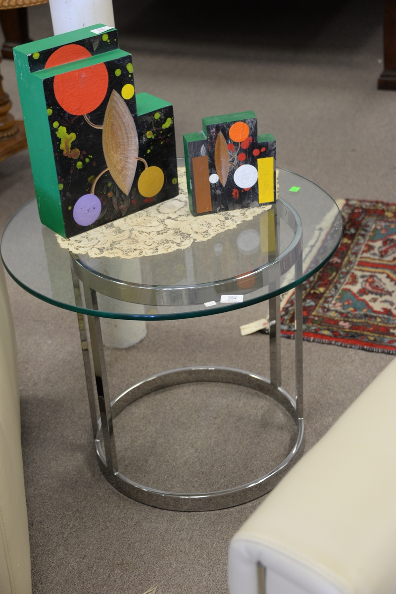Lot 254: Two piece lot to include Milo Baughman style table. ht. 28 1/2 in., dia. 26in. and modern chrome and glass plinthe. ht. 34in., top: …