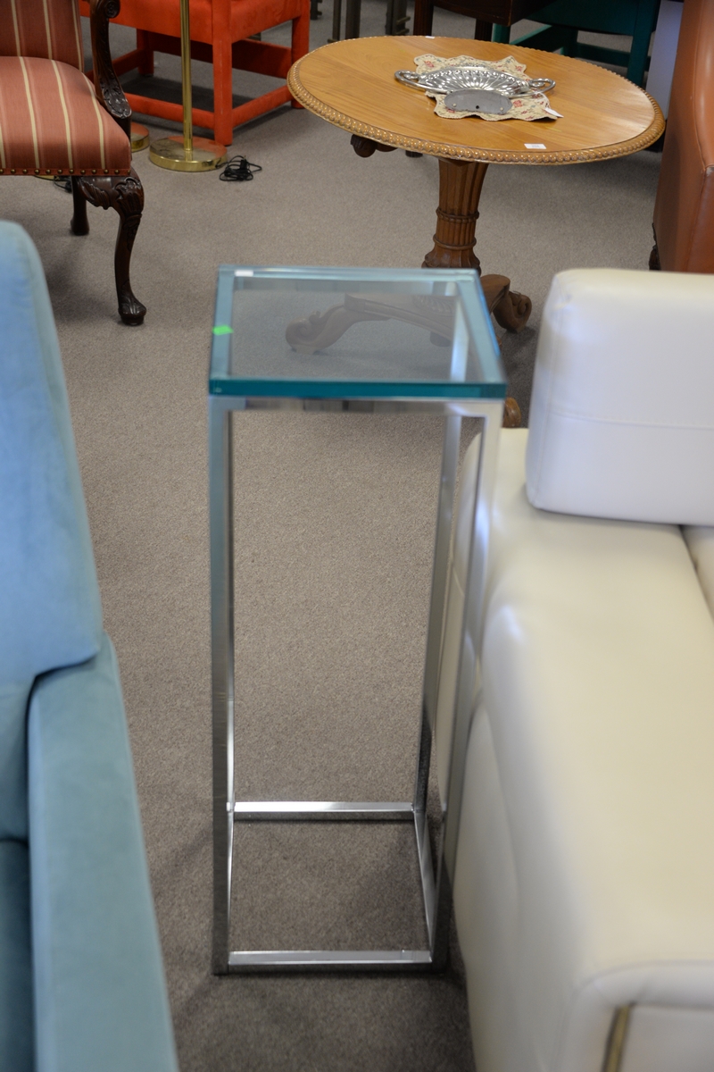 Two piece lot to include Milo Baughman style table. ht. 28 1/2 in., dia. 26in. and modern chrome and glass plinthe. ht. 34in., top: 12 x 12