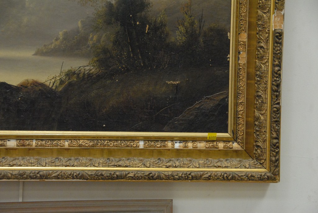 Victorian oil on canvas lake and mountain scene, 22 x 36.