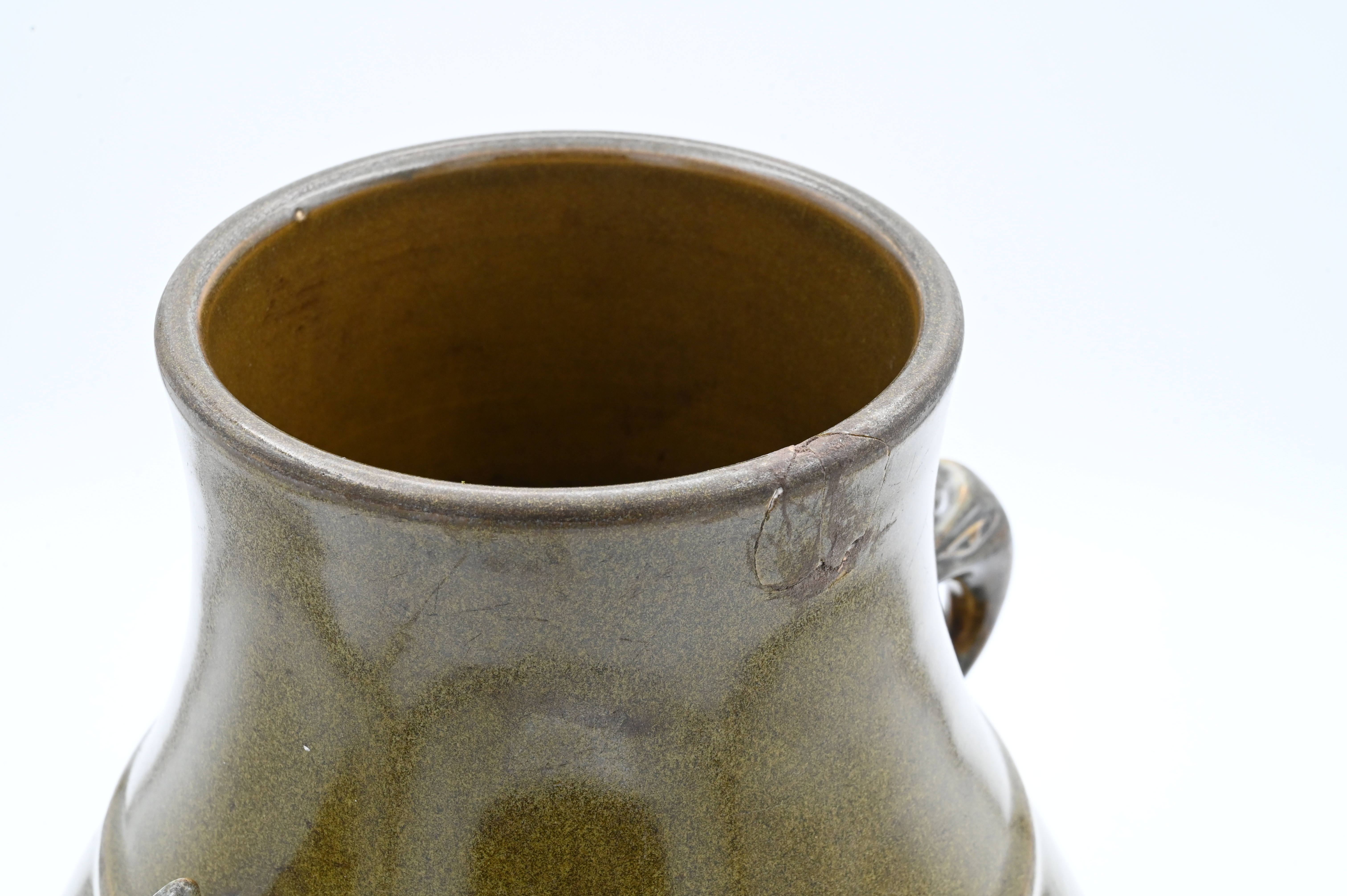 ritual Zun vessel having slightly out turned lip over rounded body flanked by two stylized elephant ring handles, character seal to base, repair to rim