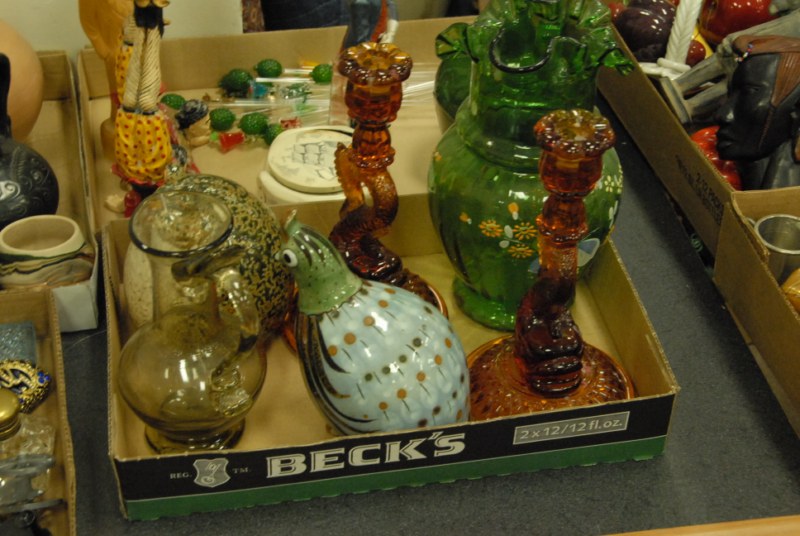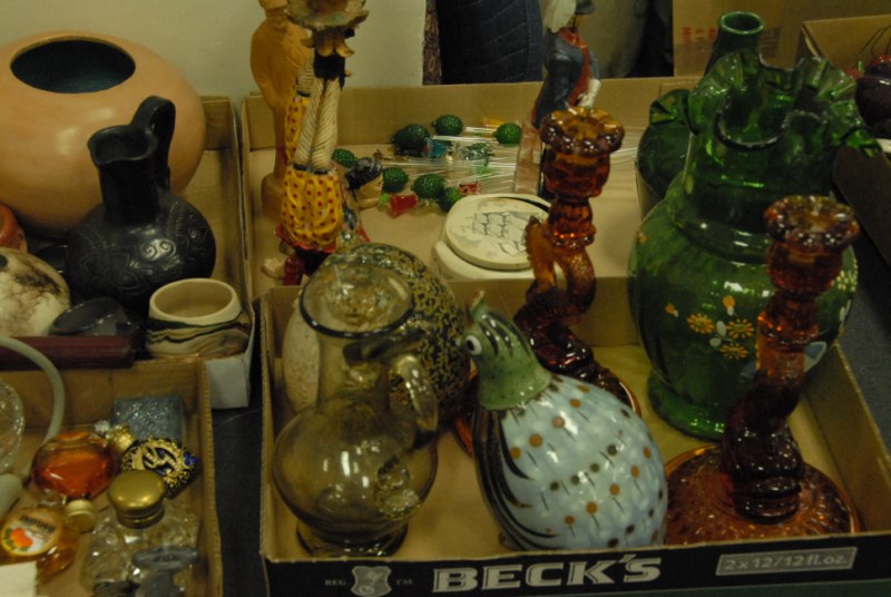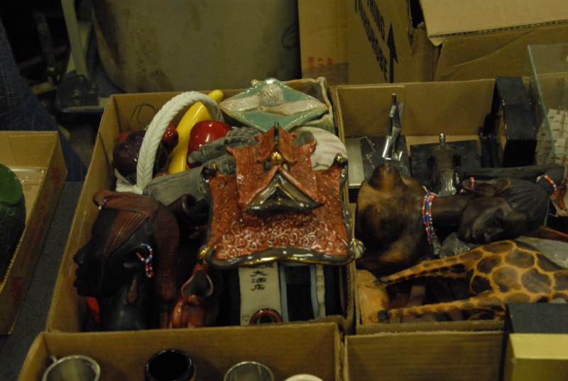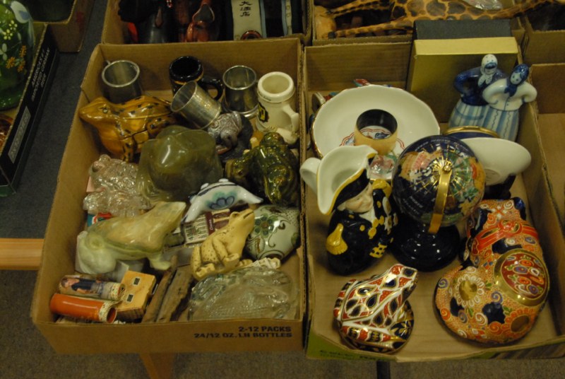 10 box lots misc. items and knickknacks, frog figures, Toby style mug, candlesticks, Oriental figures, Indian pottery etc.