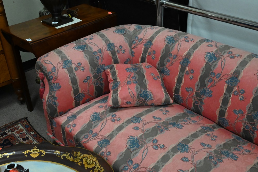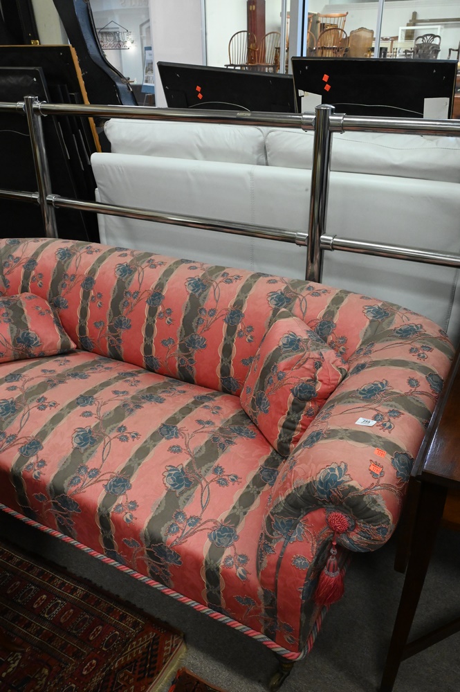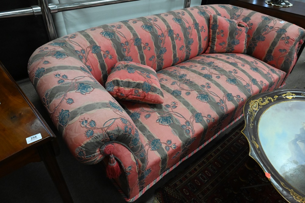 Custom Upholstered Sofa, attributed to George Smith, having rolled arms, height 26 inches, length 75 inches.