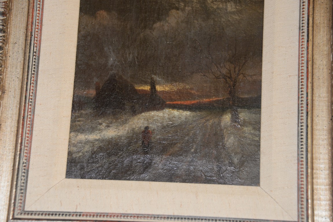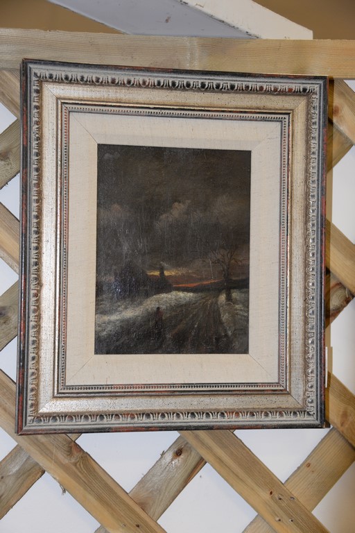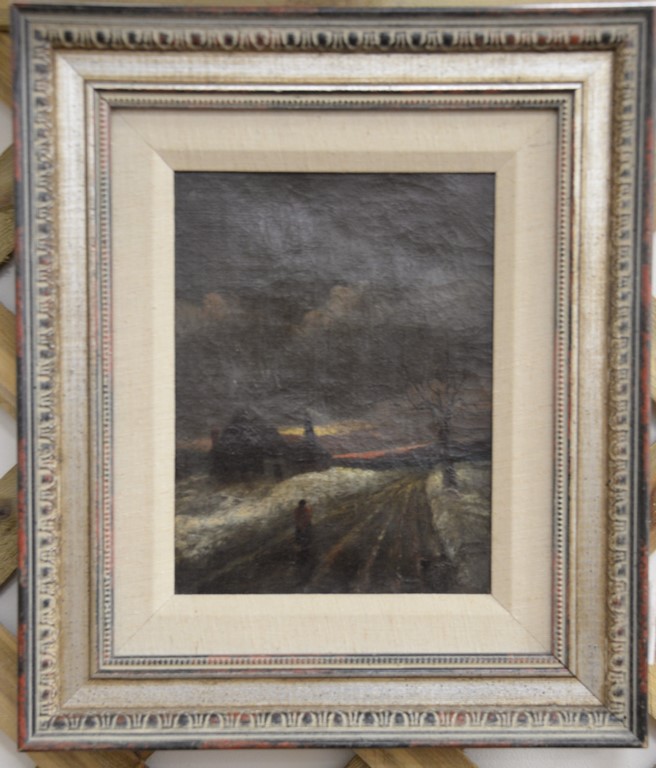 Lot 255: Dubois Fenelon Hasbrouck American 1860-1934, figure in road, oil on canvas, Legere Gallery White Plains, NY label, 7 1/2 x 5 1/2.