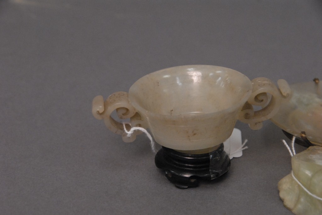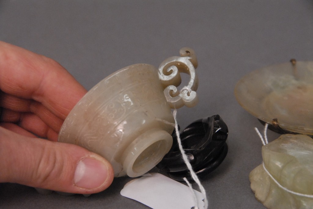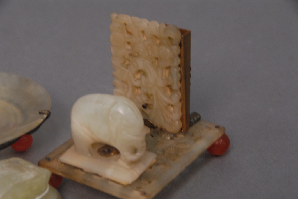Lot 255: Four jade and hardstone pieces to include a small jade cup, small hardstone plate, stand, and match holder with elephant, cup: ht. 2…