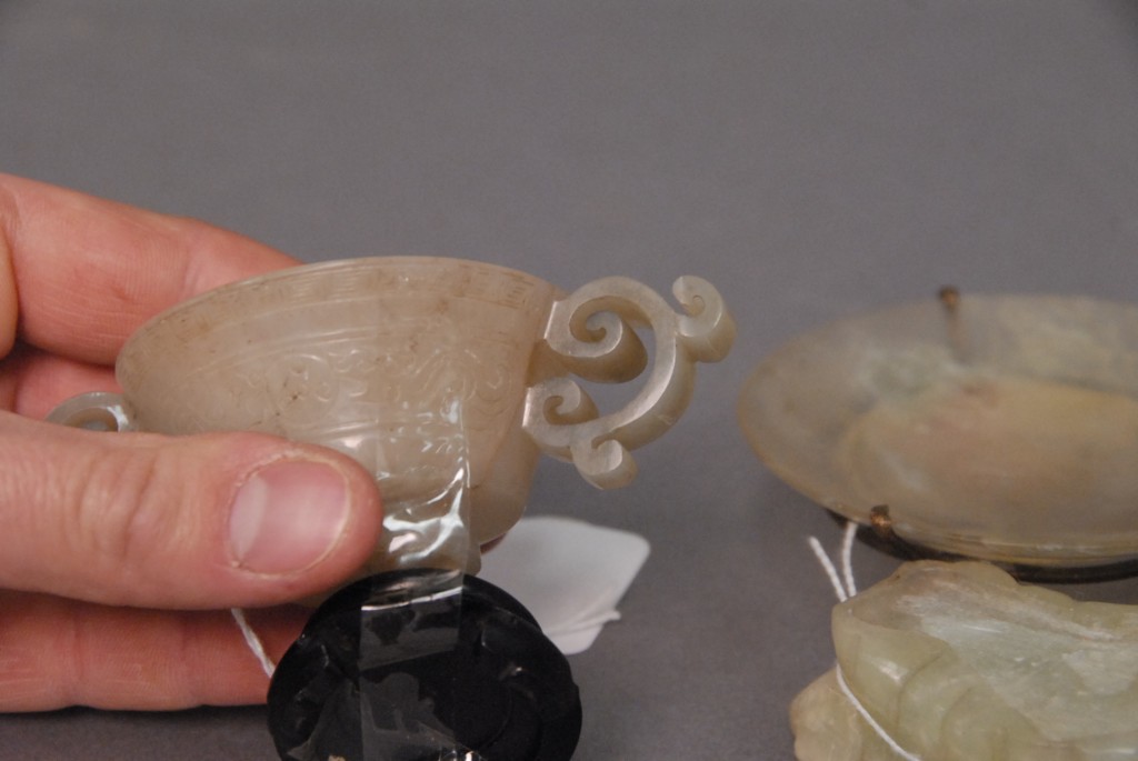 Four jade and hardstone pieces to include a small jade cup, small hardstone plate, stand, and match holder with elephant, cup: ht. 2, wd. 4, plate: dia. 3 1/2.