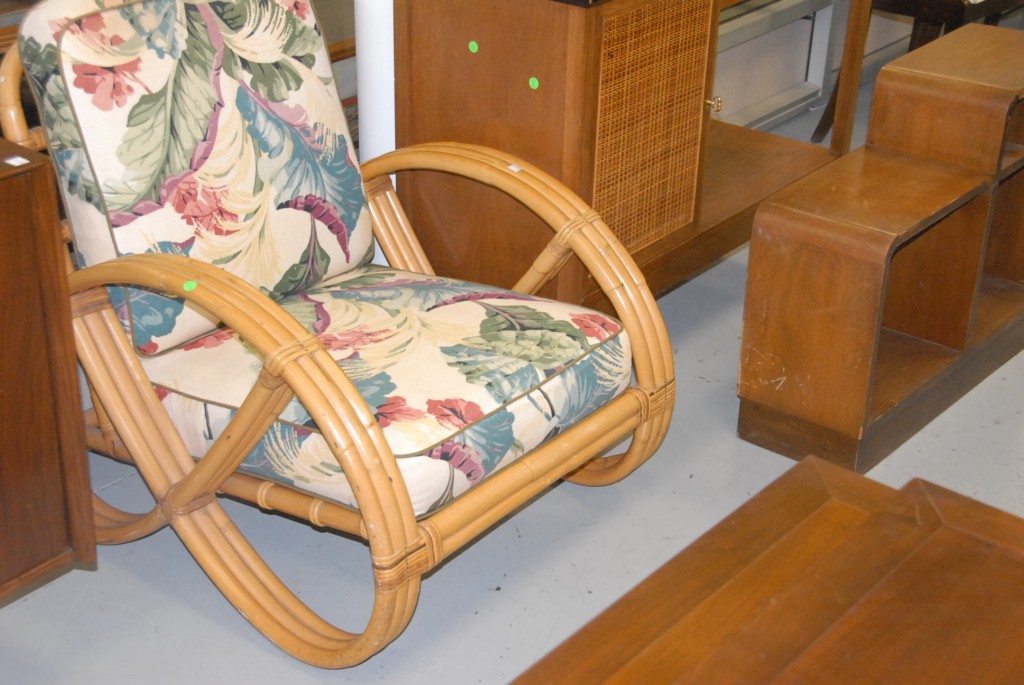 Lot 255: Group lot glass top teacart, small walnut shelf, and rattan chair.