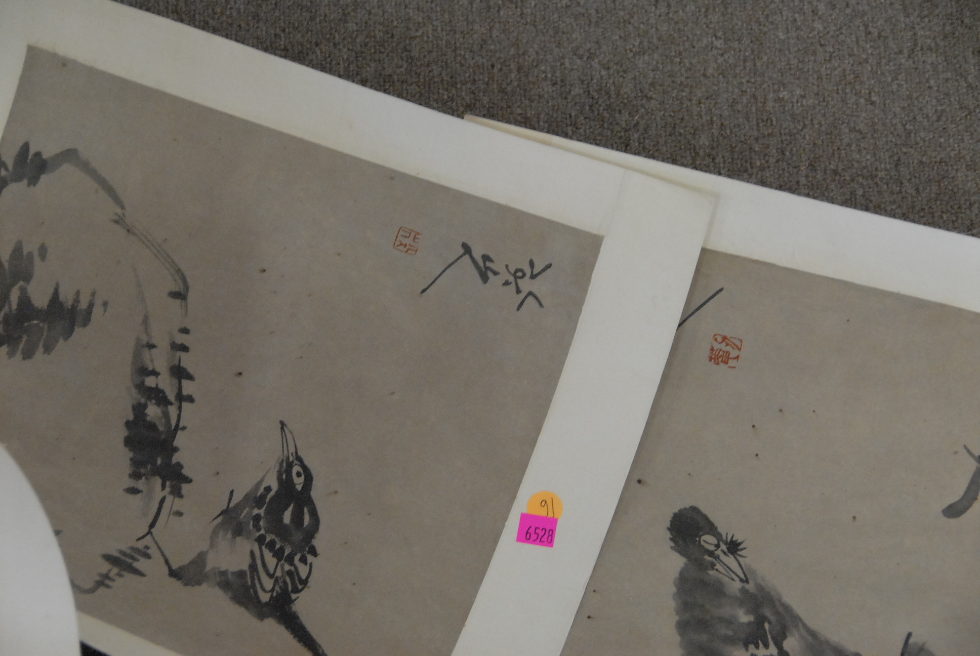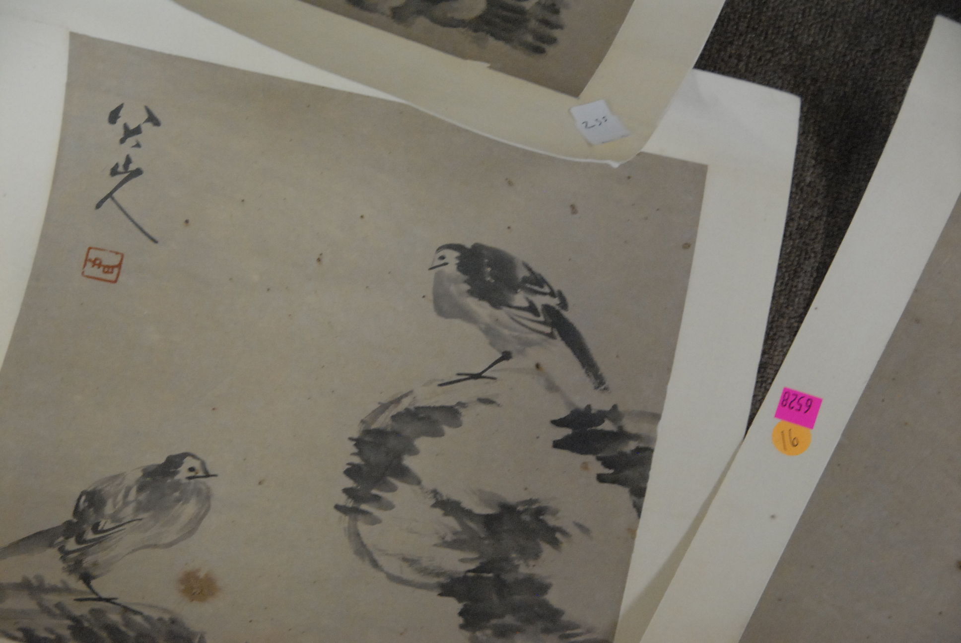 Group of five black and white watercolor on paper of birds, 13 x 13.