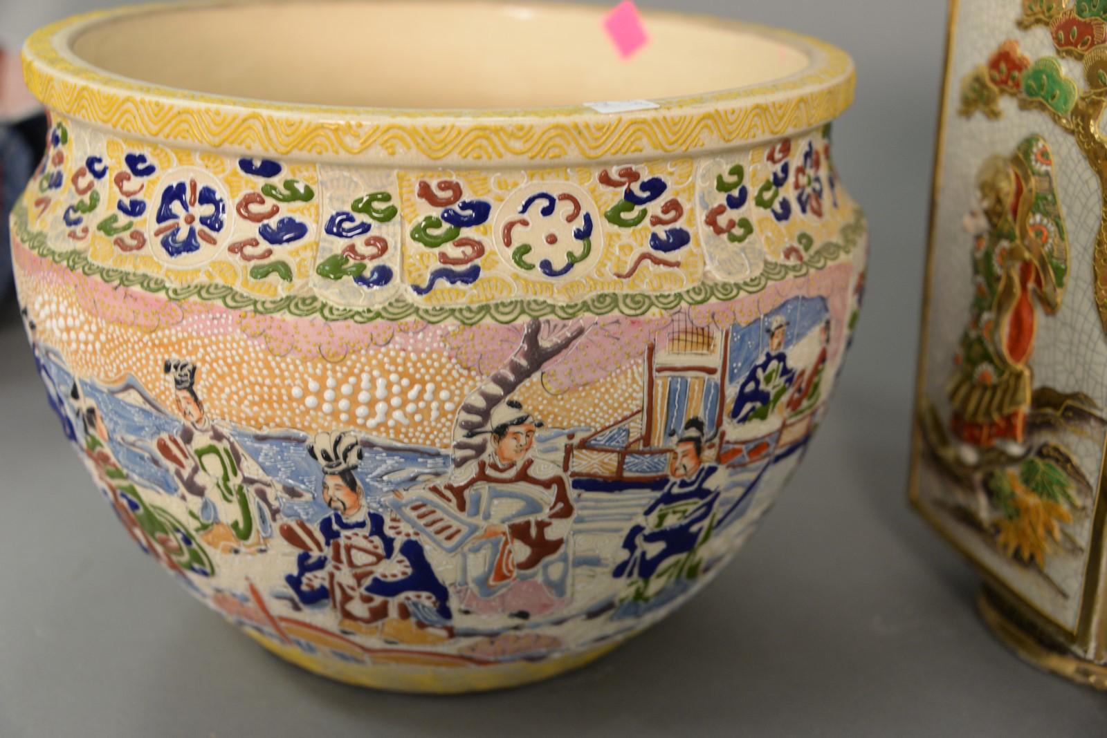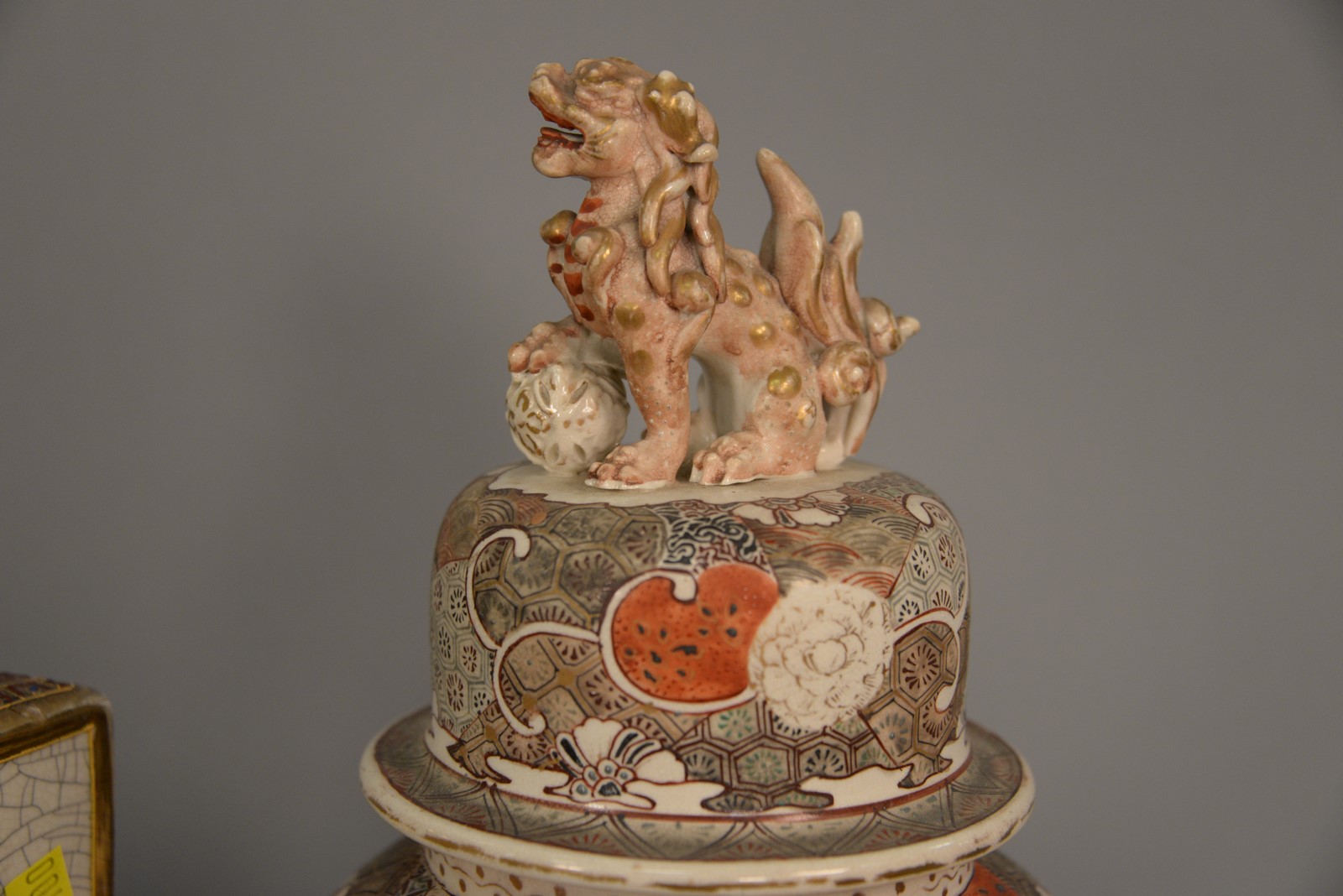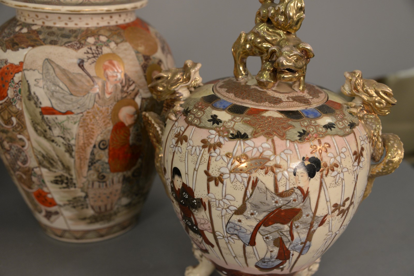Lot 255: Group of four Satsuma porcelain urns and vases to include two covered urns, planter, and a vase.ht. 11 in. to ht. 16 in.