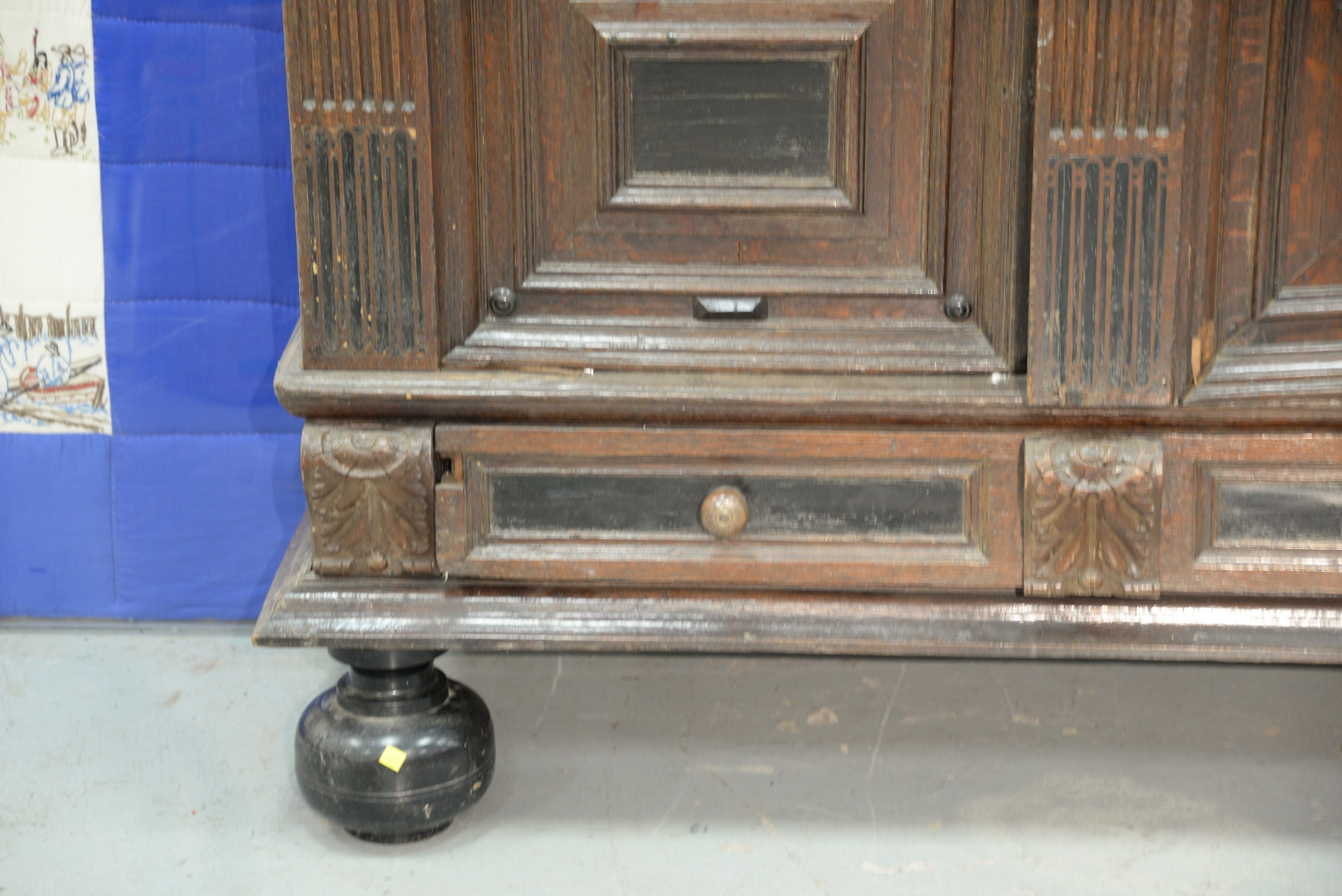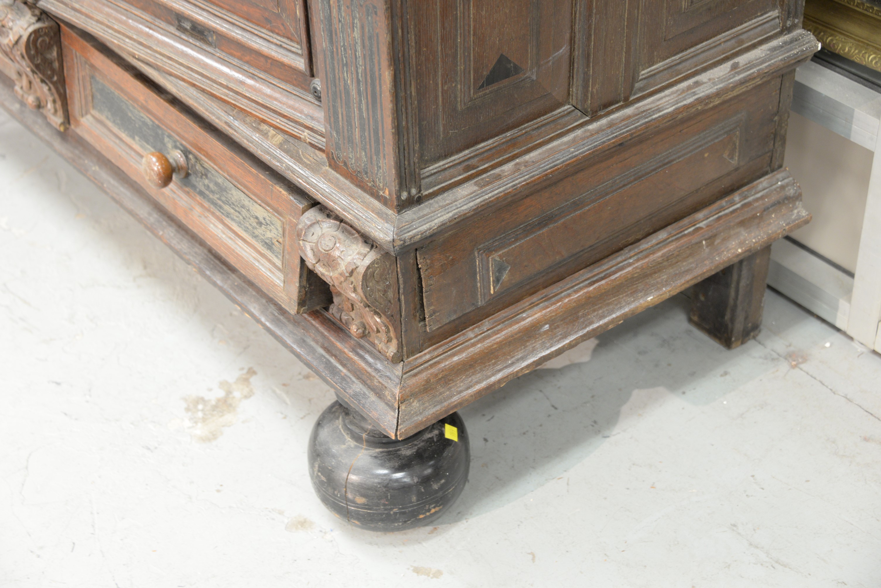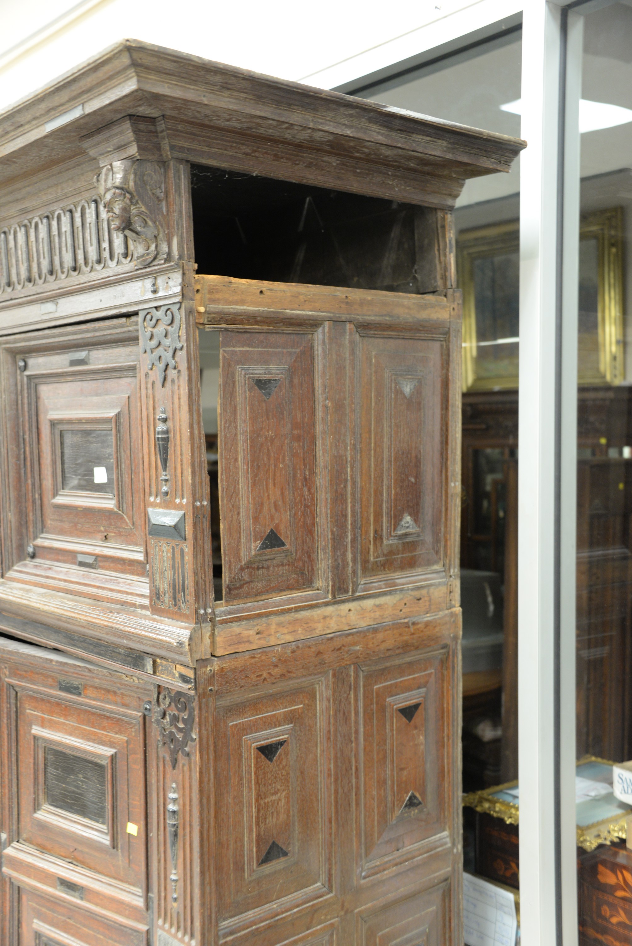 Lot 255: Jacobean oak kas having two doors over two doors over drawers on suppressed ball feet, probably 17th century box with extra parts….