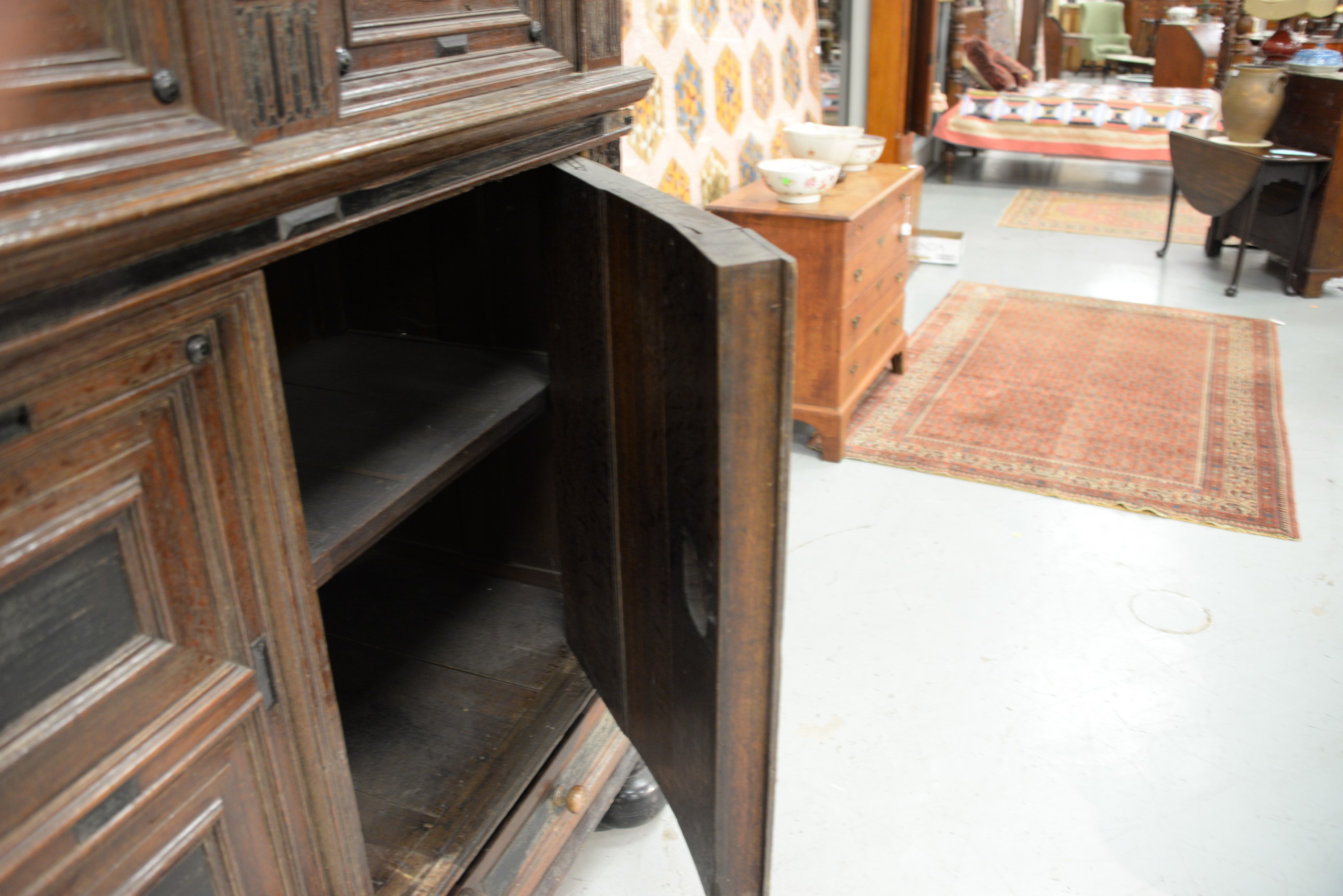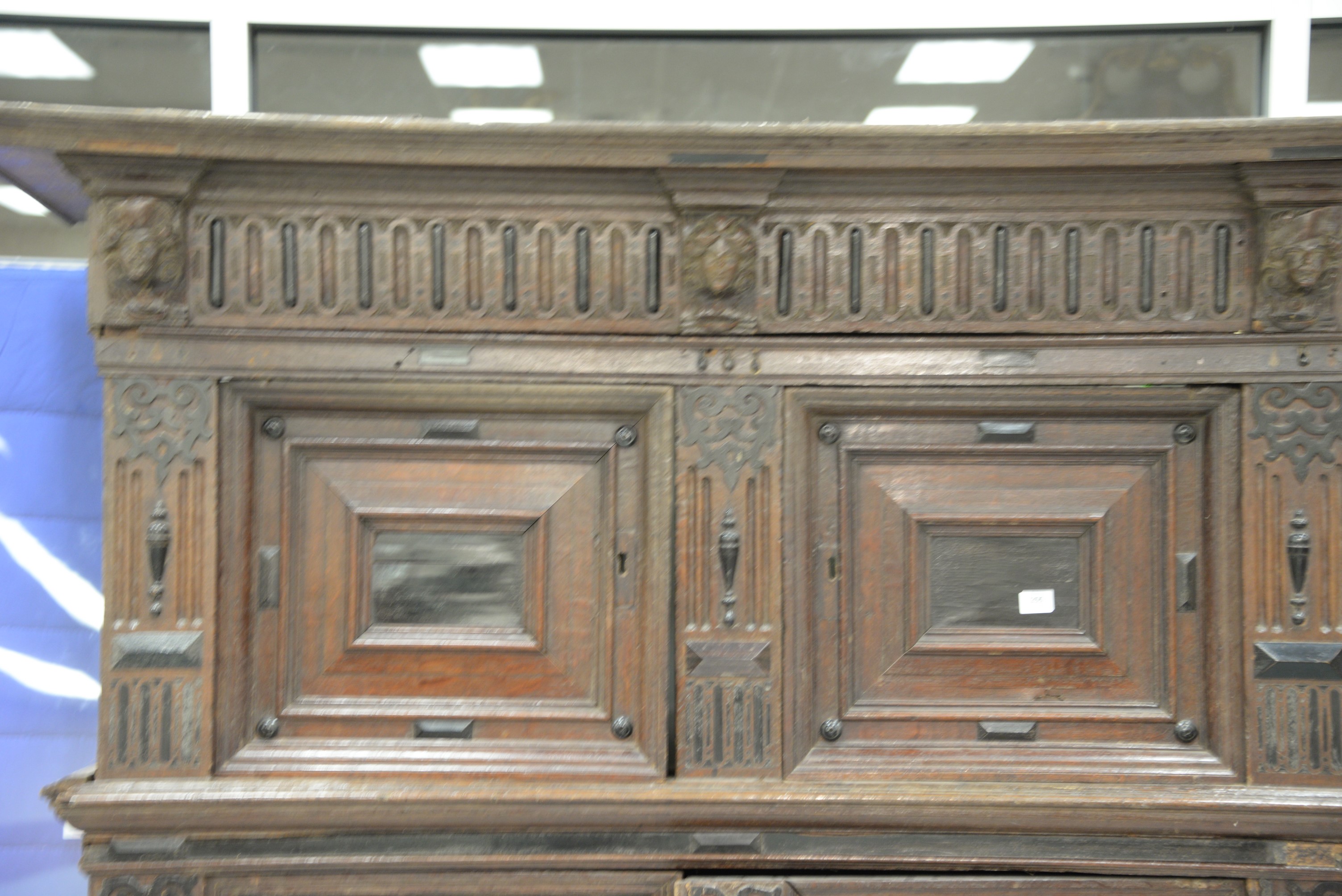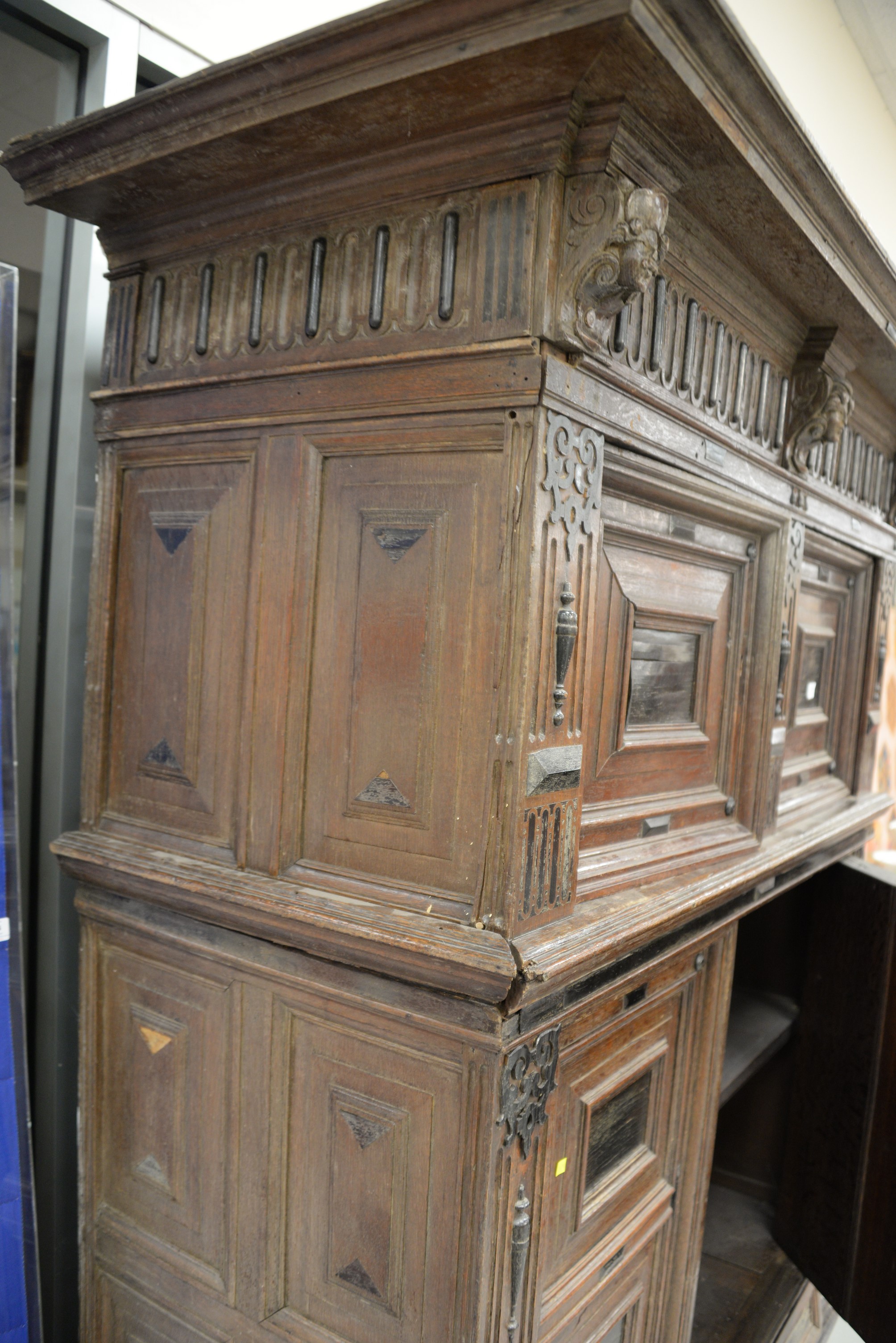 Lot 255: Jacobean oak kas having two doors over two doors over drawers on suppressed ball feet, probably 17th century box with extra parts….