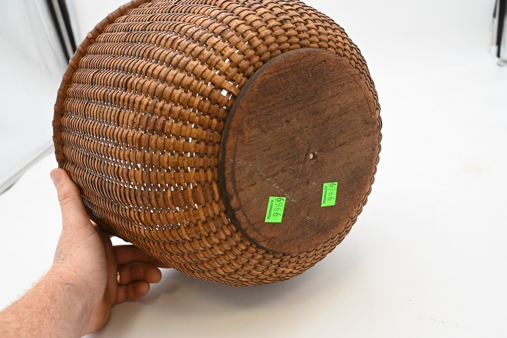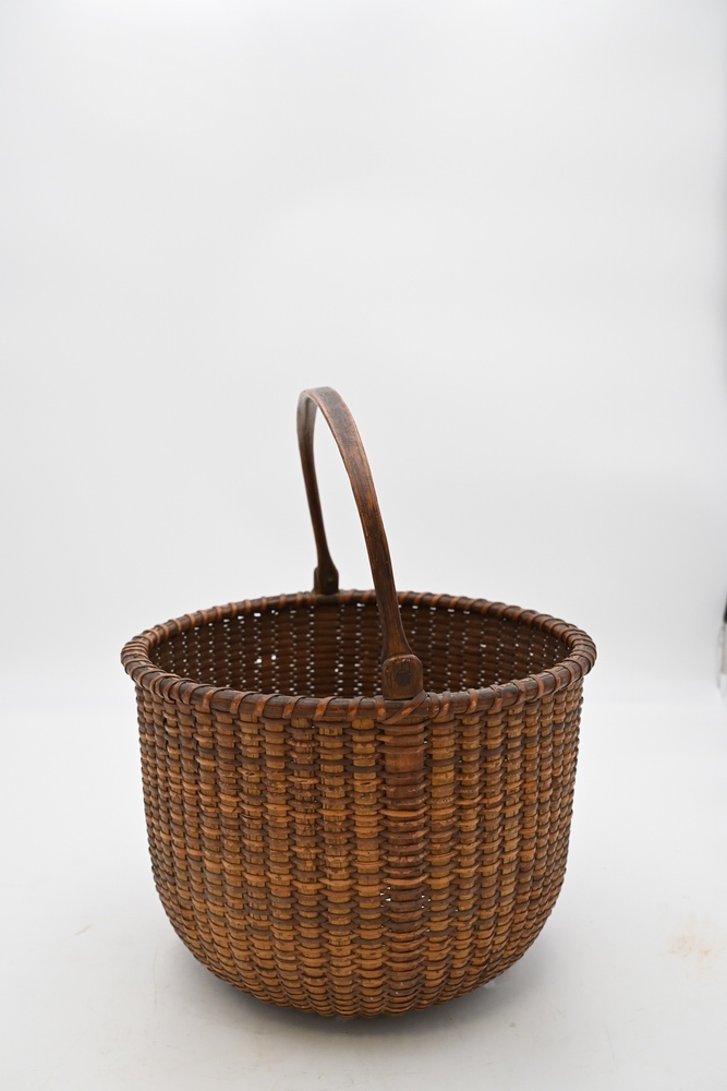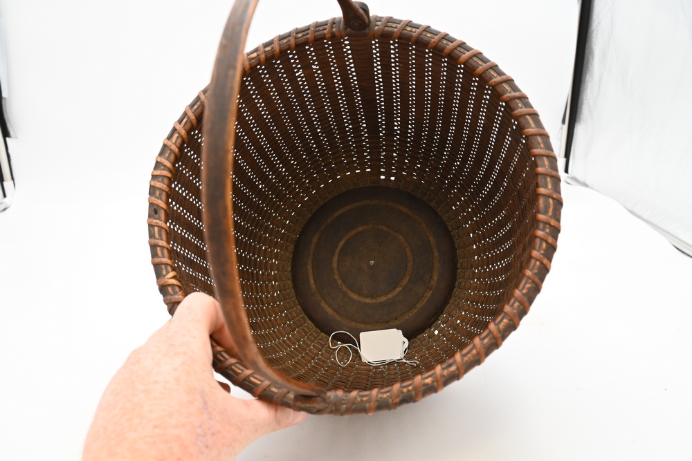 Lot 255: Nantucket Swing Handle Basket having minute damage near bottom height 8 inches plus handle, diameter 11 1/4 inches Provenance: Fifty Year Personal Collection of Clocks and American Antiques from Thomas Bailey, Manchester, Connecticut.