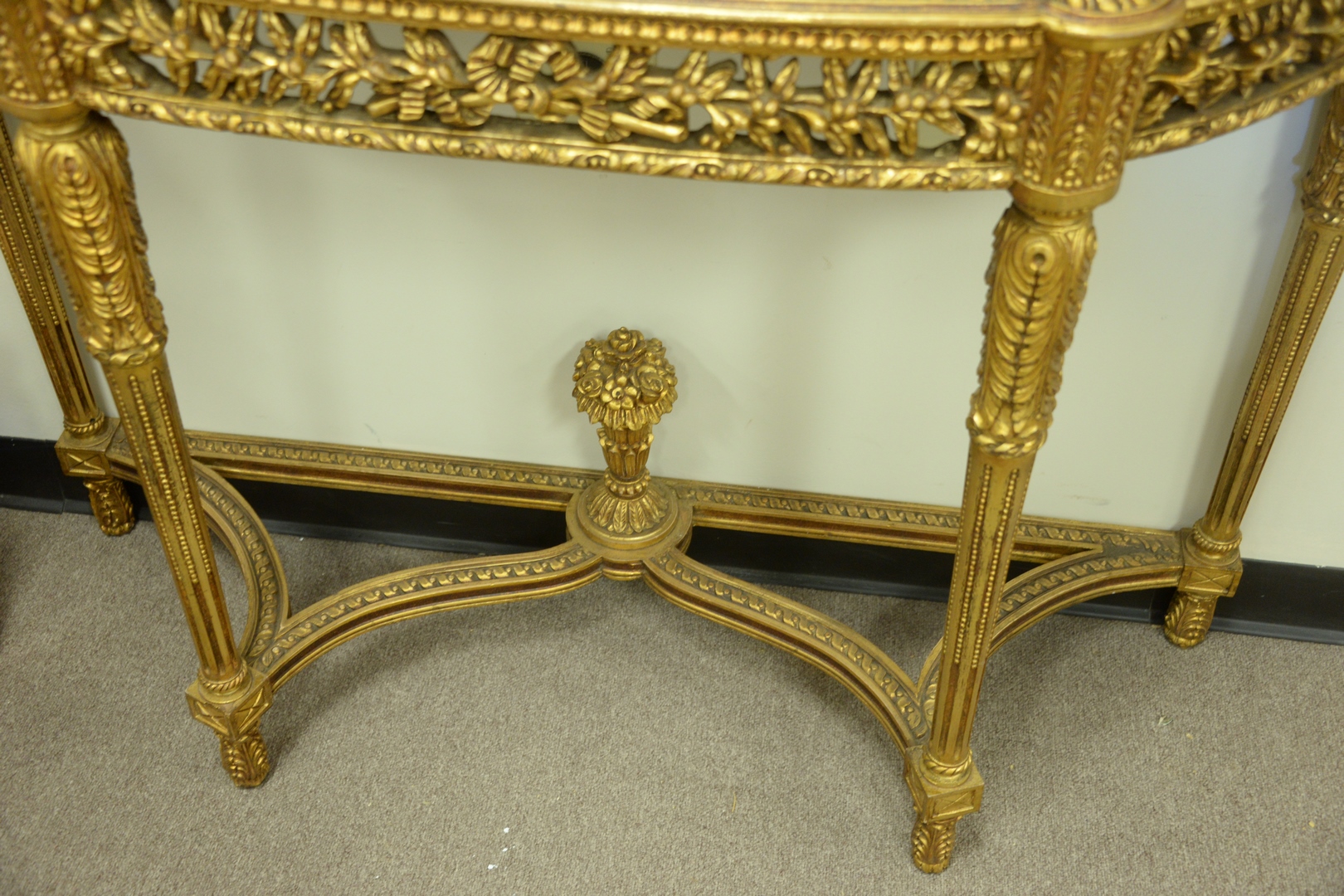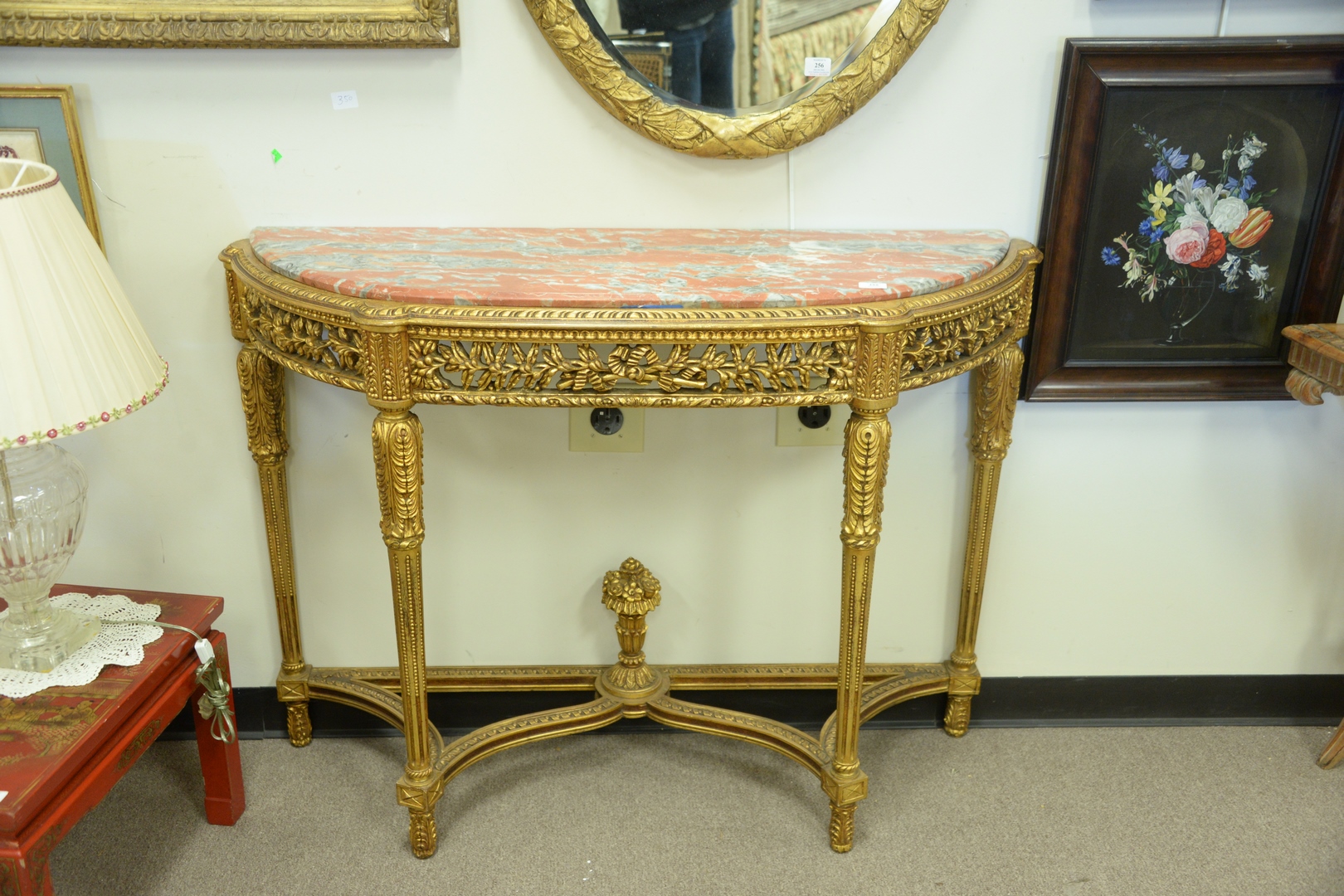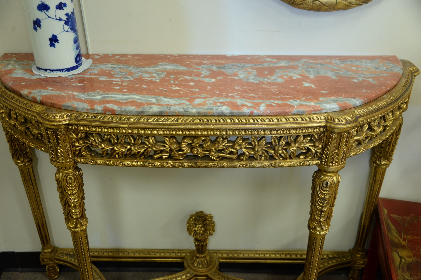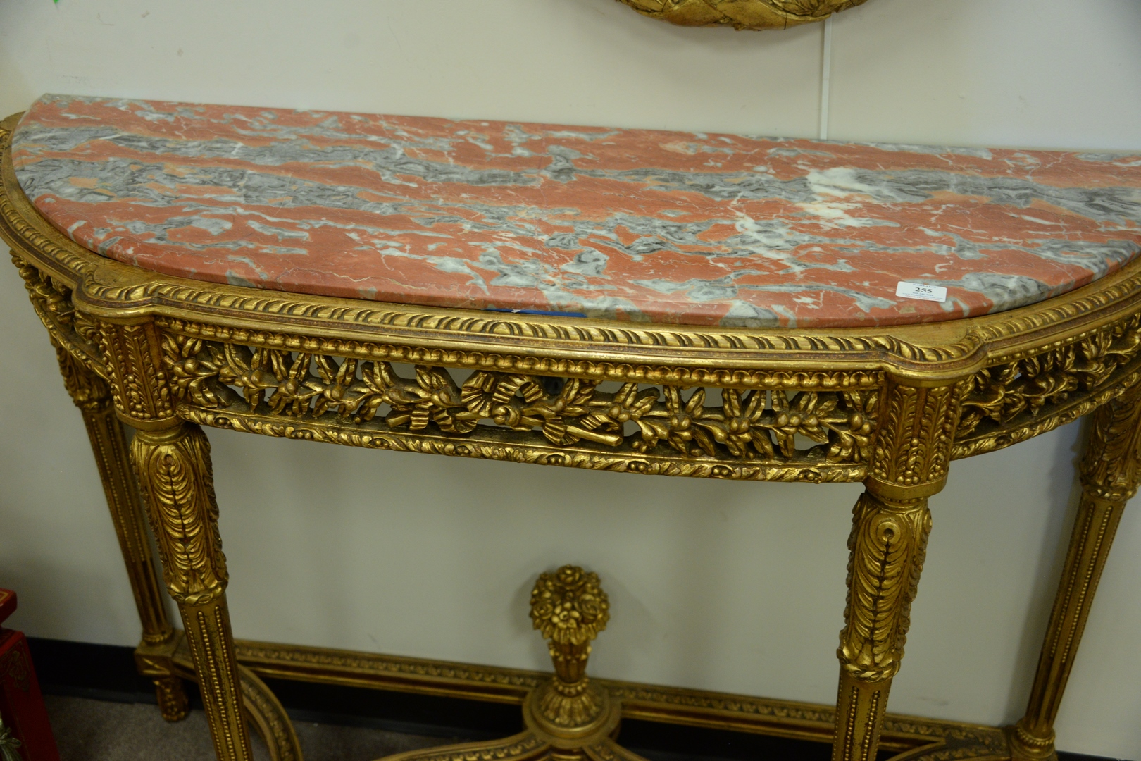 Lot 255: Pair of Gilt Demilune Tables, with rouge marble tops with pierce carved friezes, set on carved and fluted legs, with urn finials, m…