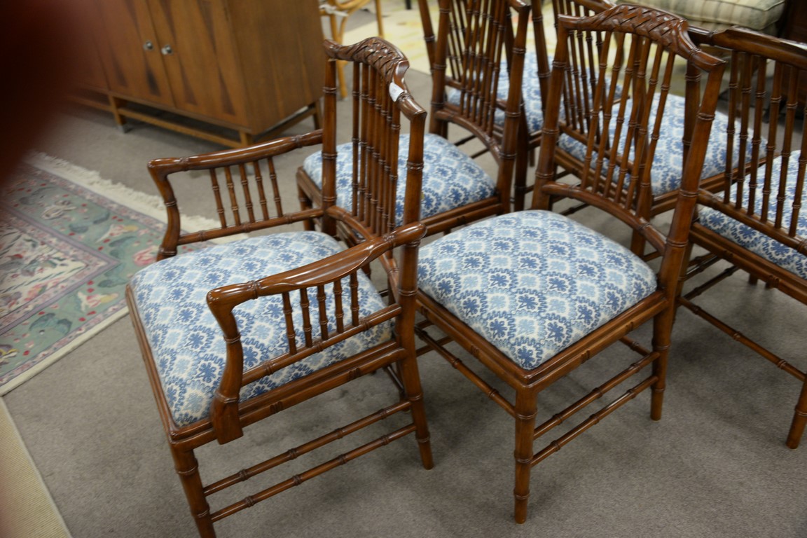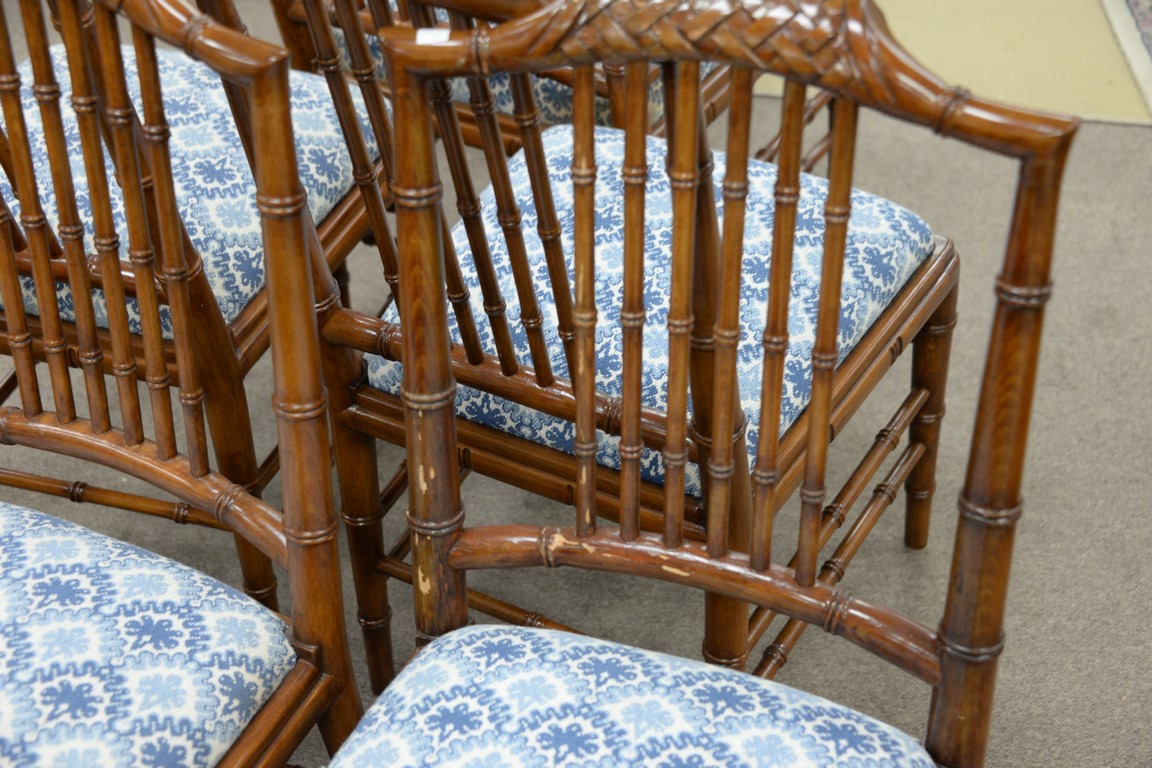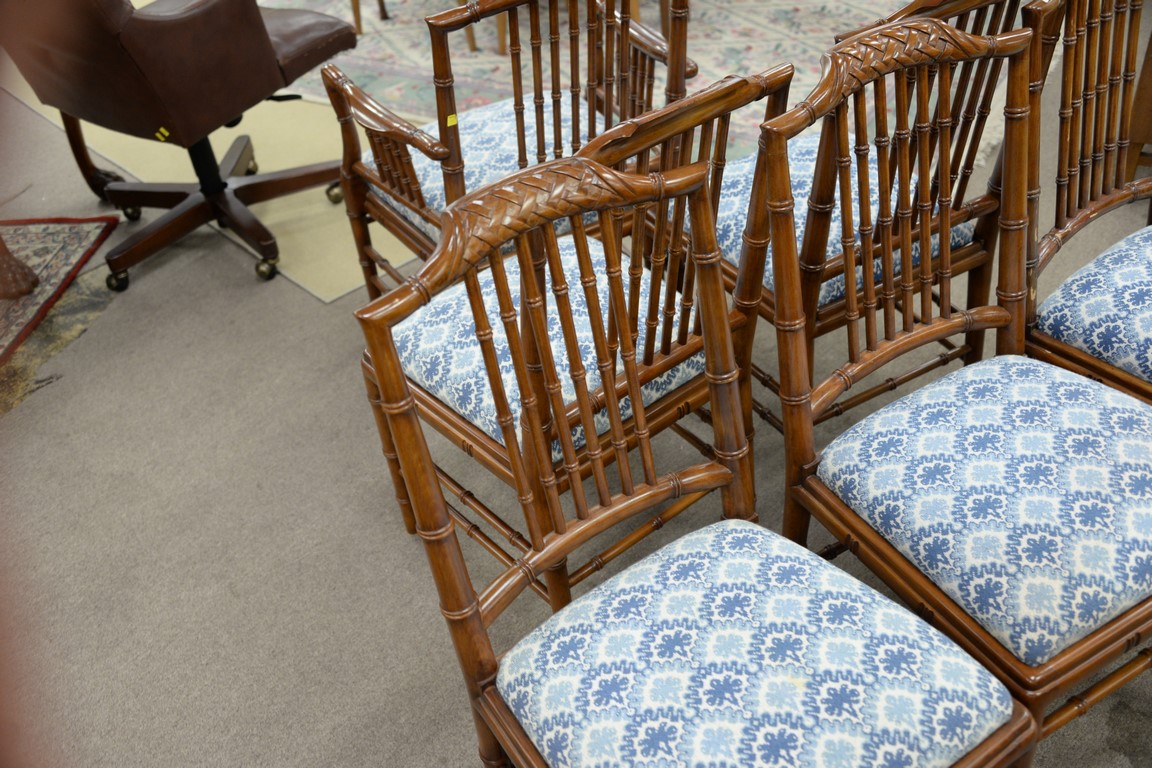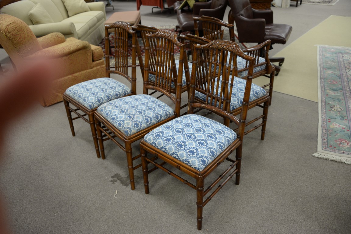 Lot 255: Set of six faux bamboo dining chairs, each with lattice top rail and faux bamboo turnings with blue and white upholstered seats incl…