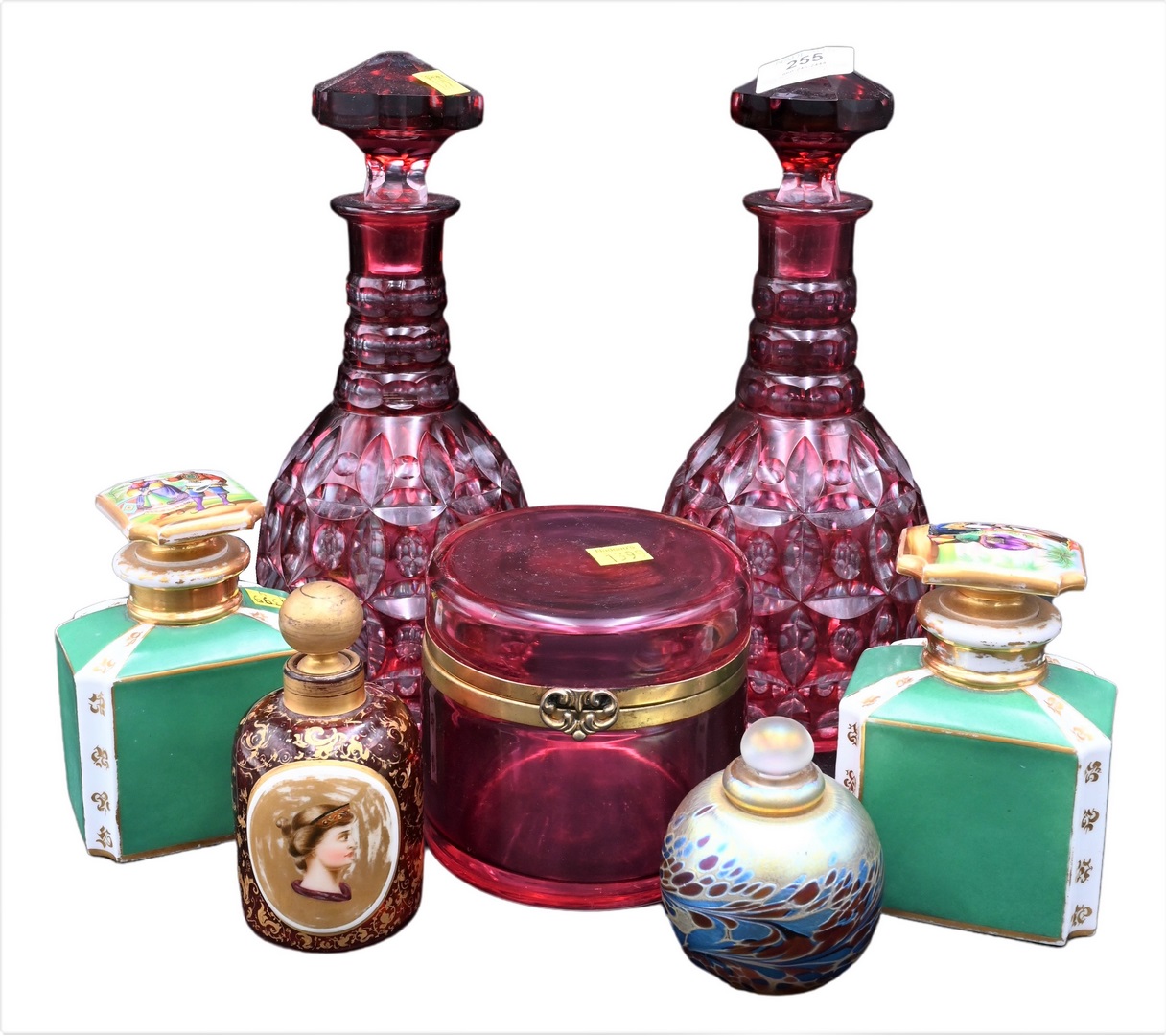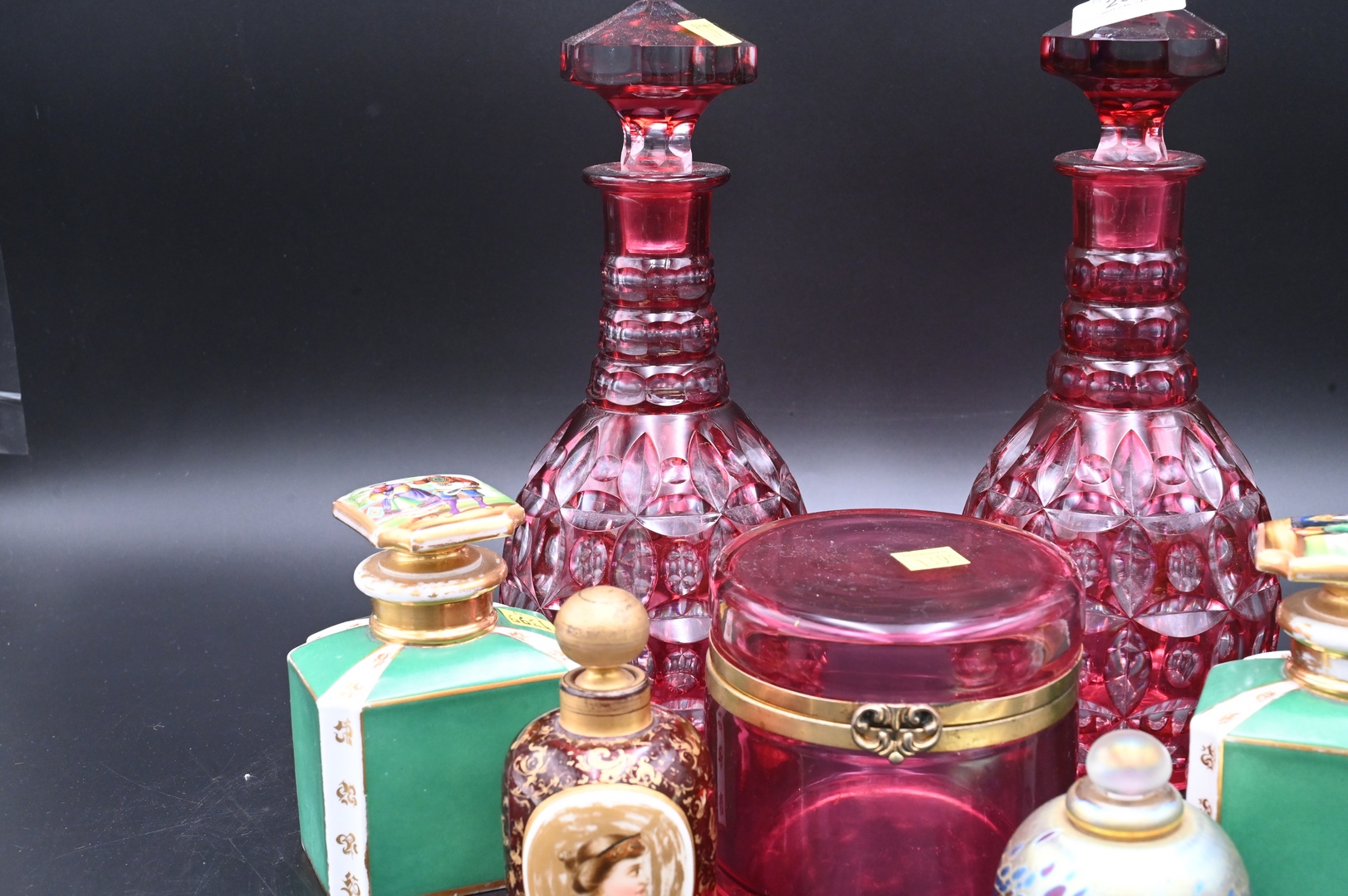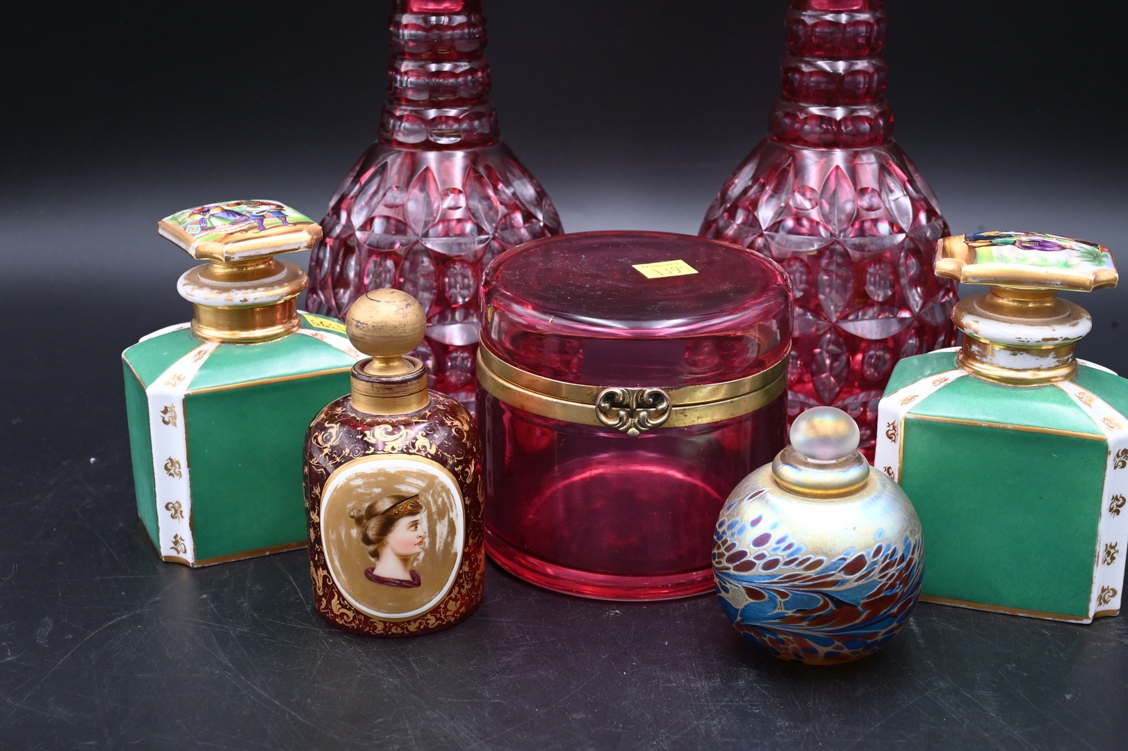 Seven Piece Group, cranberry cut, to clear glass bottles, pair of porcelain perfume bottles, art glass perfume cranberry vanity box, and a cranberry bottle with porcelain plaque, height 11 1/2 inches.
