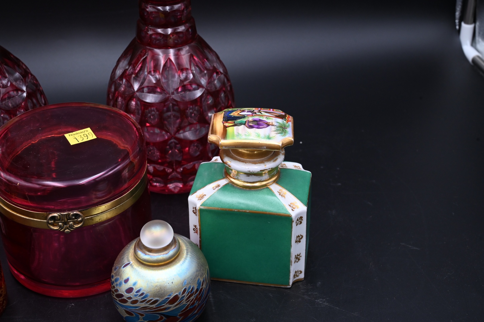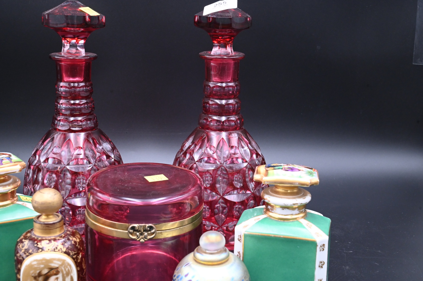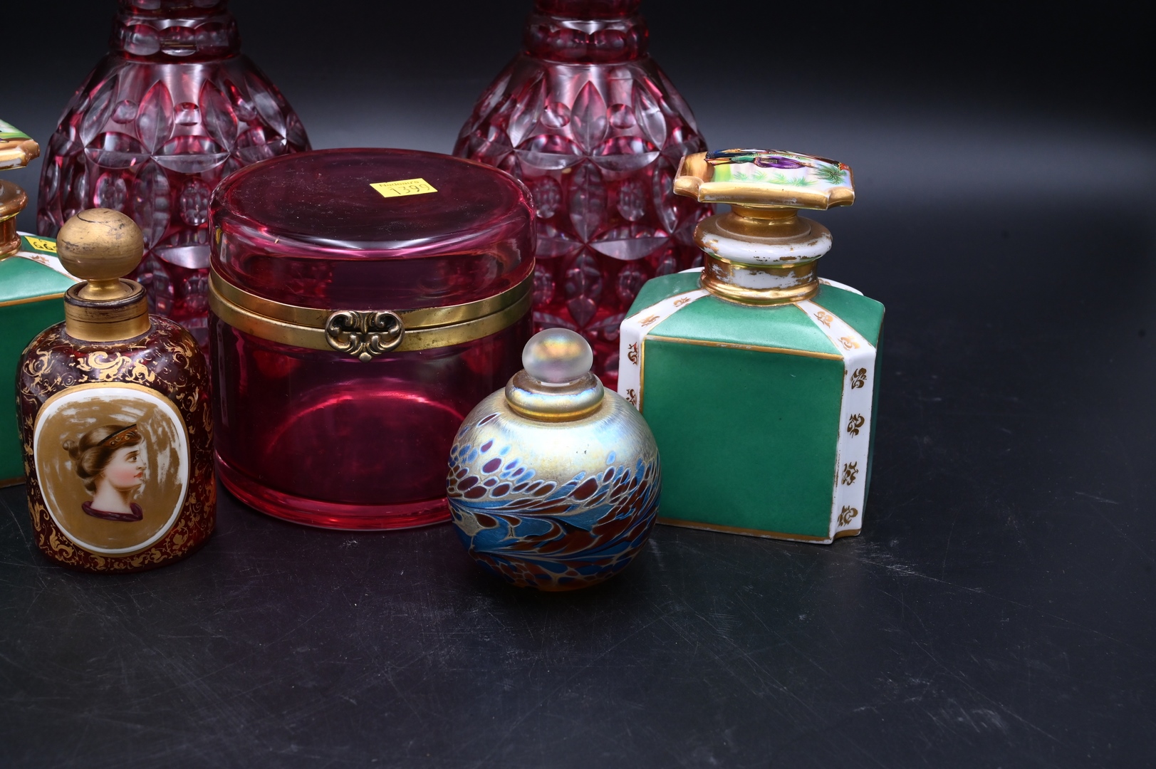 Seven Piece Group, cranberry cut, to clear glass bottles, pair of porcelain perfume bottles, art glass perfume cranberry vanity box, and a cranberry bottle with porcelain plaque, height 11 1/2 inches.