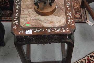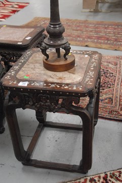 Lot 255: Square hardwood taboret with mother of pearl and wire inlay and russet marble top, nicely carved openwork apron depicting a stylized bat, splayed shouldered legs ending in hoof foot atop stretcher, China 19th/20th century. ht. 20in. top measures 16