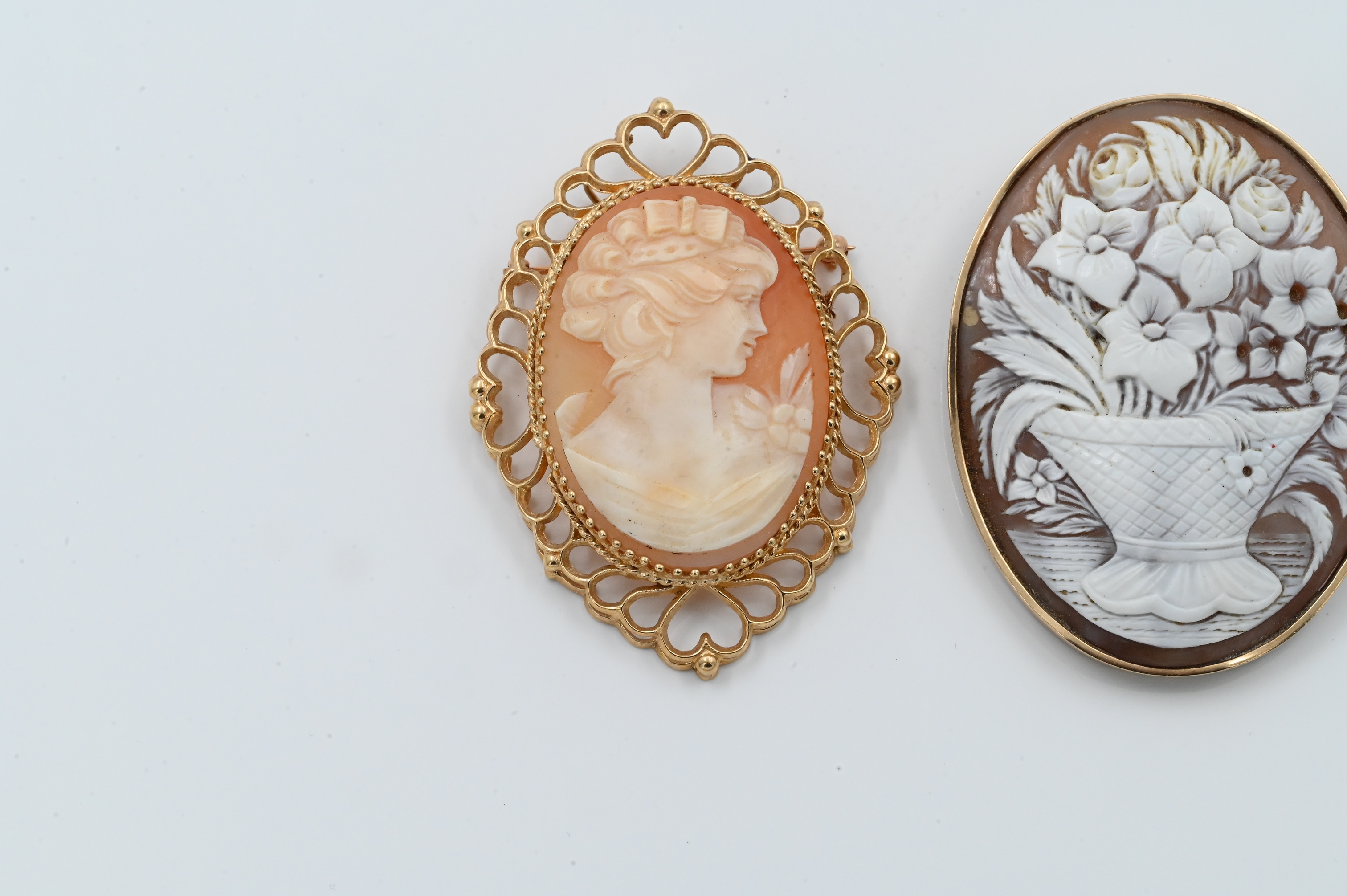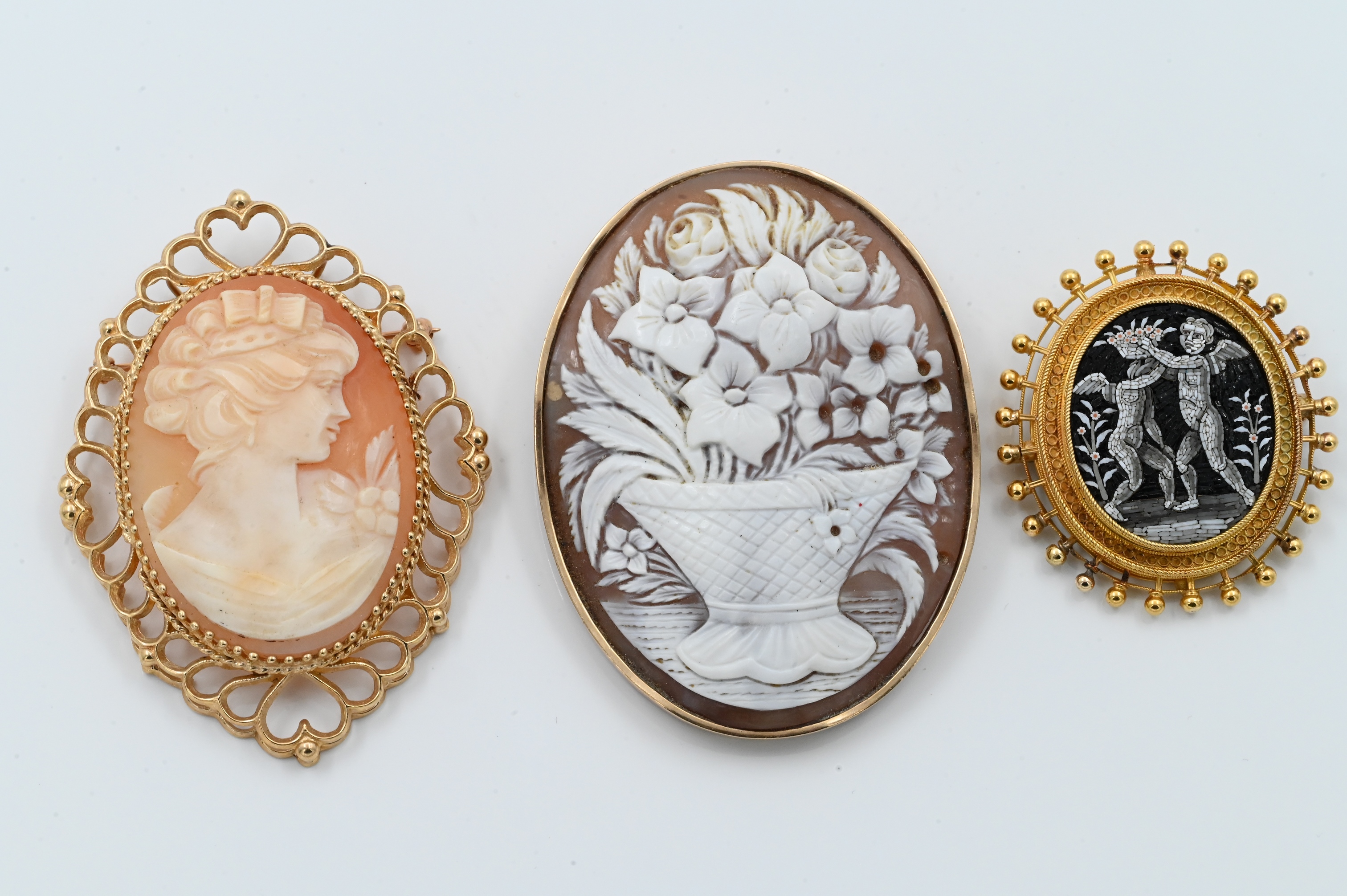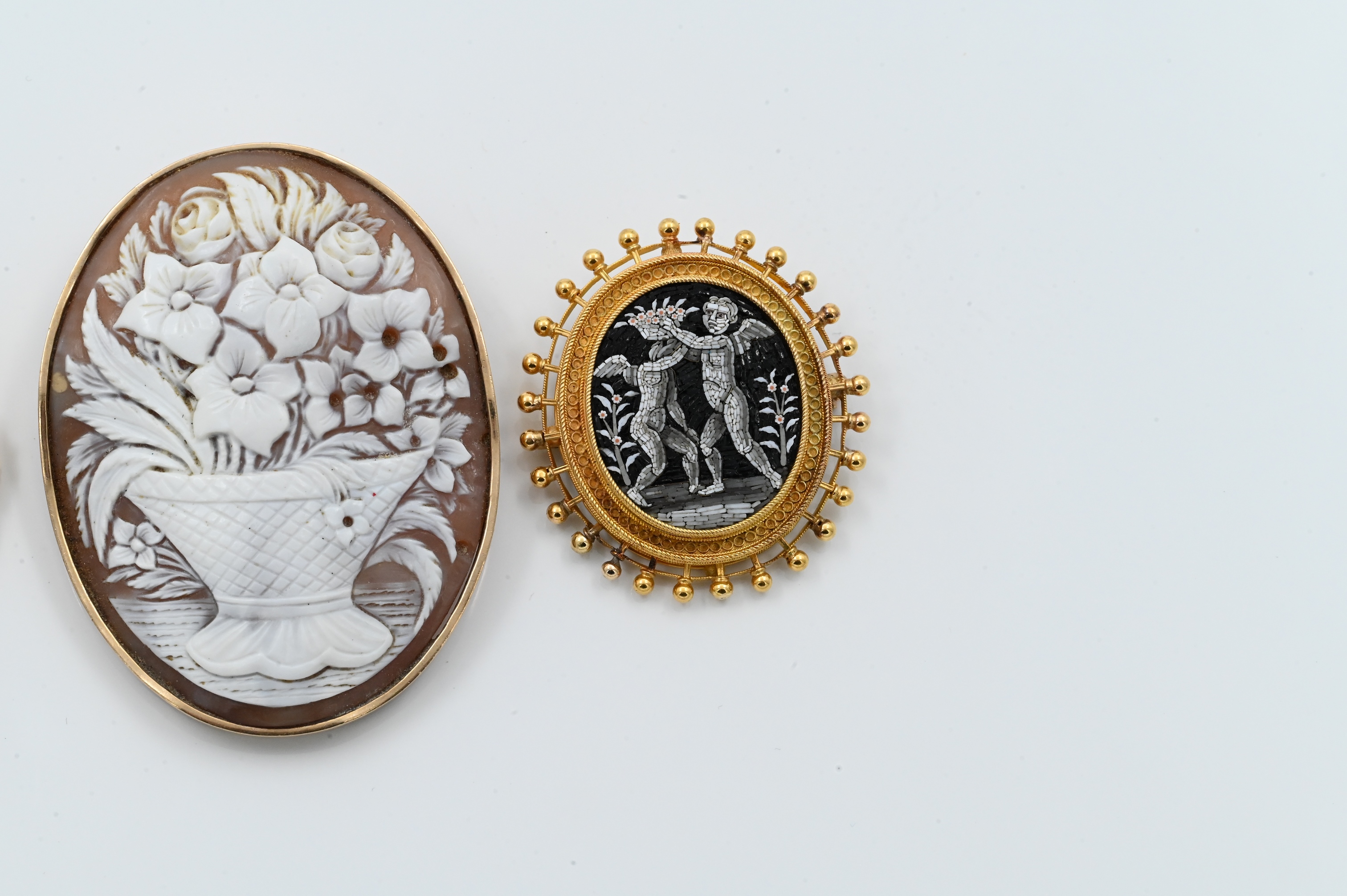 to include two shell cameos, one micro mosaic brooch / locket, 19th century