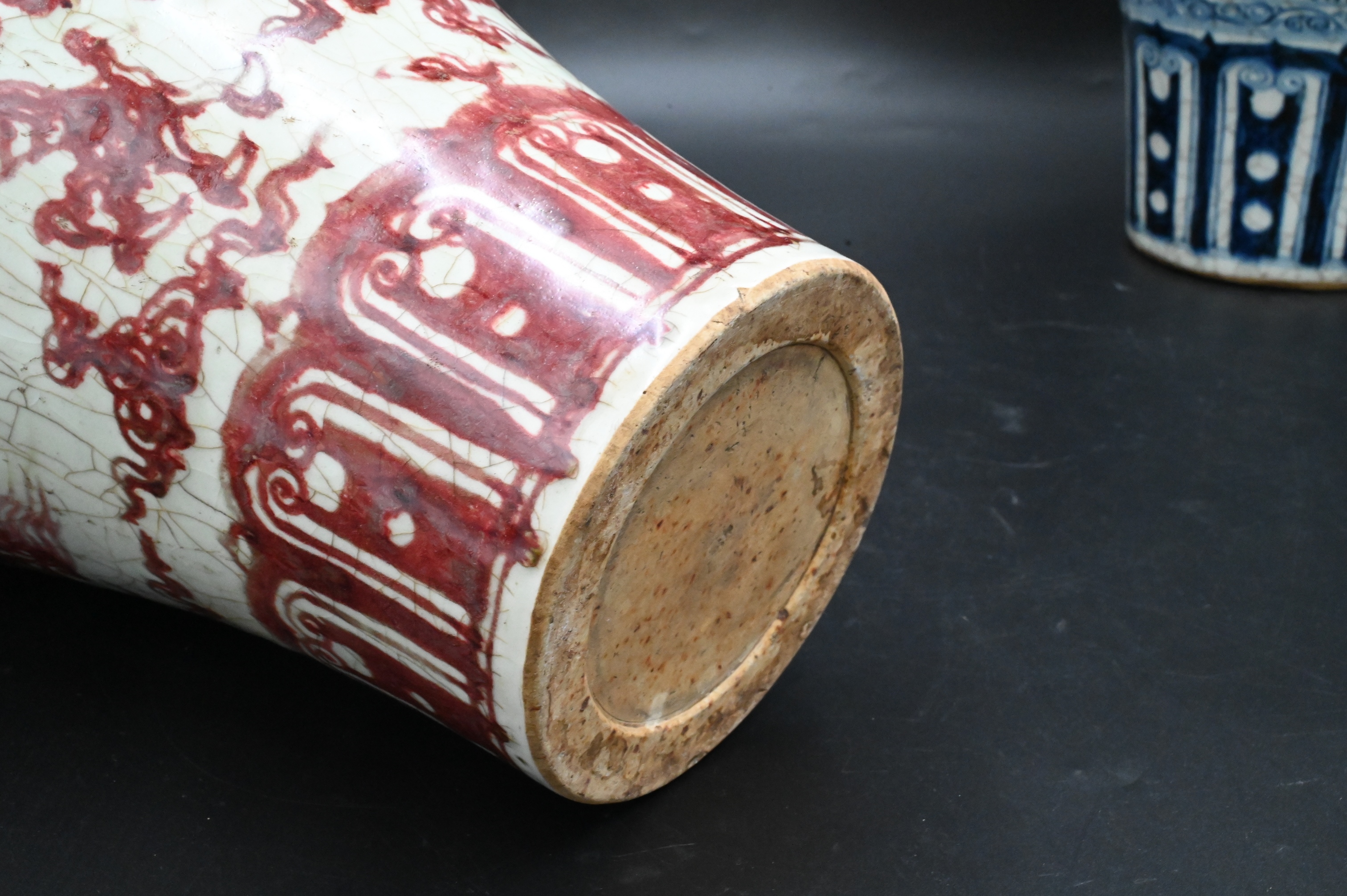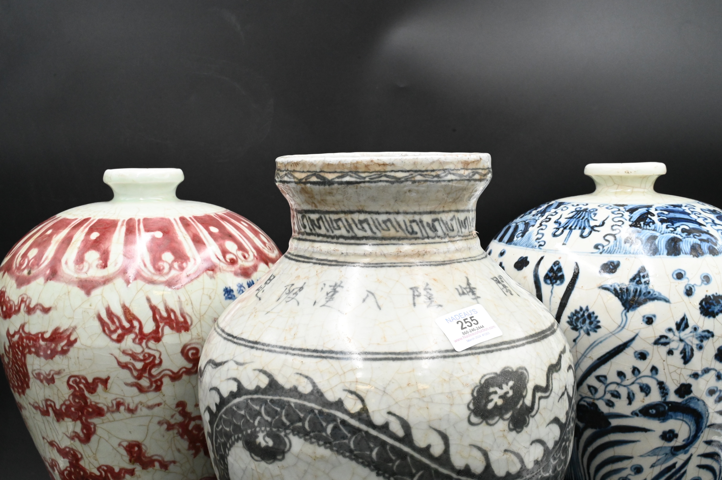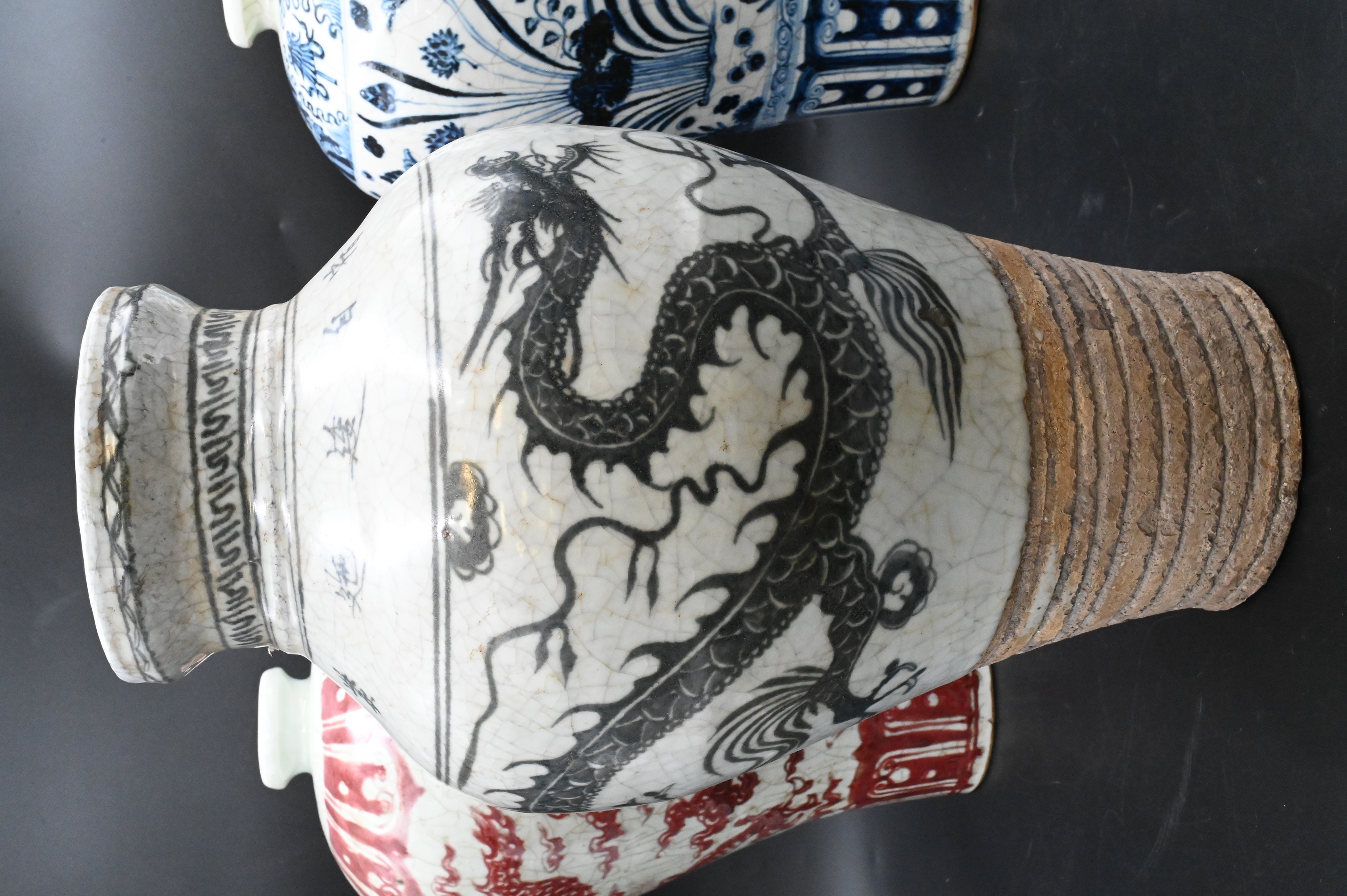 to include one black and white vase having a dragon motif, one underglaze copper red vase with dragon motif, one blue and white vase having fish and botanical motif