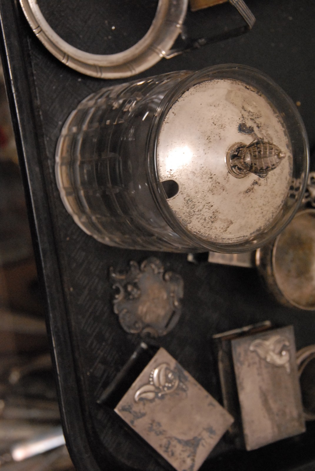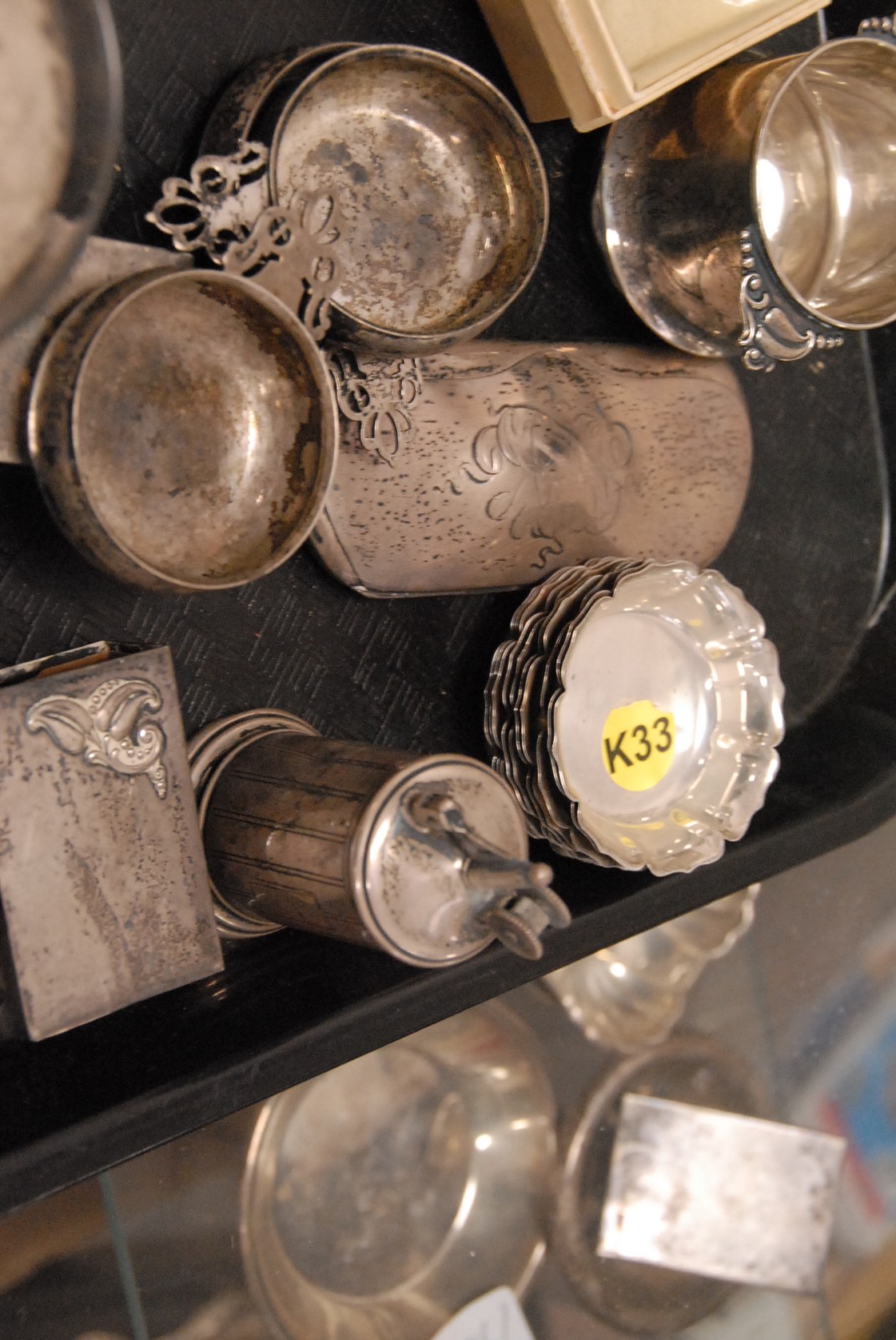 Tray lot to include sterling silver, Victorian buttons and pins on original cards, 2 match safes and mother of pearl book binder