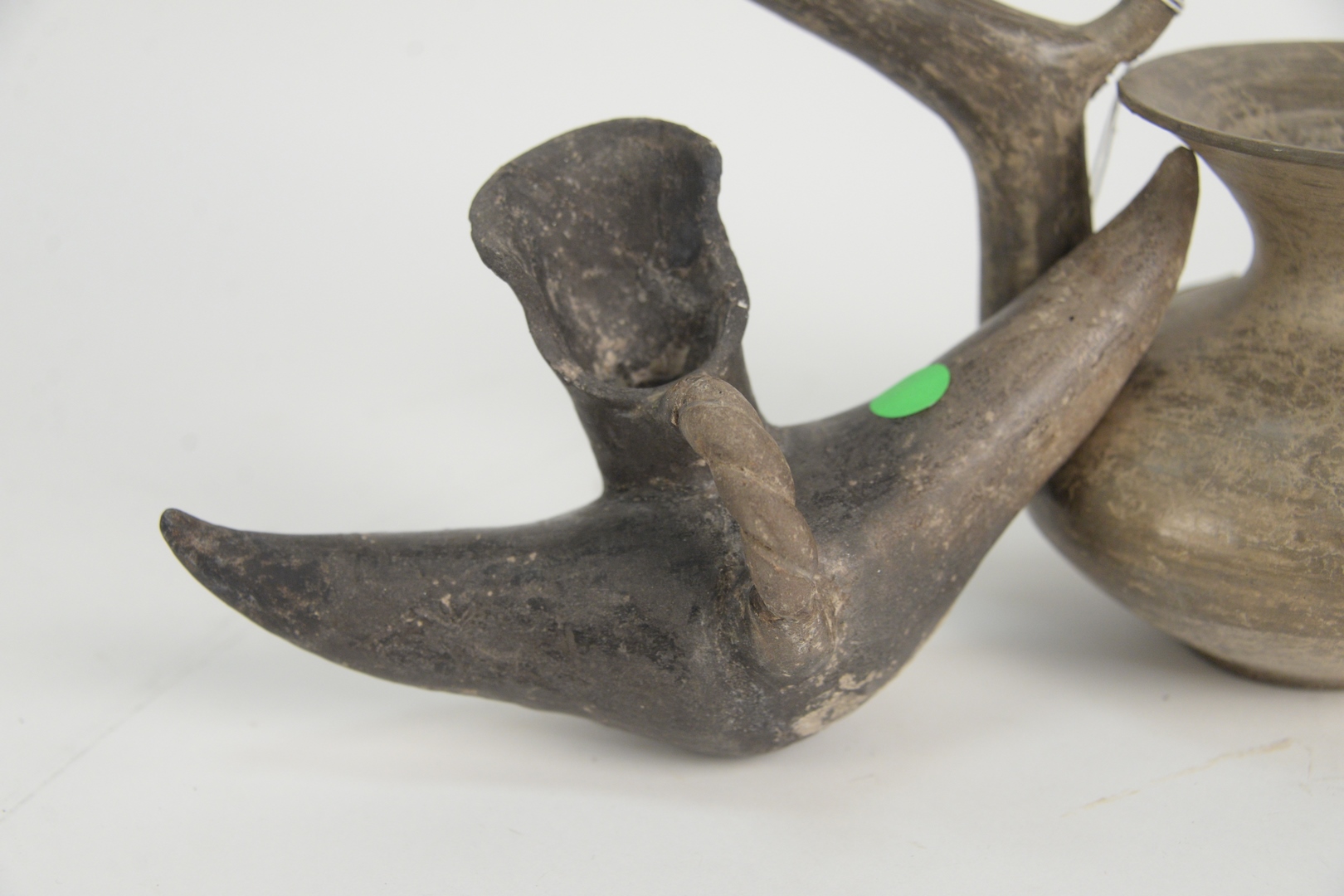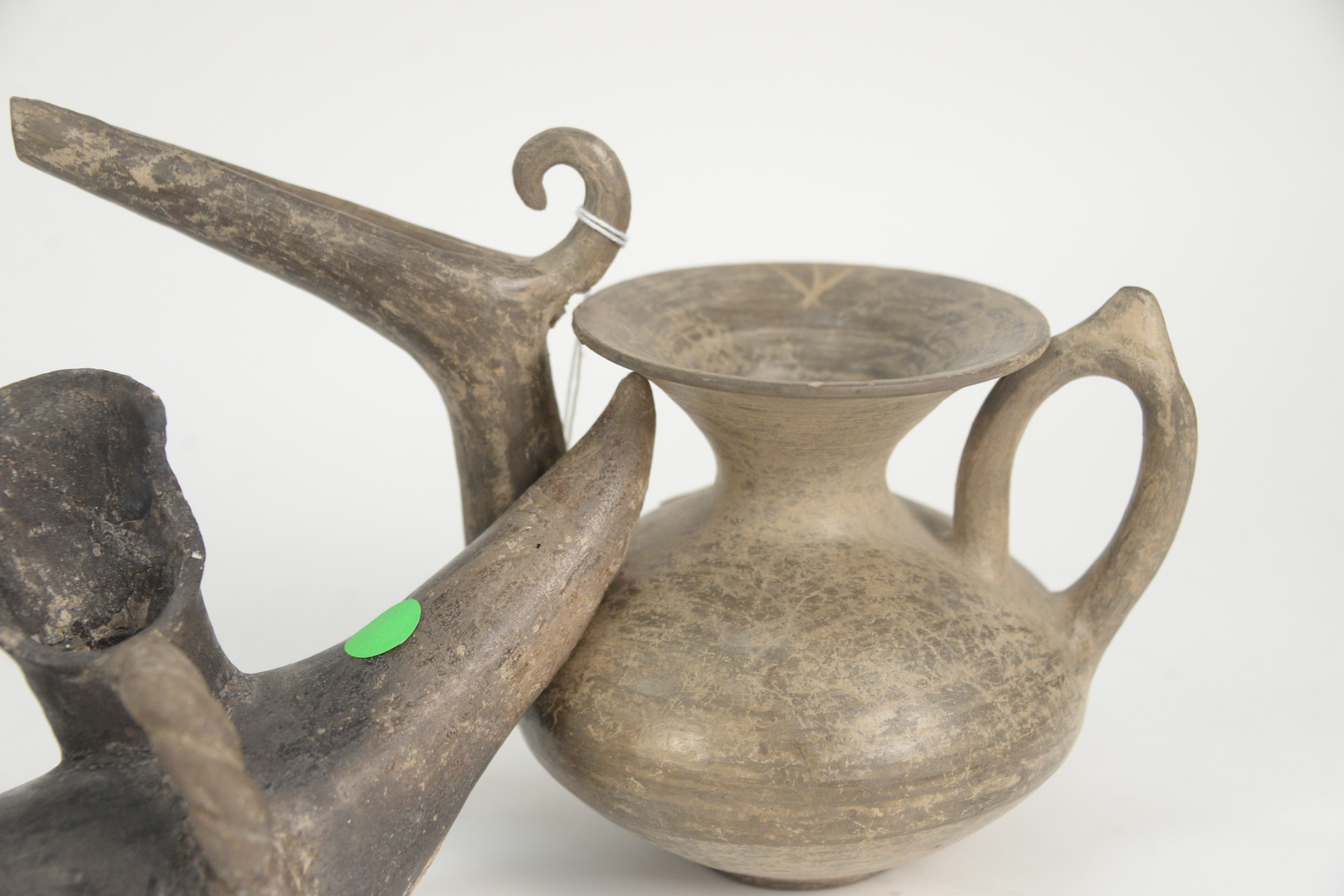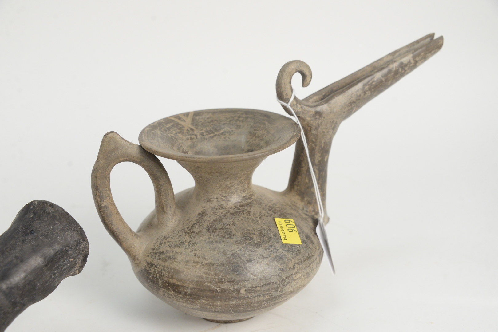 Lot 255: Two Ancient Grey Pottery Vessels, to include one having flared rim, long spout and handle, height 5 1/4 inches, length 9 1/2 inches along with a horn form vessel with spout and turned handle, height 7 1/4 inches, length 10 1/2 inches. Provenance: Pa