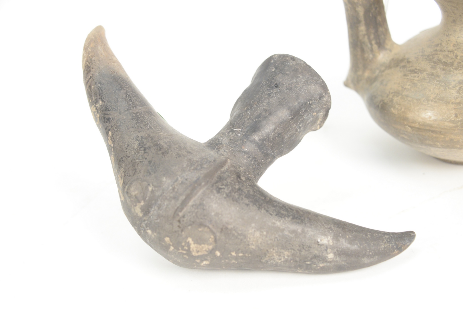 Two Ancient Grey Pottery Vessels, to include one having flared rim, long spout and handle, height 5 1/4 inches, length 9 1/2 inches along with a horn form vessel with spout and turned handle, height 7 1/4 inches, length 10 1/2 inches. Provenance: Part of Ariadne Galleries, New York collection, receipt from May 31, 1991.