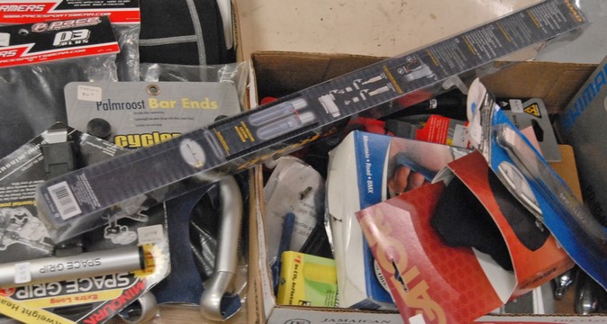 Lot 255: Two box lots of bike gear to include Top Peak pumps, Shimano R540, Thermal gear, chain cleaner, tools etc., approx. retail price 30…