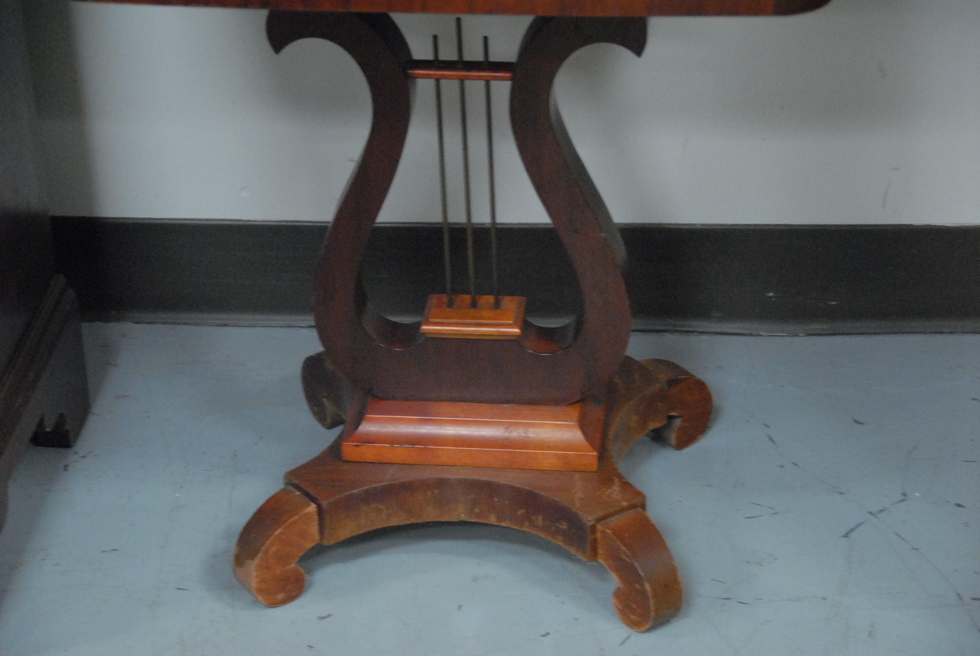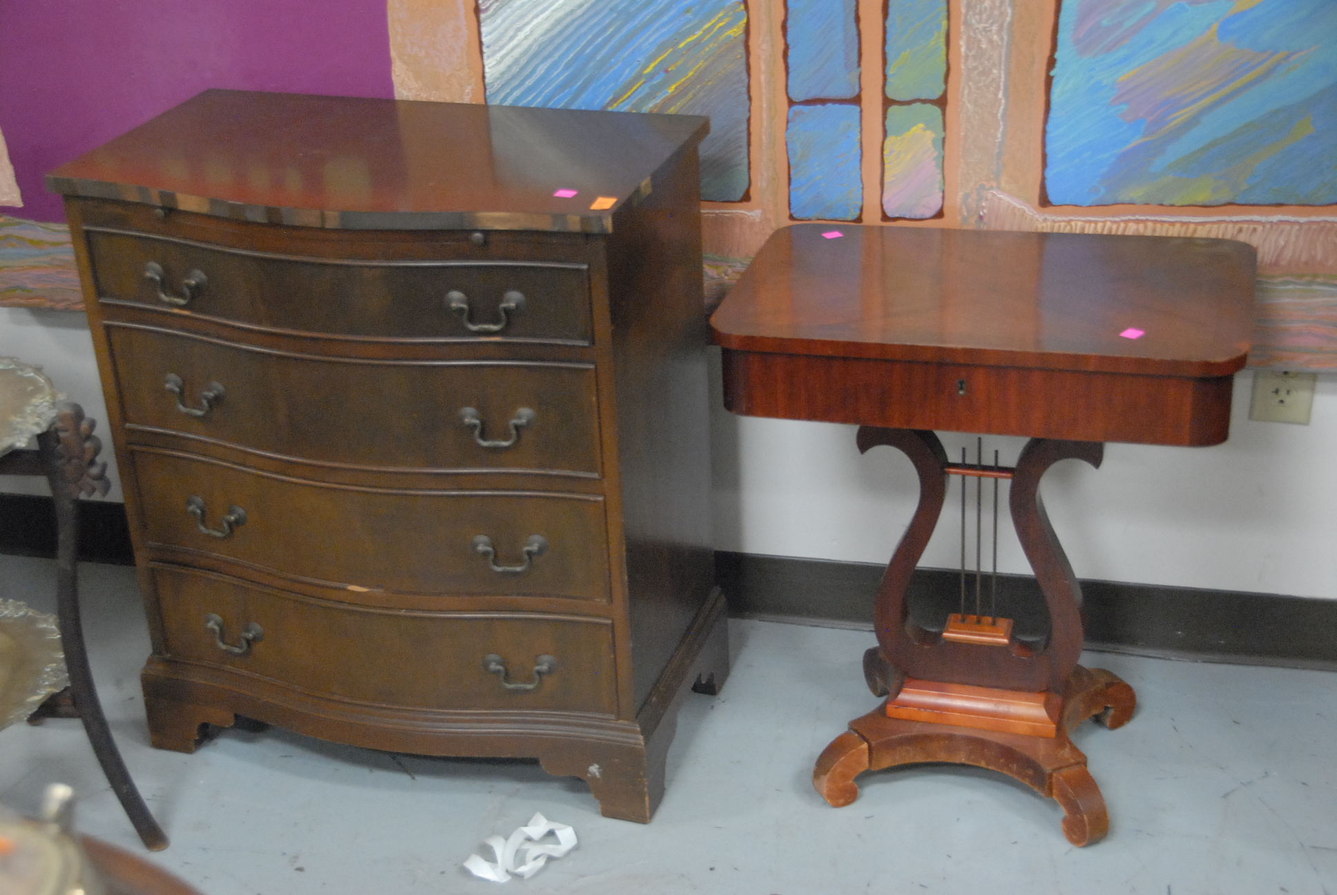 Lot 255: Two piece lot to include mahogany sewing table and mahogany small four drawer chest with slide veneer damage to chest.