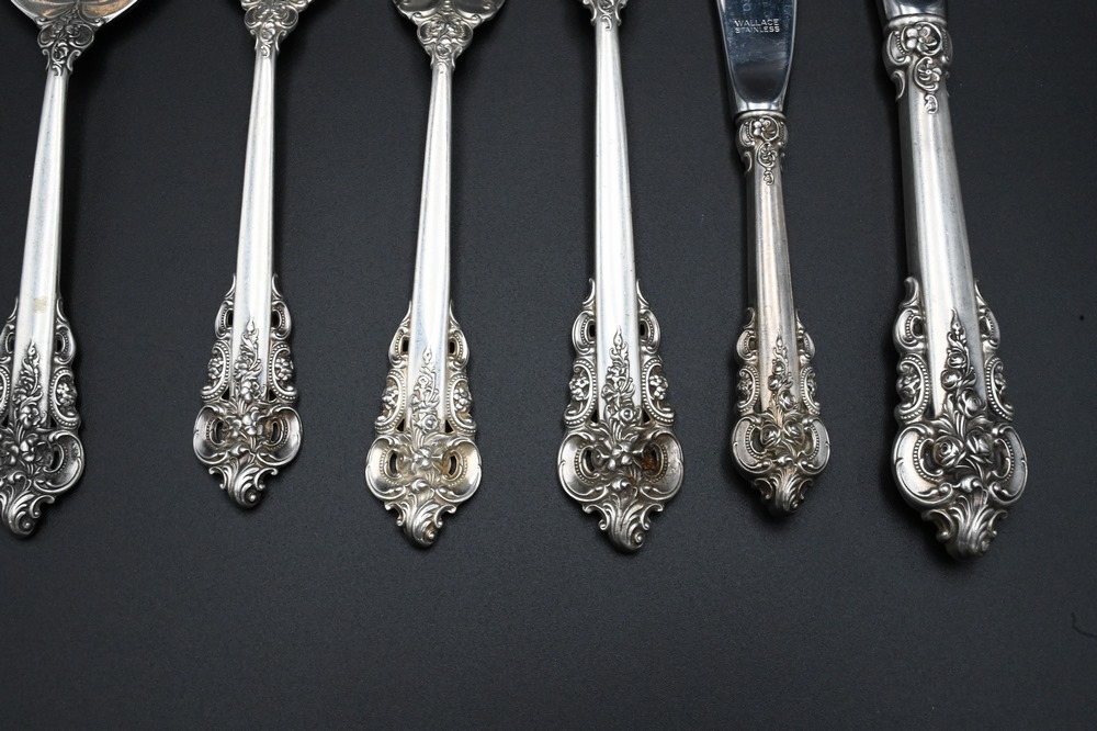 Lot 256: 90 Piece Wallace Grand Baroque Sterling Silver Flatware Set, to include 13 dinner forks, 13 salad forks, 1 cocktail fork, 18 teaspoo…