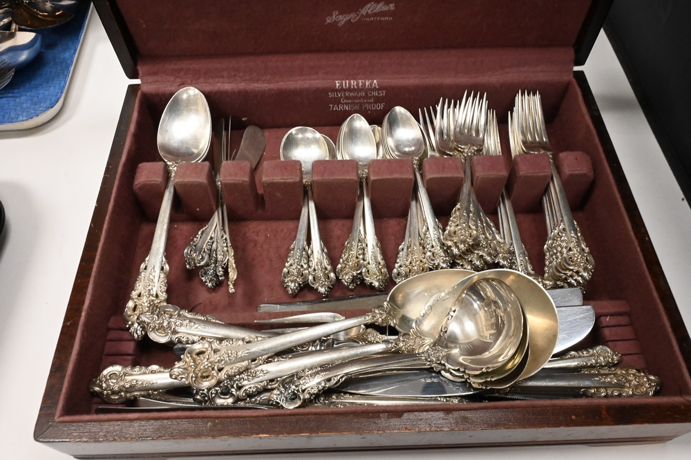 90 Piece Wallace Grand Baroque Sterling Silver Flatware Set, to include 13 dinner forks, 13 salad forks, 1 cocktail fork, 18 teaspoons, 6 soup spoons, 1 sugar spoon, 3 plating spoons, 1 pierced, 1 serving fork, 4 ladles, 4 serving pieces, 13 dinner knives, 8 weighted butter knives, 4 butter knives; marked Wallace Sterling, 105.6 t.oz. plus 27 weighted sterling handles.