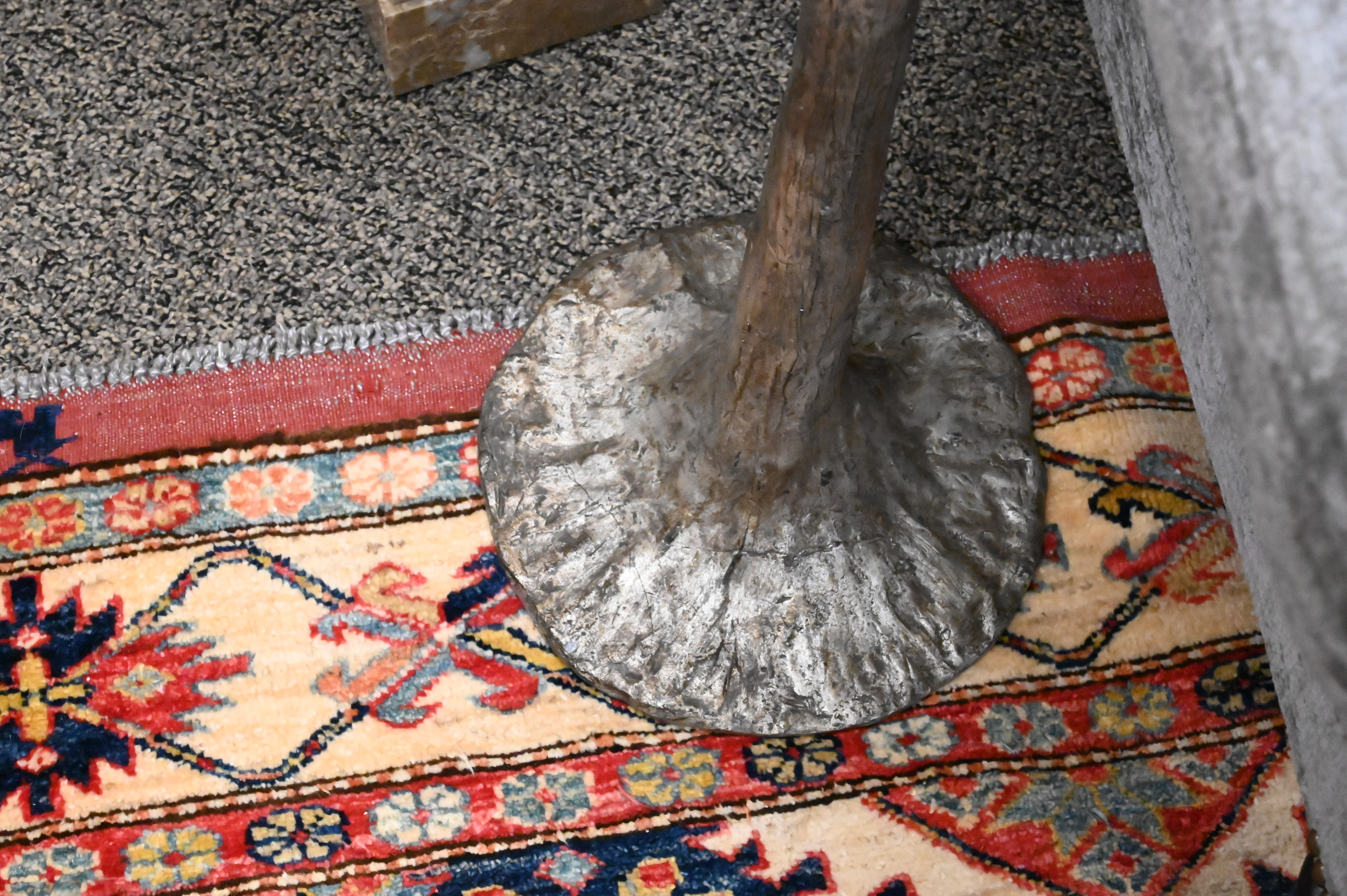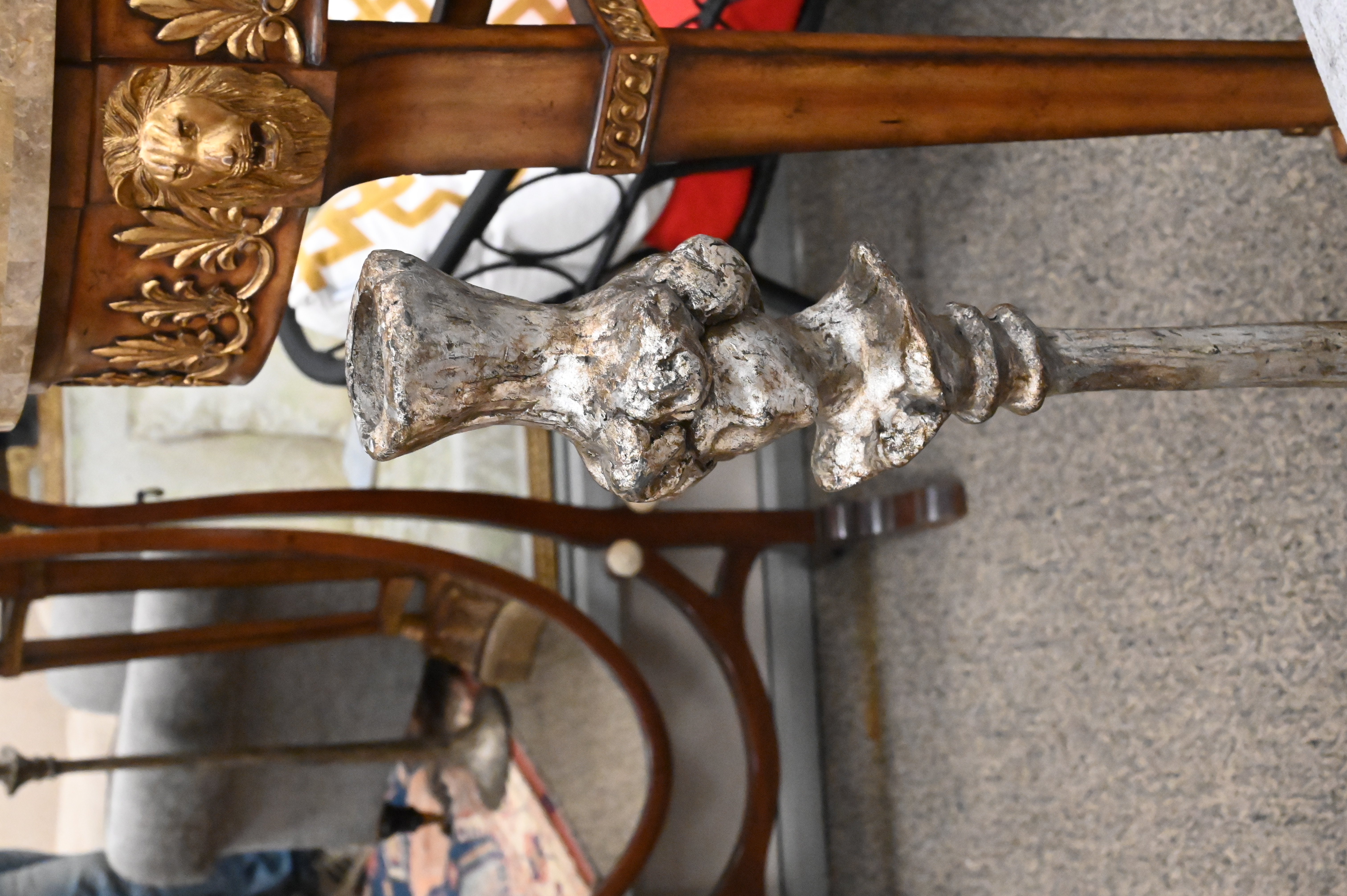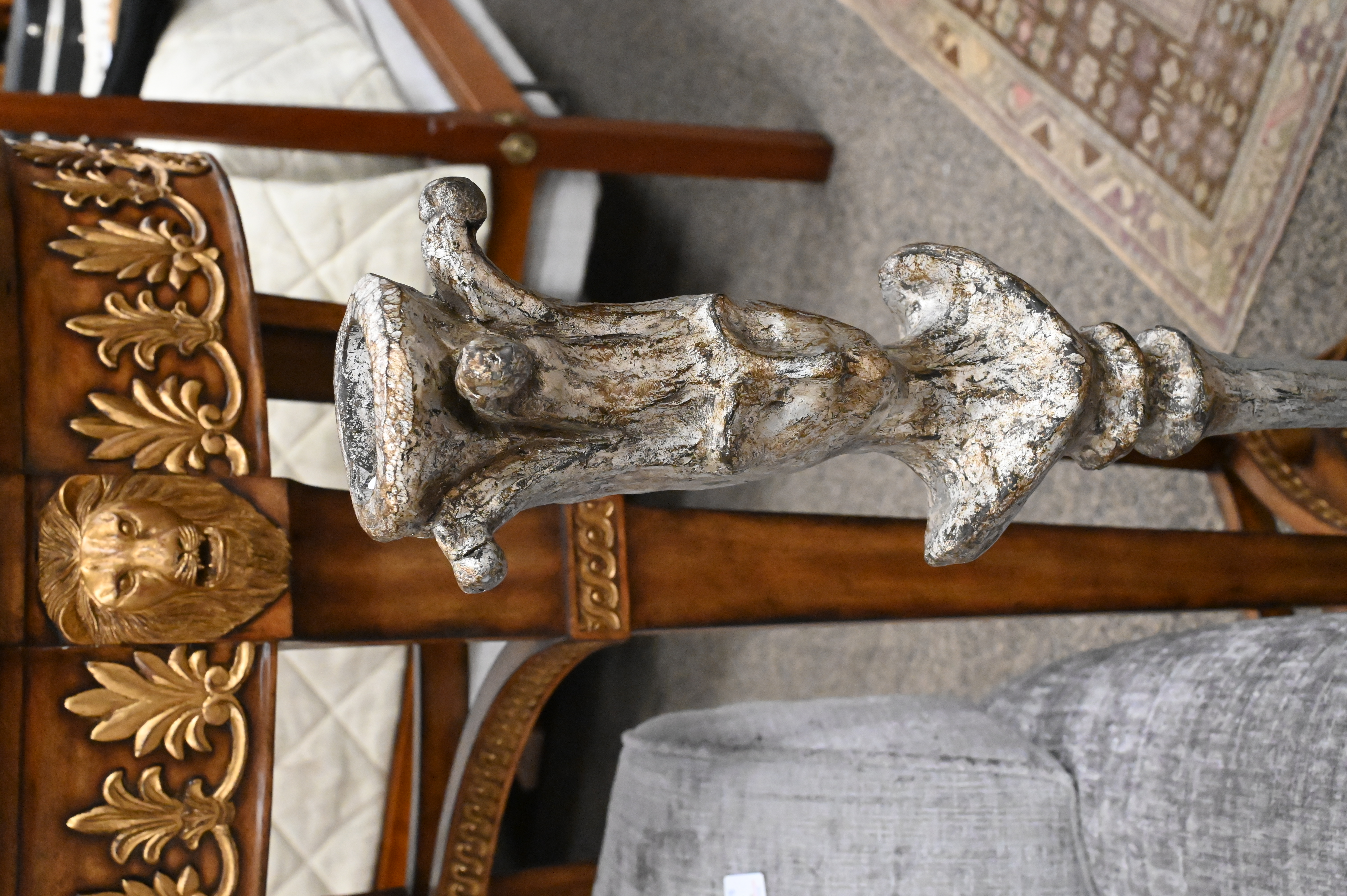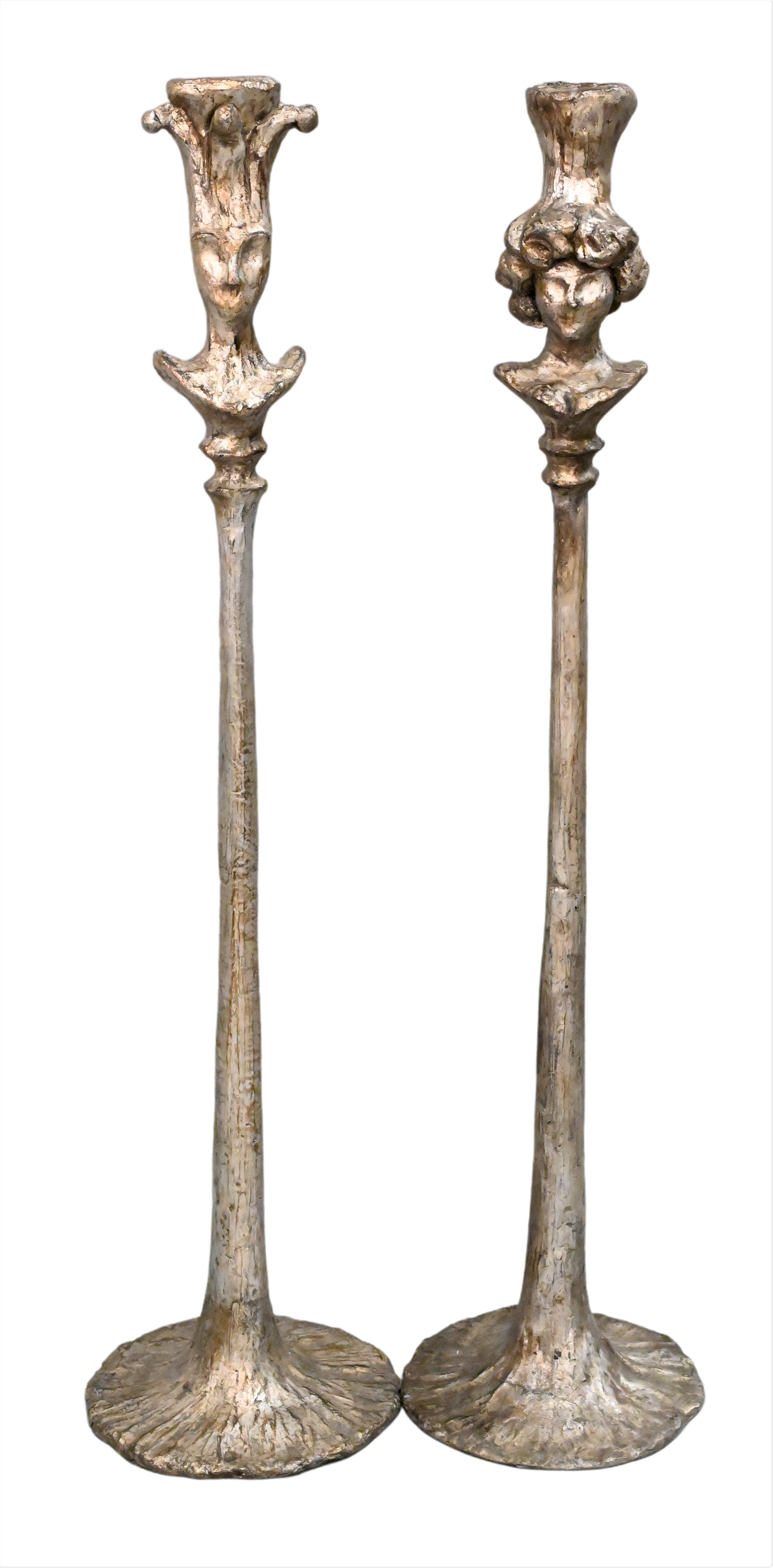A Pair of Giacometti Style Monumental Candlesticks, one having bust of a jester, the other having bust of a woman at top of candlestick, height 43 inches.