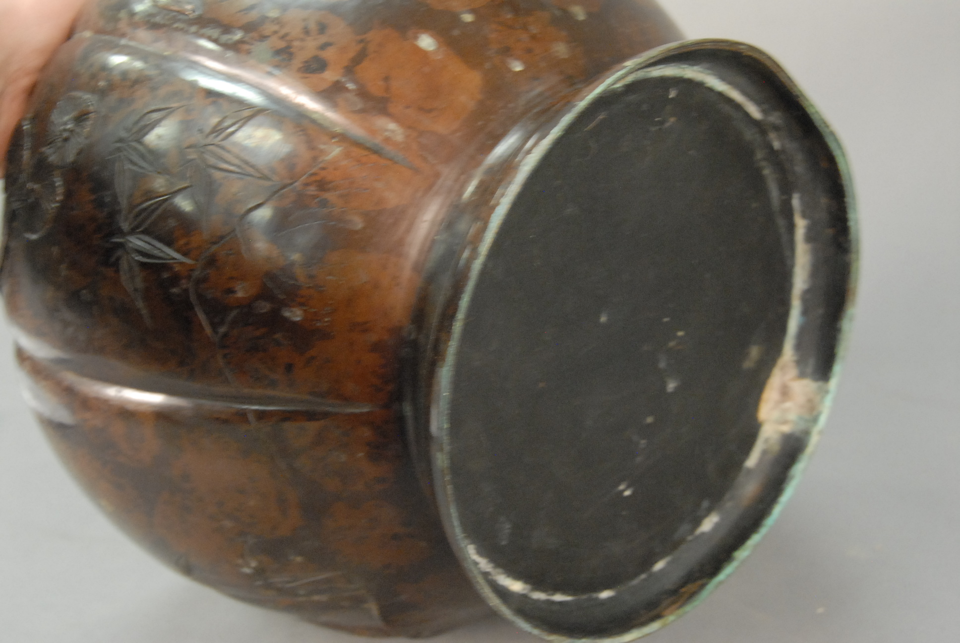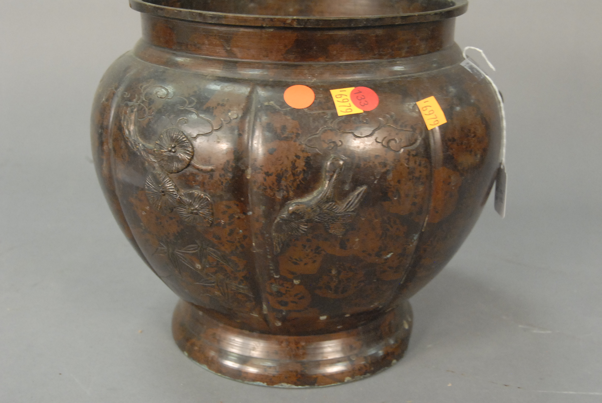 Lot 256: Bronze lobed jardinire on raised cylindrical foot and decorated with an eagle/hawk in high relief, Japan, 19th/20th century. ht. 12in. dia. 13in.
