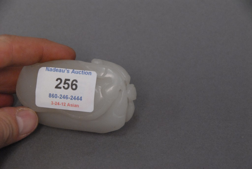 Carved white jade double eggplant with carved stem and lingzhi mushroom on the side, ht. 3.