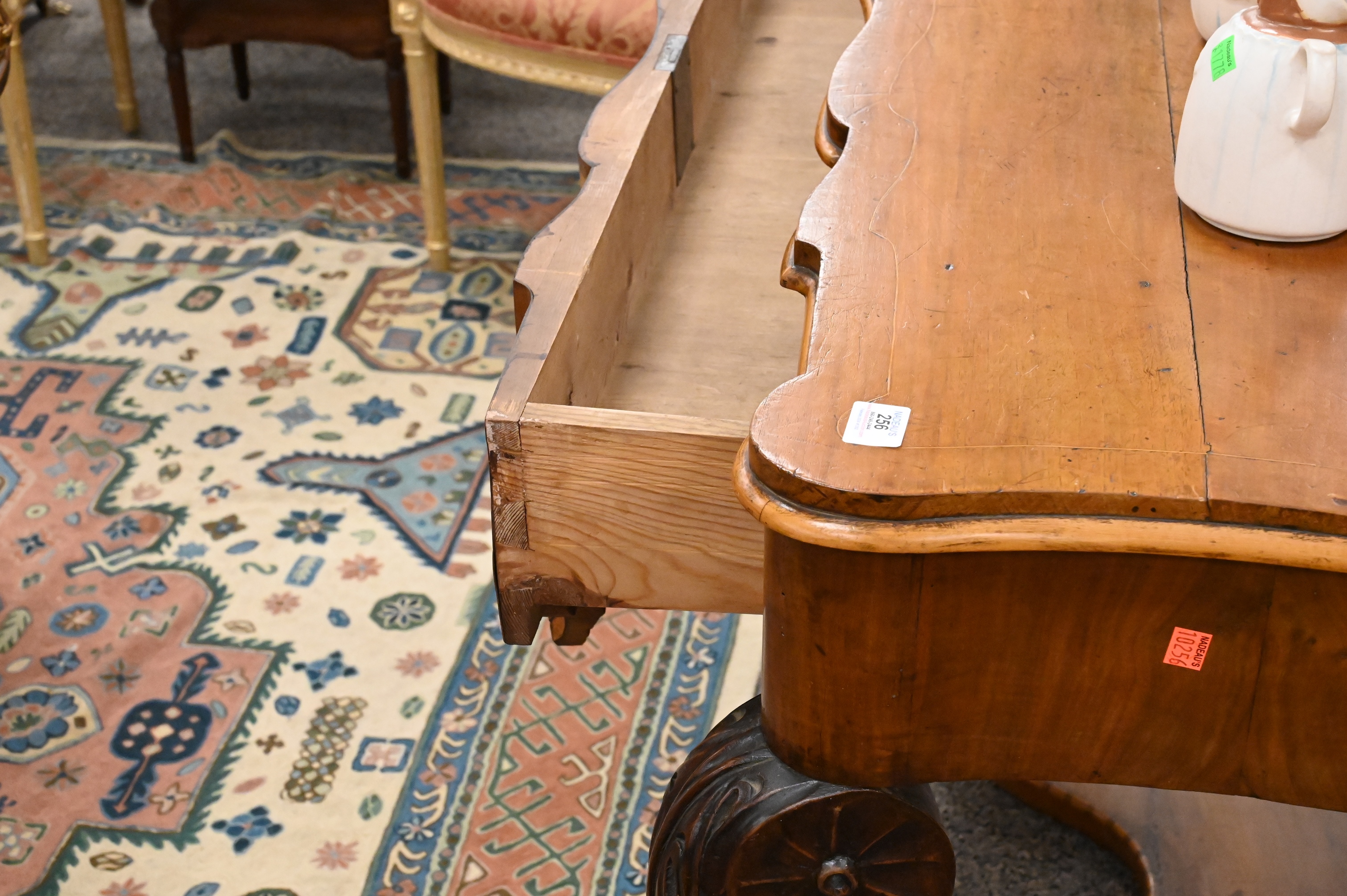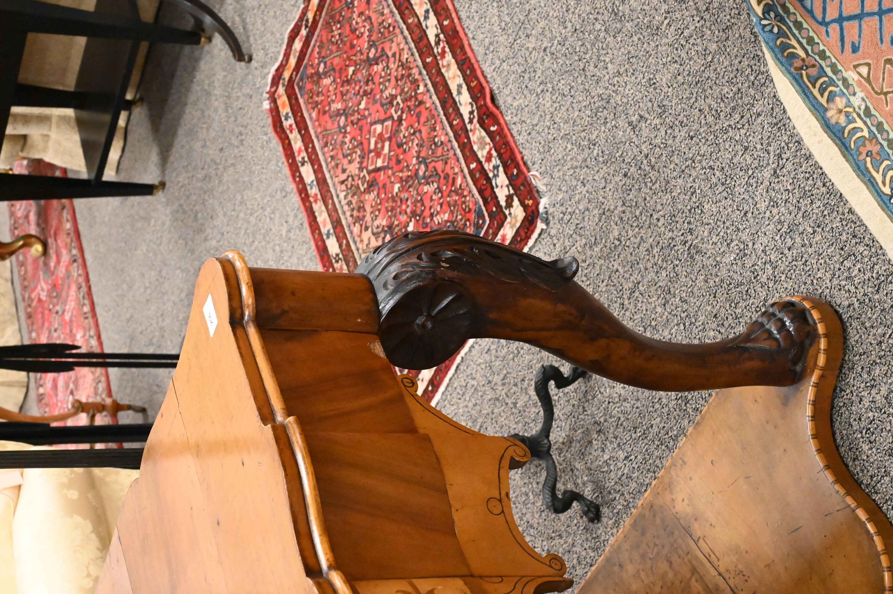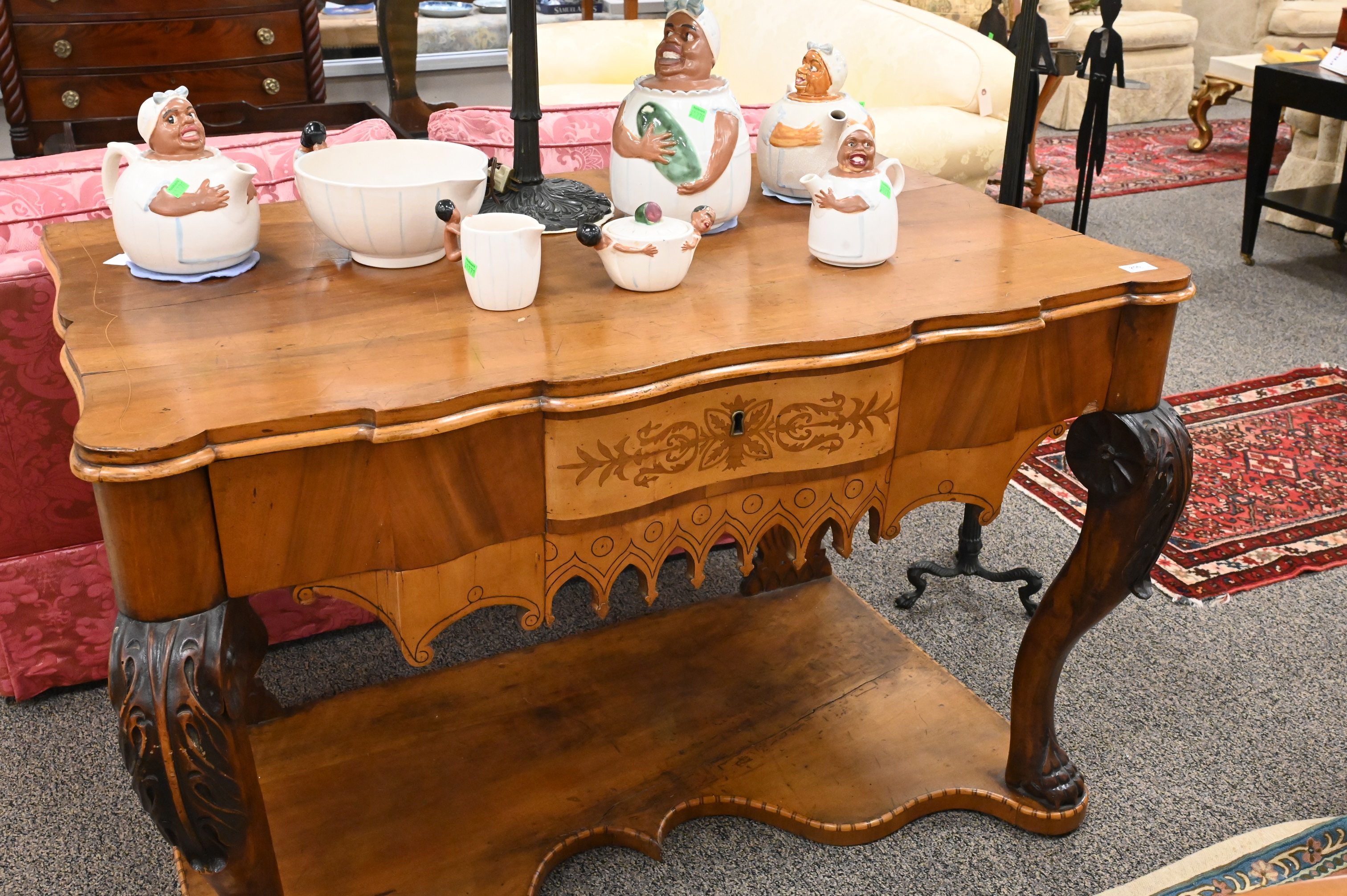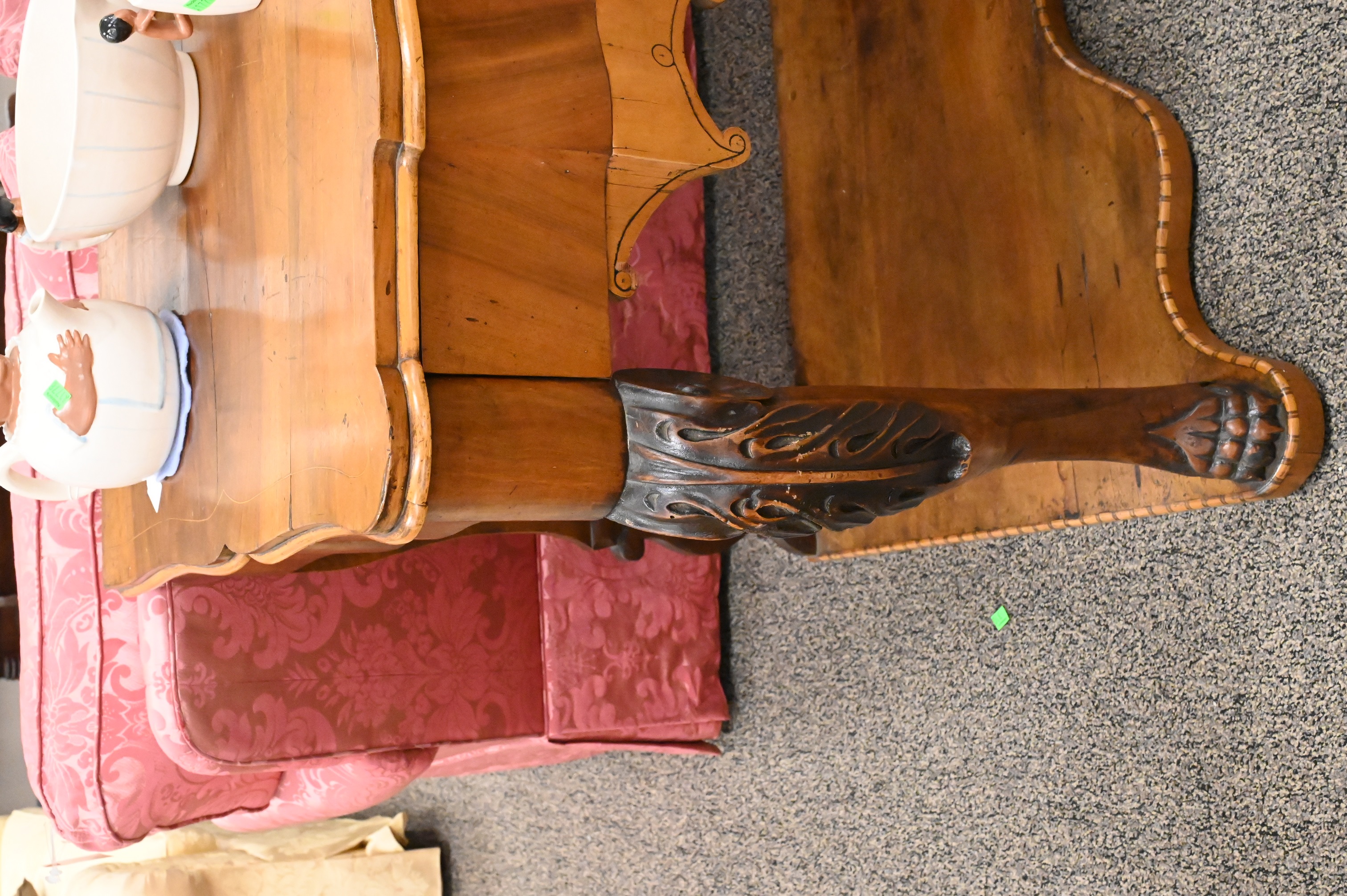 having shaped top over large single drawer with carved frieze set on two front cabriole legs ending in inlaid base